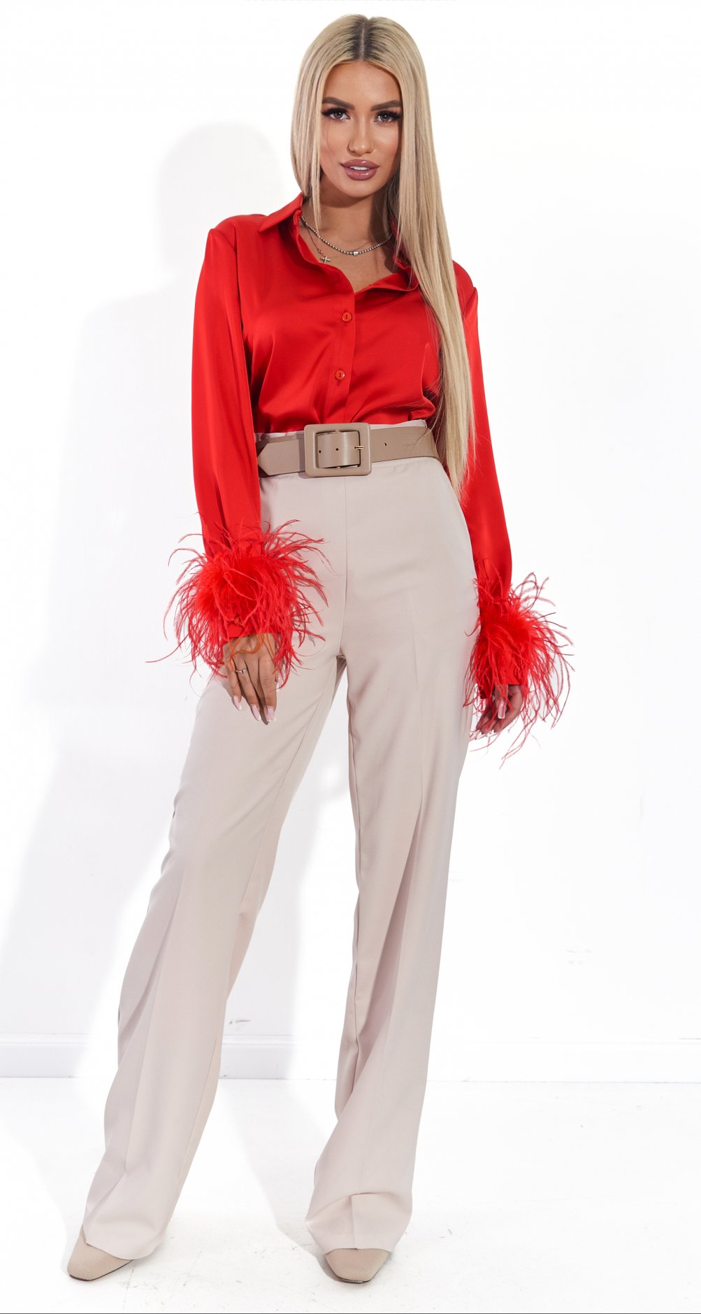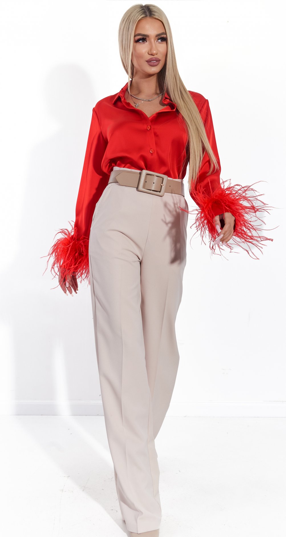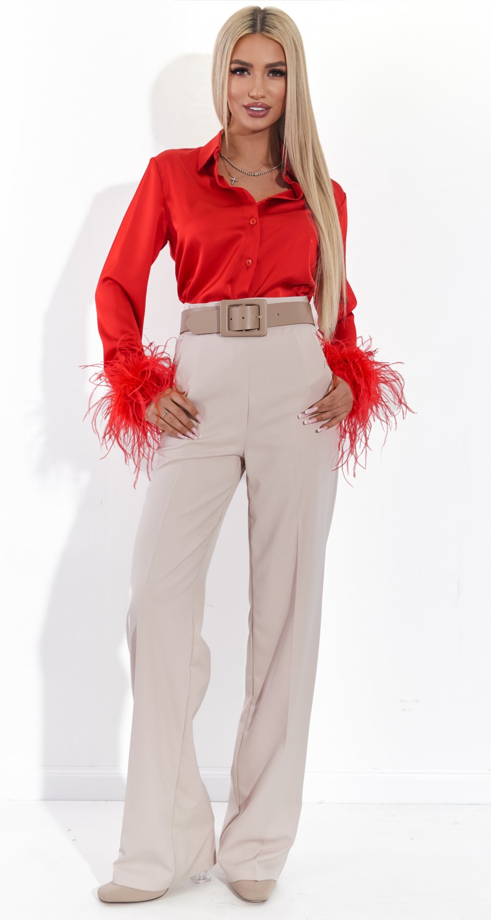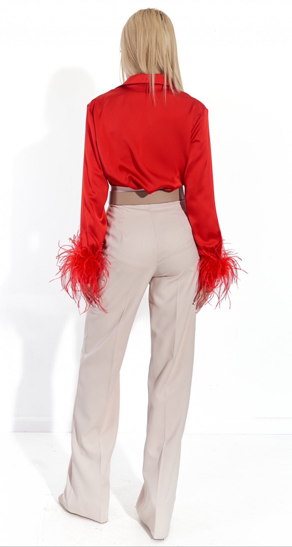 Розкішна червона шовкова блузка – втілення елегантності та витонченого стилю. Вишуканий матеріал з благородним блиском підкреслює жіночність, а акцентні манжети, прикрашені знімними пір'ям страуса, додають образу гламуру і легкості.