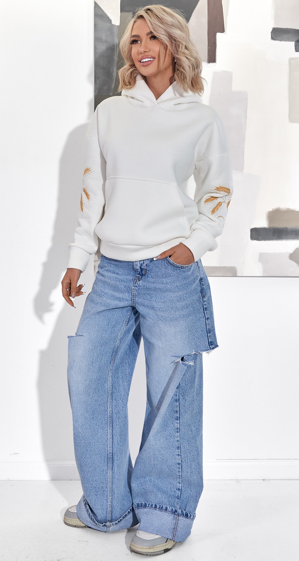 ​Идеальный Крой: Свободный оверсайз крой дарит комфорт и свободу движений, а глубокий капюшон защитит от ветра. Худи отлично сочетается с джинсами, как на фото (особенно с трендовыми широкими моделями!), юбками и спортивными брюками.