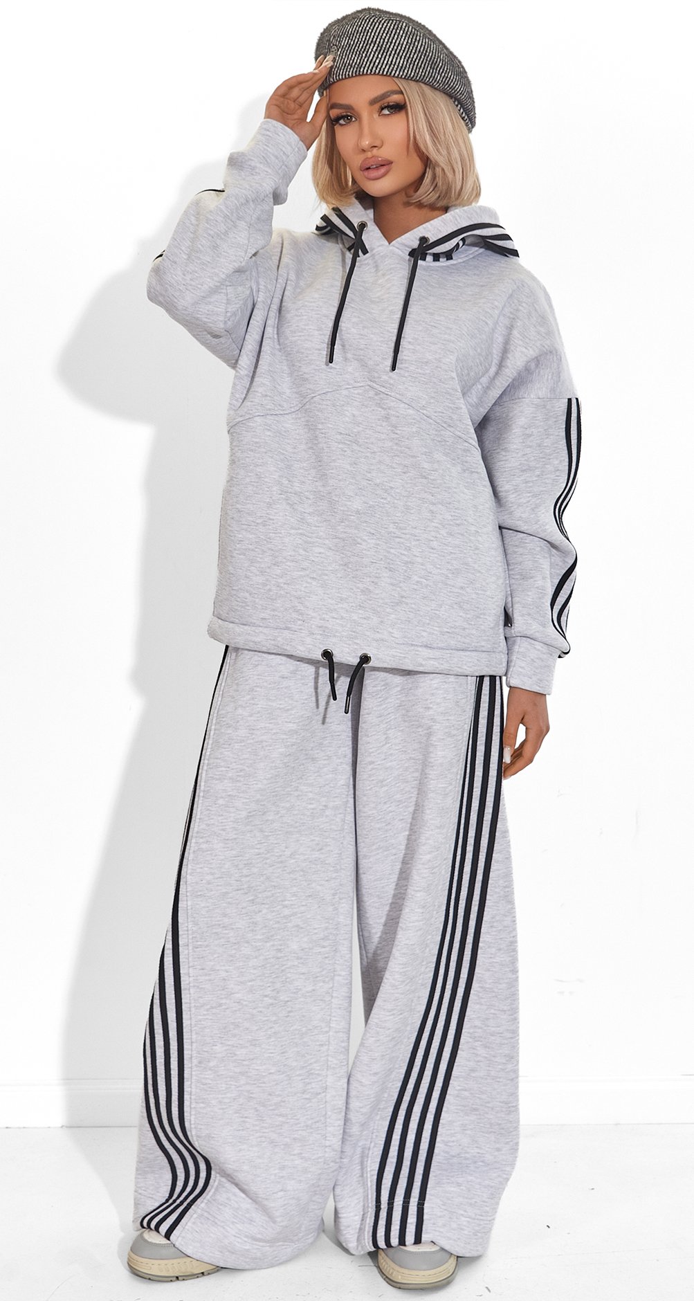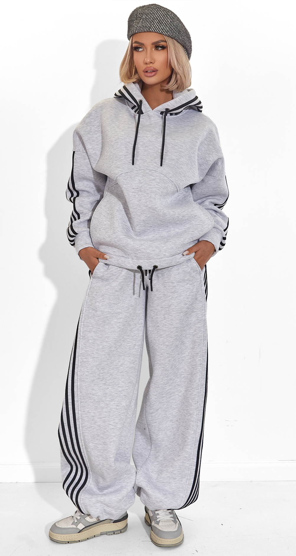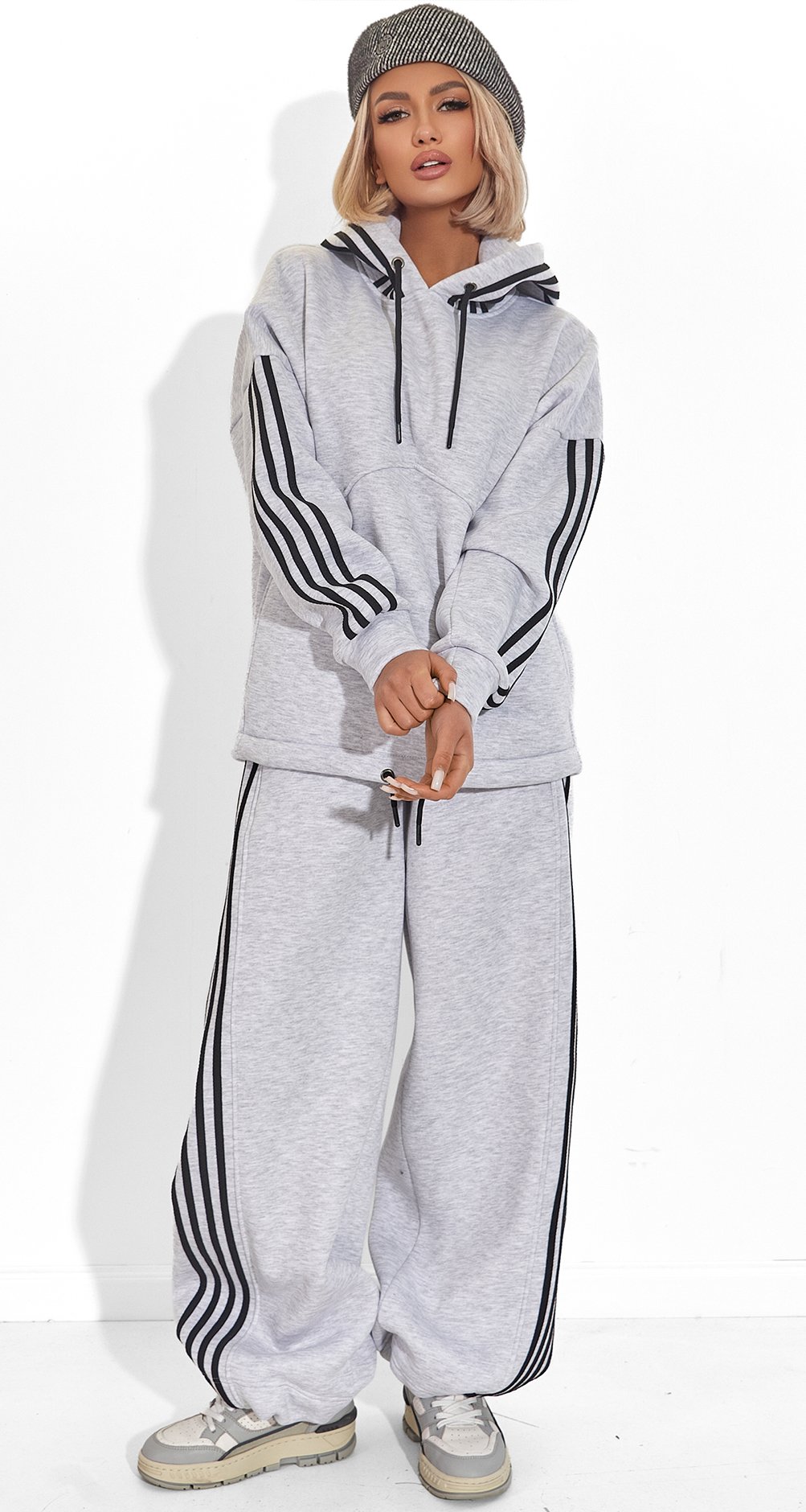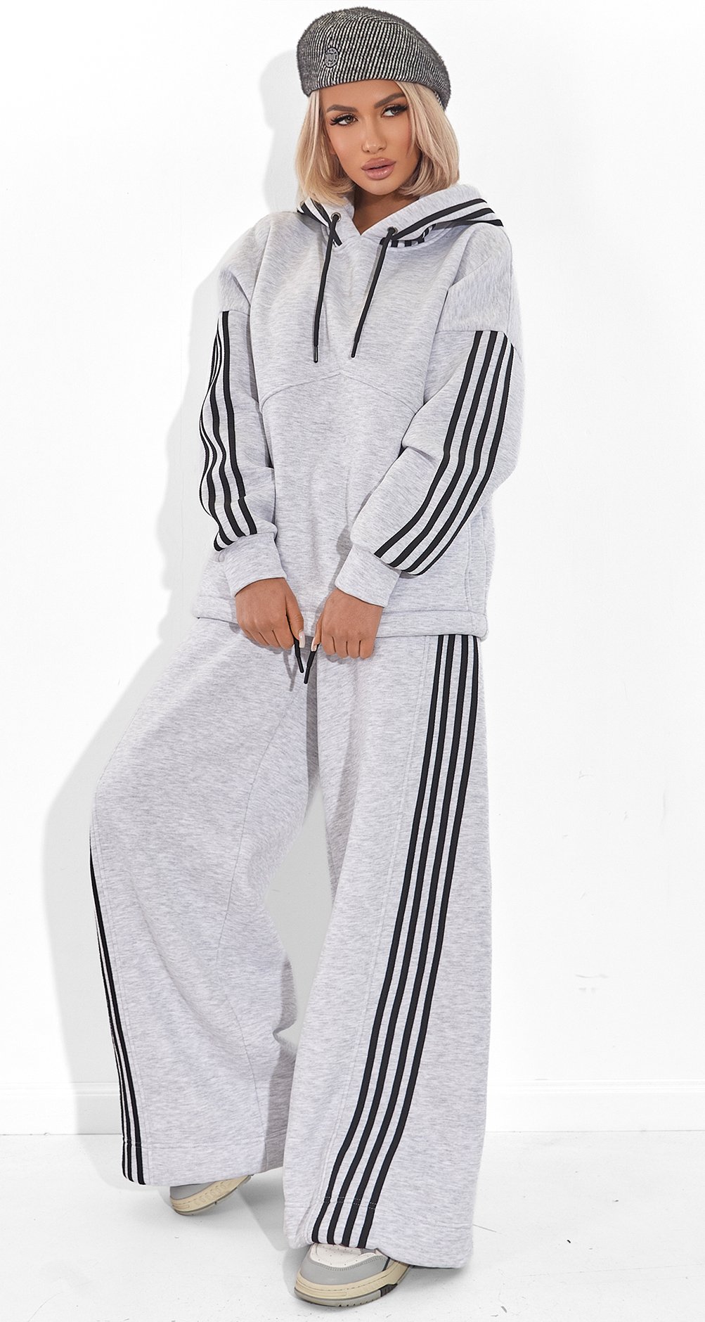 Спортивный Шик: Контрастные черные лампасы и глубокий капюшон, выполненный в основной ткани (серый), создают чистый, графичный образ. Это классика, которая никогда не выйдет из моды.