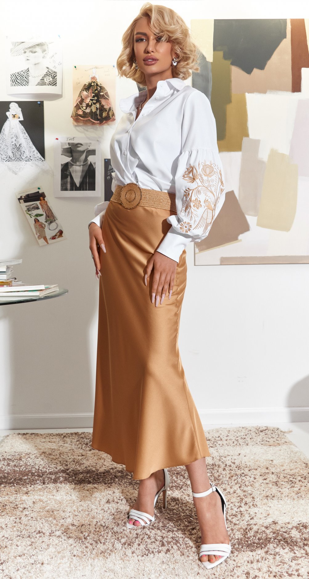 Эта стильная блузка создана для тех, кто ценит уникальность и качество. Ее классический белый цвет дарит универсальность, позволяя легко сочетать ее как с деловым костюмом, так и с повседневными джинсами или модной юбкой (как на фото!). Но настоящая изюминка – это, безусловно, красивая вышивка на рукавах. Детализированные узоры в золотисто-коричневых тонах придают этой женской блузке неповторимый шарм и благородство.