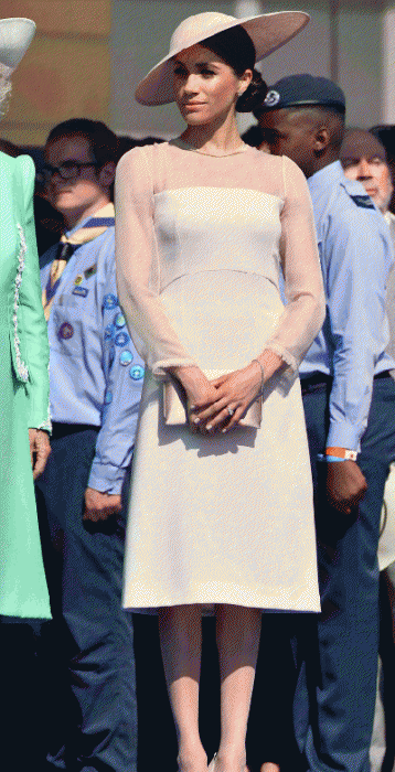 Влияние Маркл на королевскую семью уже очевидно, и сегодняшний ансамбль намекает на ее растущую уверенную адаптацию в новом королевском окружении. Мэган с легкостью дополнила свое платье, требуемые королевским этикетом прозрачными колготками, которые герцогиня искусно подчеркнула туфлями на шпильке от Тамары Меллон. В тон платью подобранные шляпа и клатч завершили внешний вид герцогини в королевском стиле.