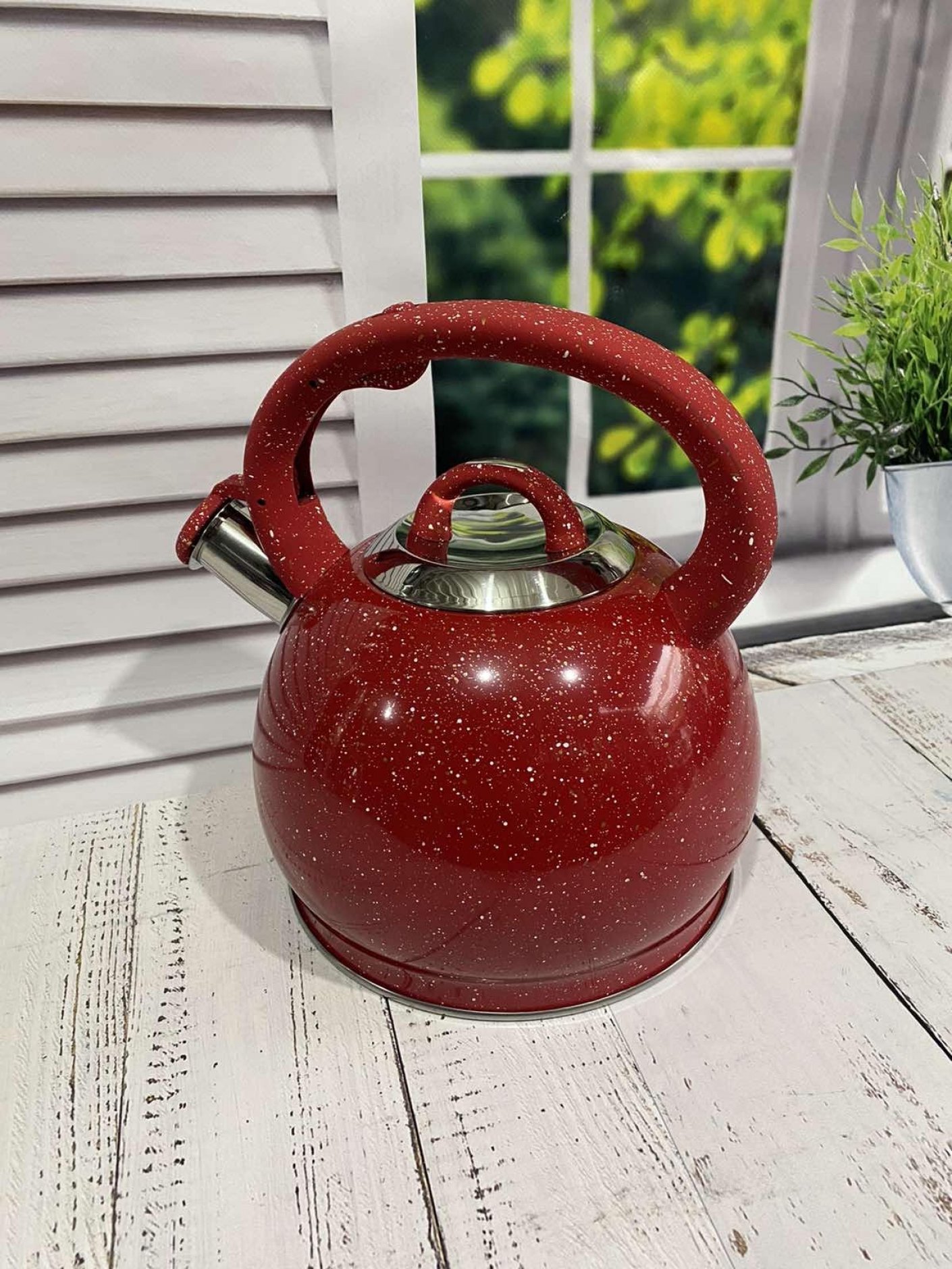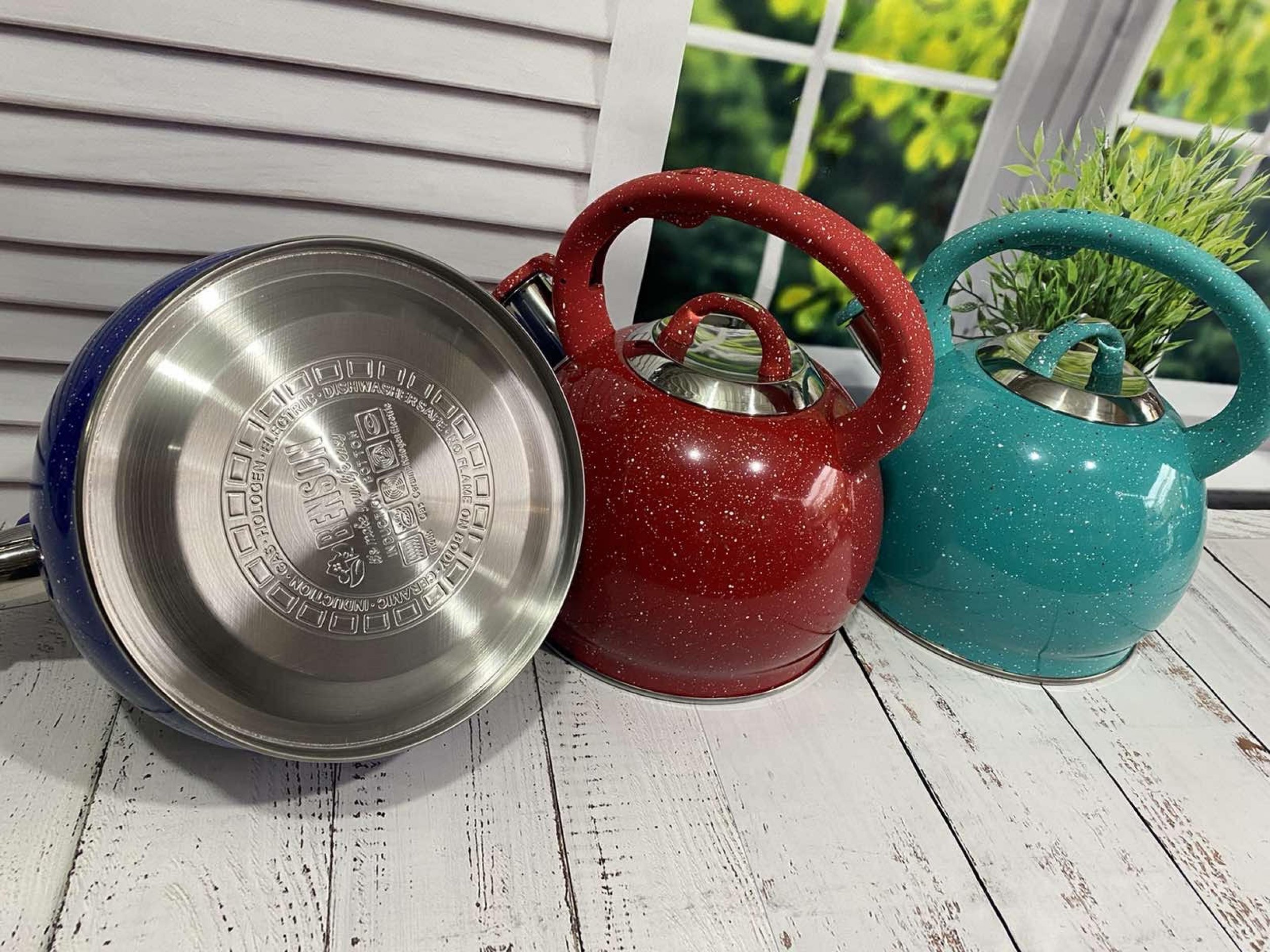 Чайник также оснащен свистком для оповещения о закипании воды. Герметичная крышка не пропускает пар, поэтому вода долго остается горячей. Прочное дно обеспечивает равномерное распределение тепла.