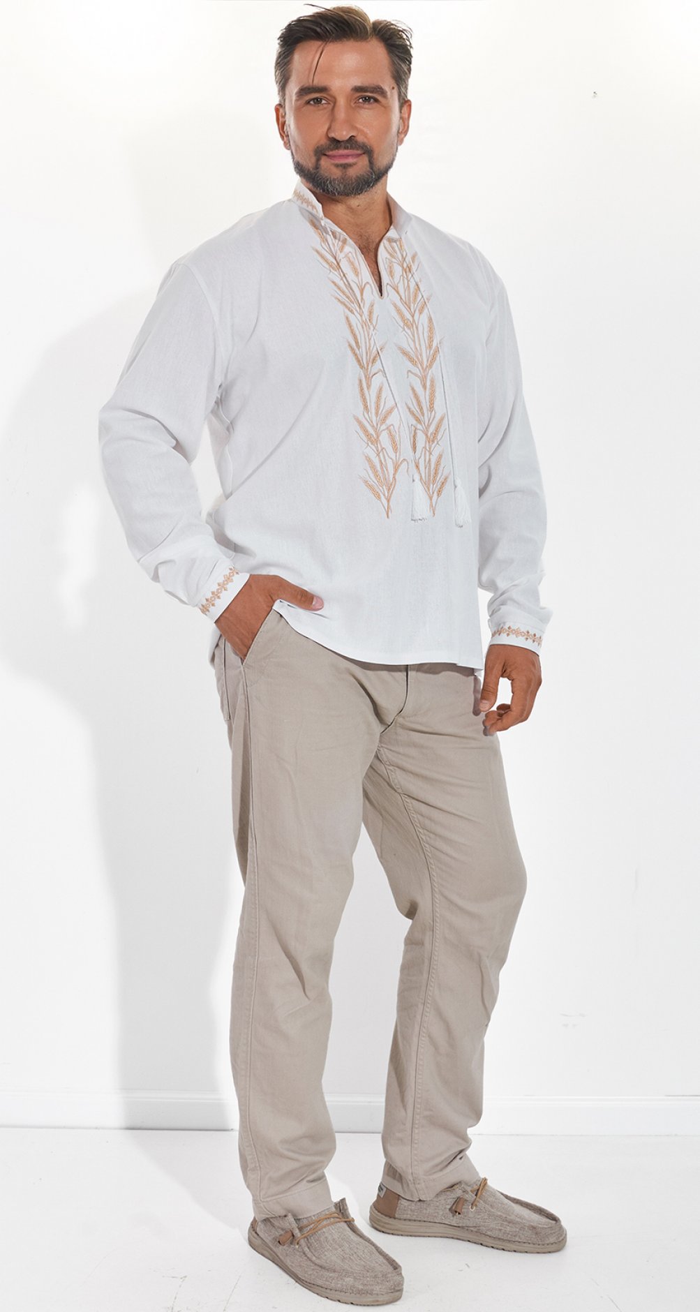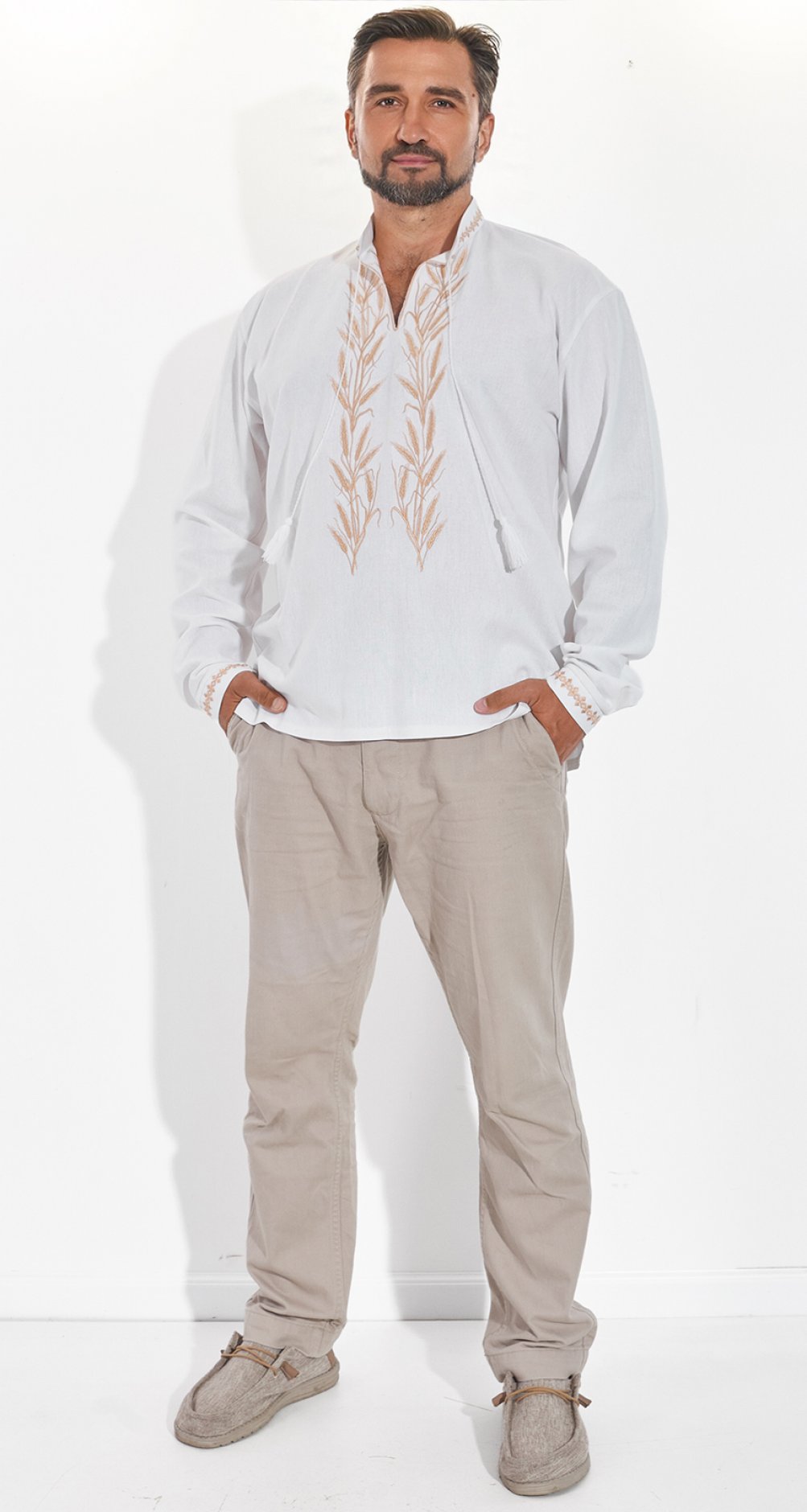 * Изысканный дизайн: Центральным элементом вышиванки является машинная вышивка в виде колосьев пшеницы. Этот традиционный узор символизирует плодородие, богатство и благополучие, привнося глубокий смысл в ваш образ.