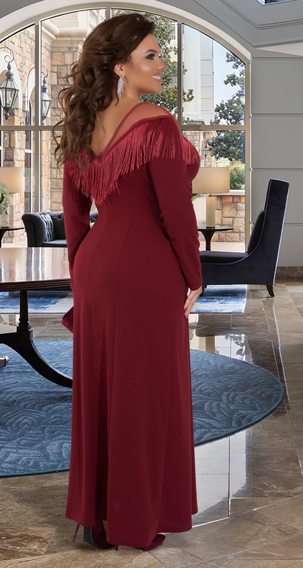 Декольте выполнено из нарядной сеточки и отделано красивой бахромой! Это сразу превращает образ в вечерний!