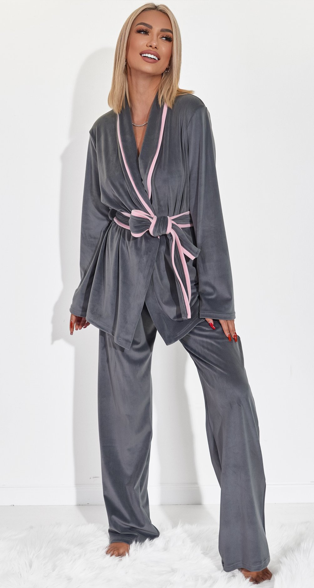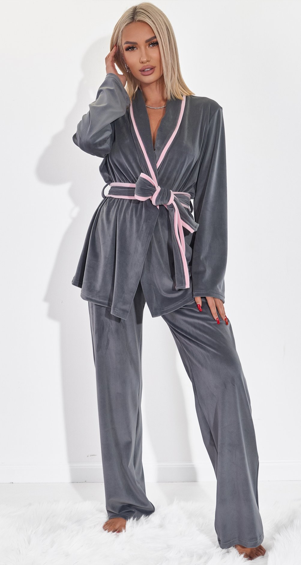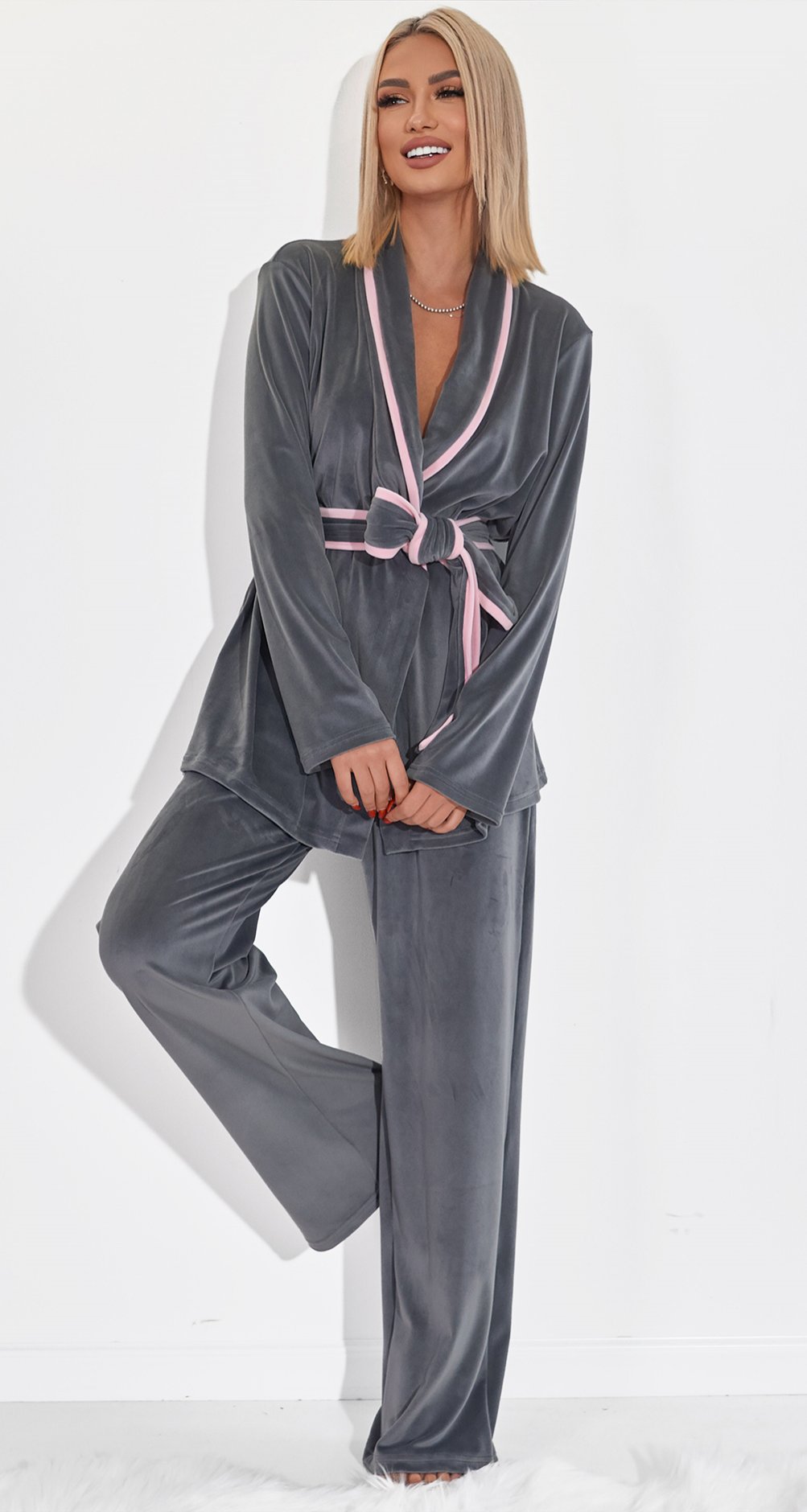 ​Безупречный Стиль: Комплект, состоящий из струящихся брюк с удобным поясом на резинке и элегантного халата-кимоно с контрастными деталями и поясом, подчеркнет вашу женственность даже дома.