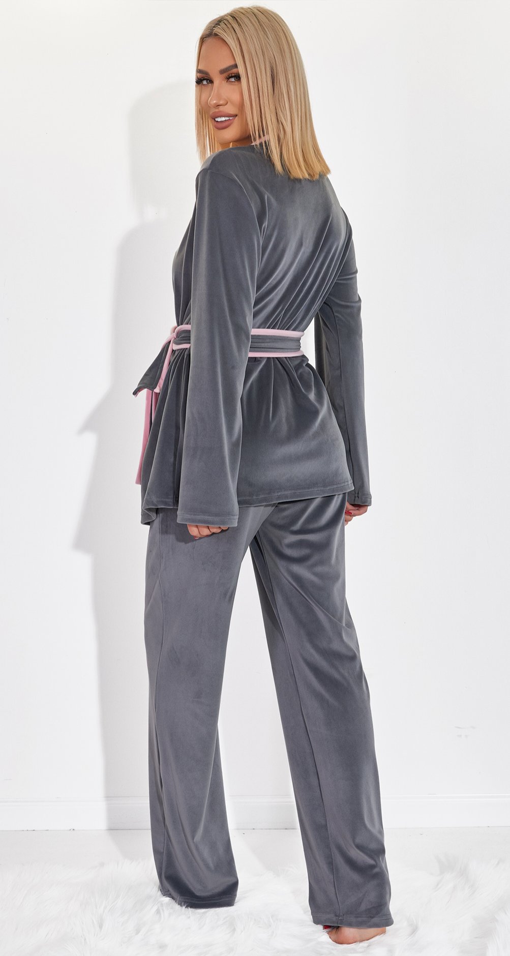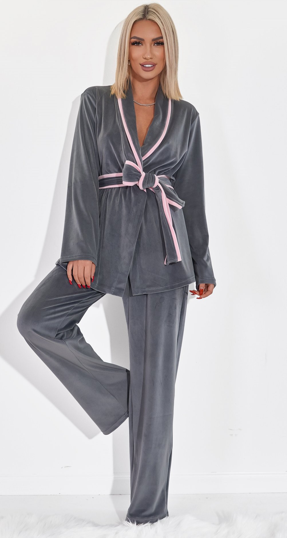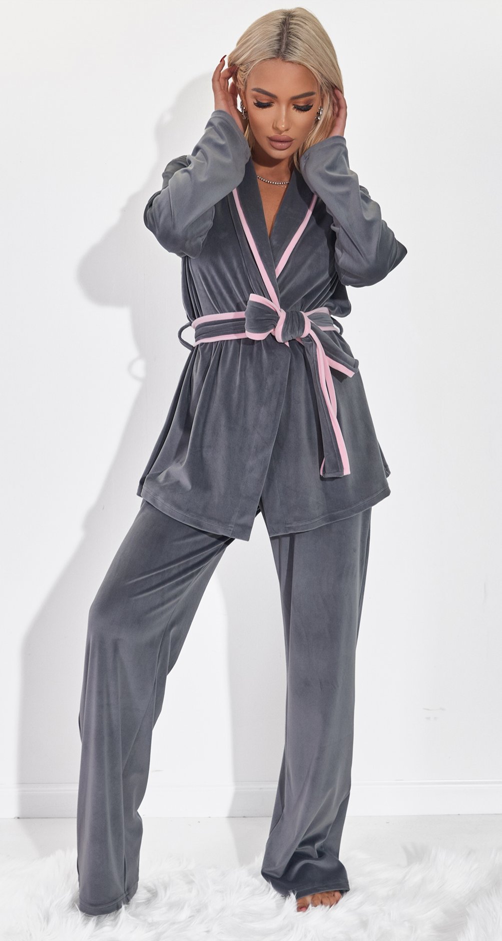 ​Безупречный Стиль: Комплект, состоящий из струящихся брюк с удобным поясом на резинке и элегантного халата-кимоно с контрастными деталями и поясом, подчеркнет вашу женственность даже дома.