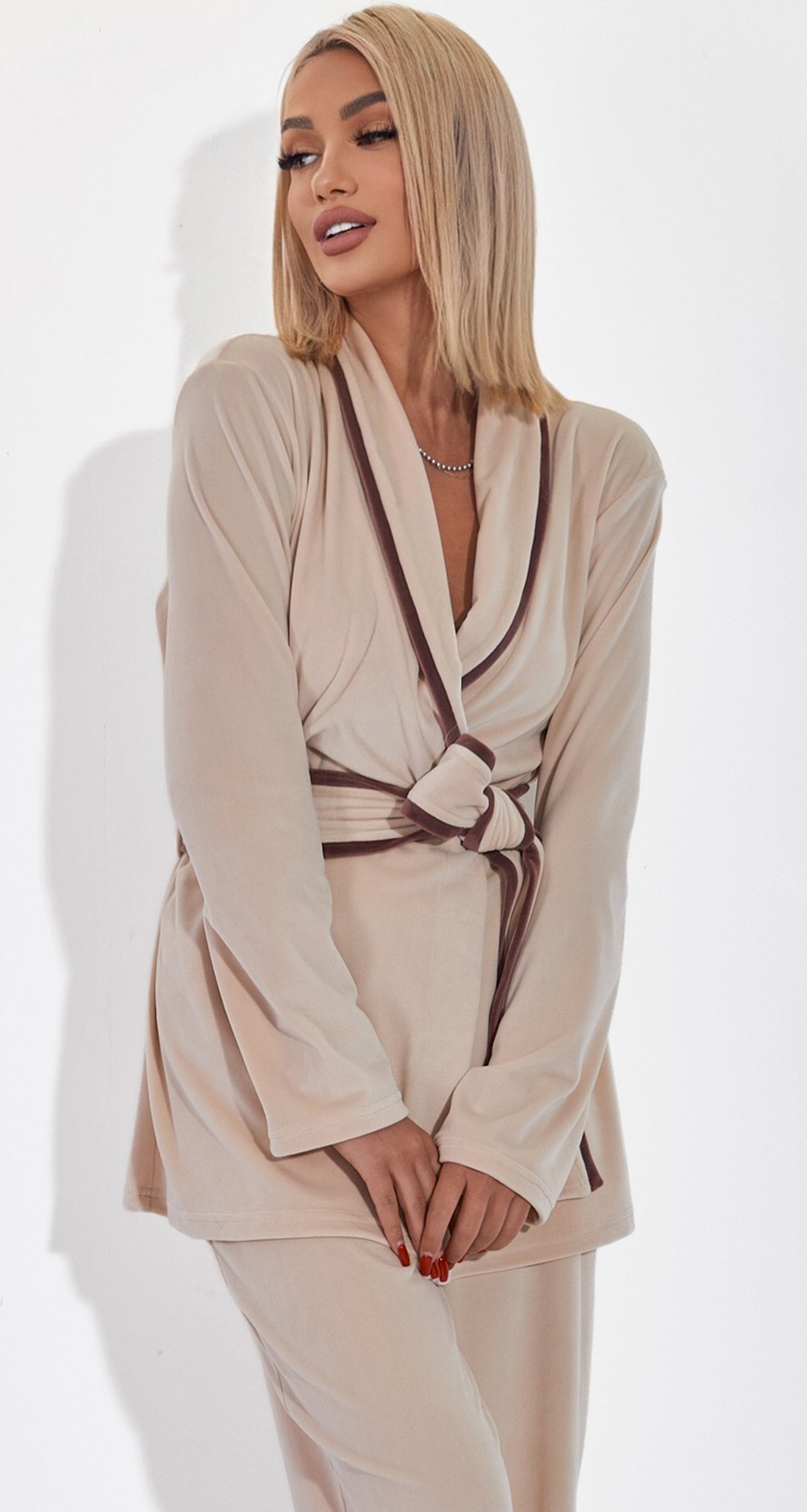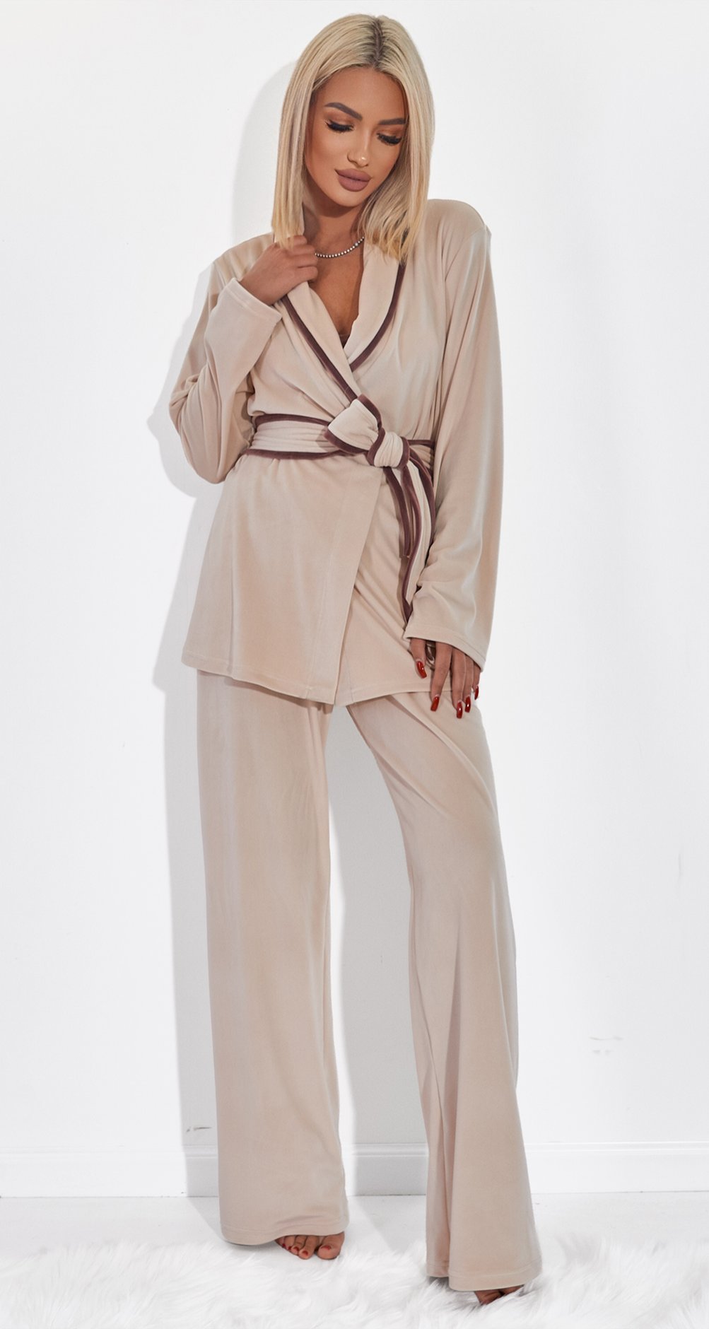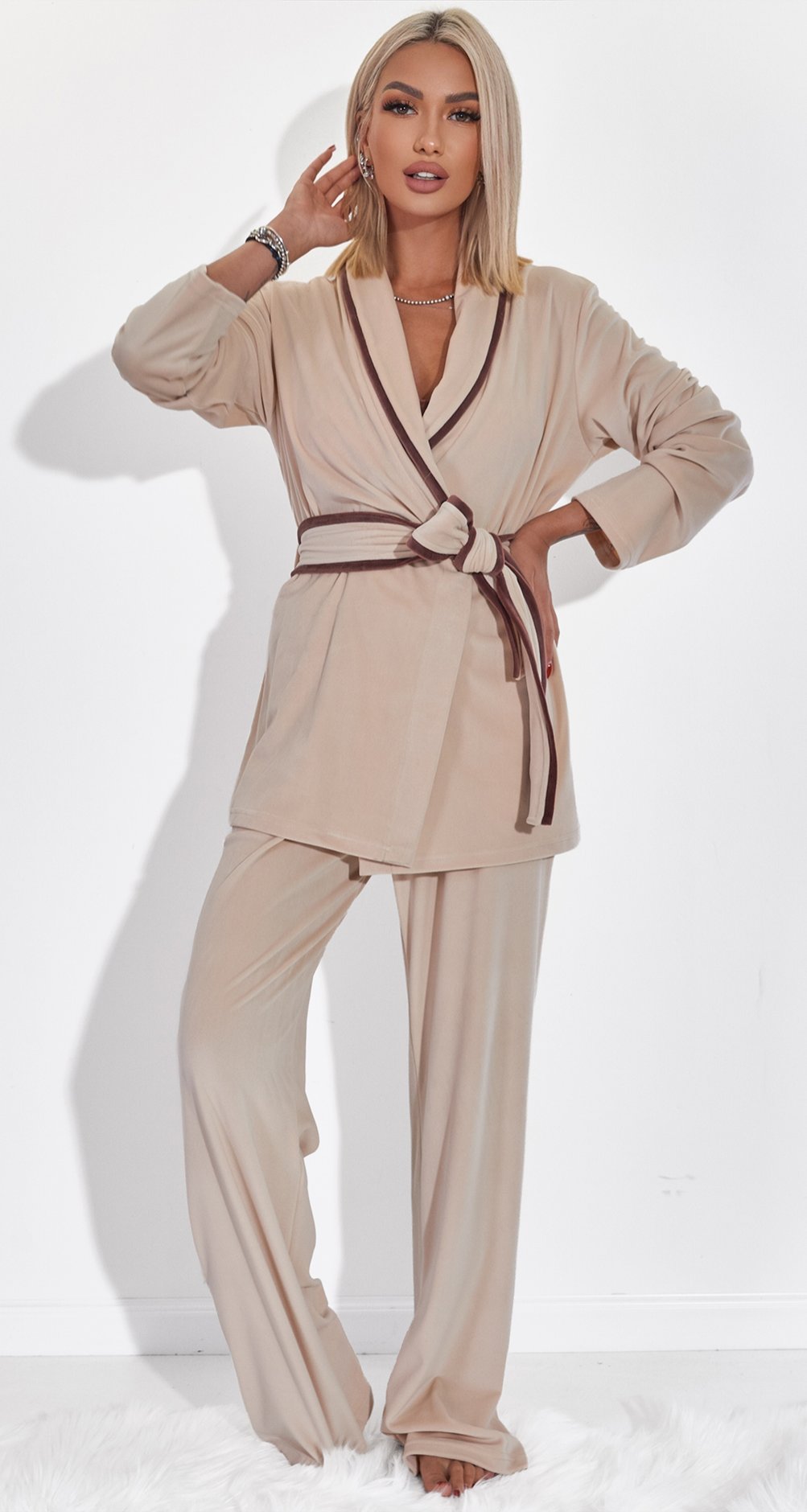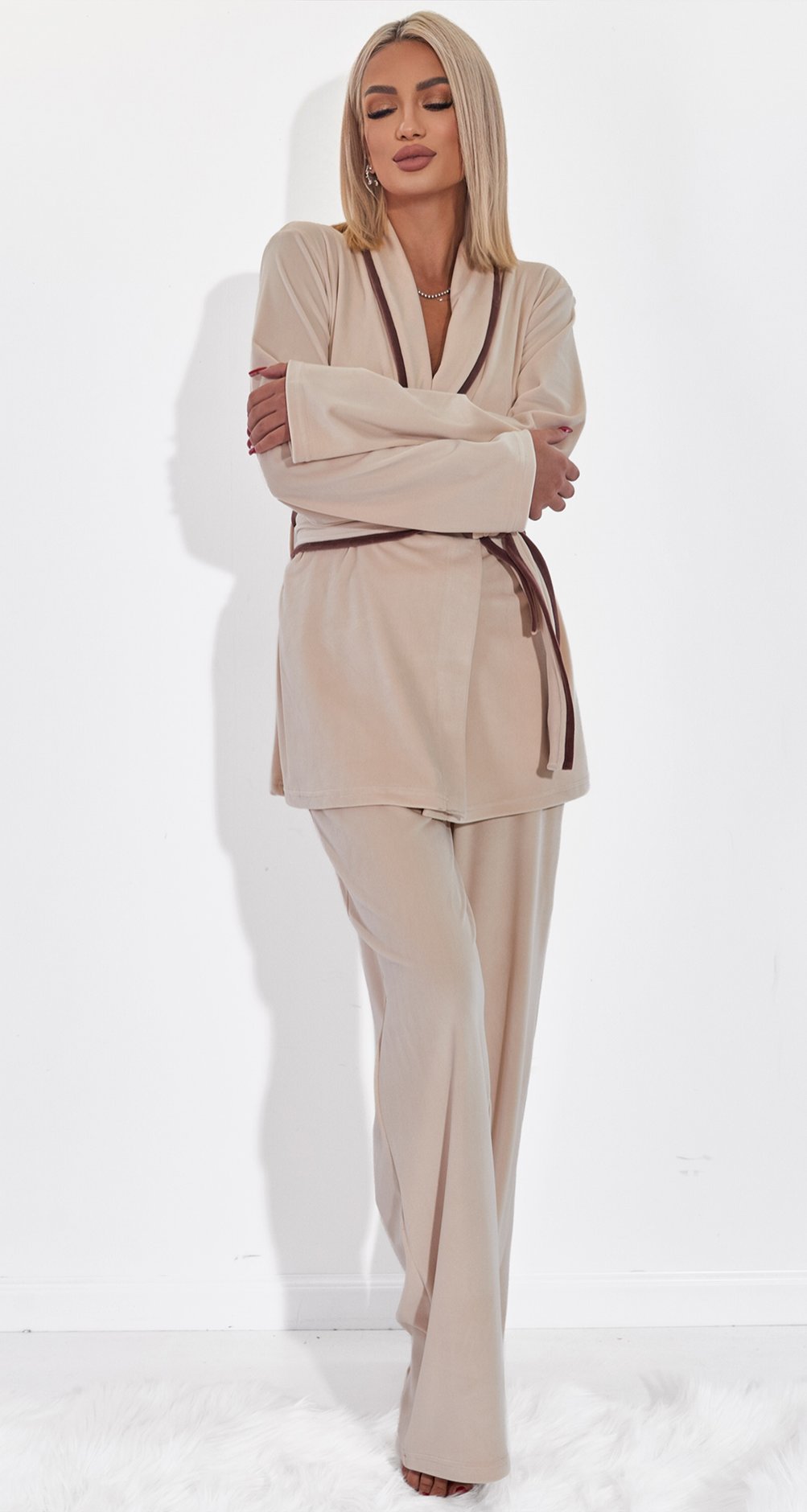 ​Безупречный Стиль: Комплект, состоящий из струящихся брюк с удобным поясом на резинке и элегантного халата-кимоно с контрастными деталями и поясом, подчеркнет вашу женственность даже дома.