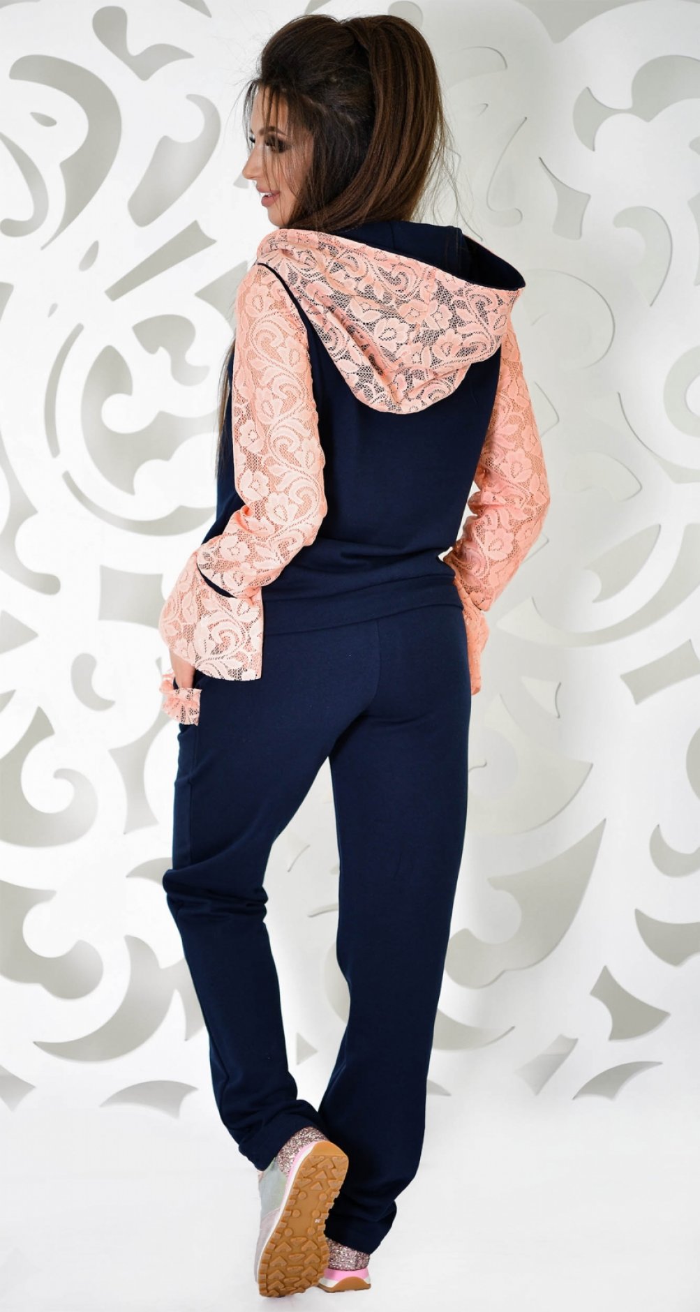 Оригинальный спортивный костюм с нежным кружевом из которого выполнены рукава, капюшон и отделка карманов.