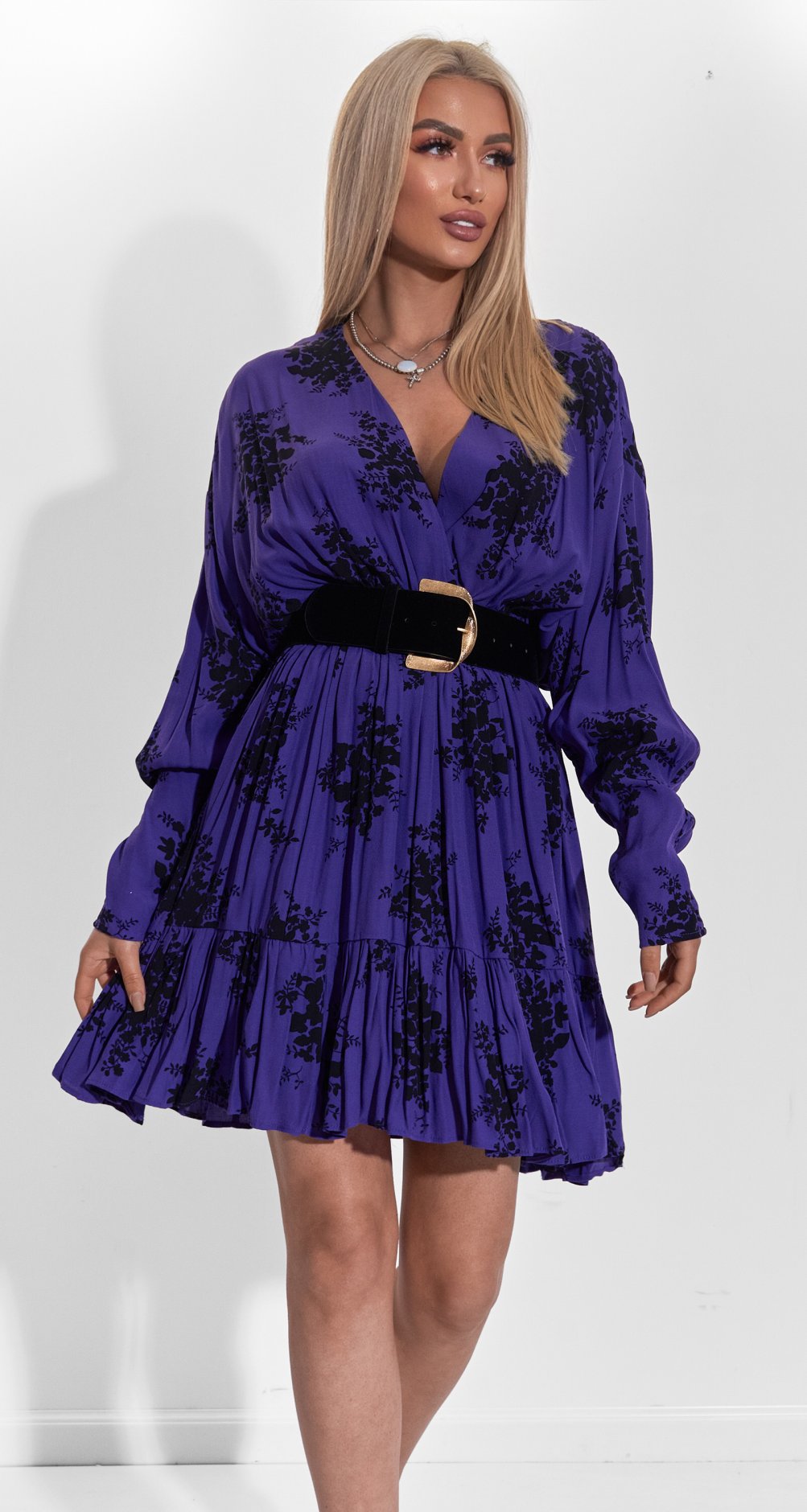 Глубокий V-образный вырез горловины изящно акцентирует линию шеи, а длинные рукава с мягкими складками на манжетах добавляют образу романтичности. Элегантный пояс с золотистой пряжкой подчеркивает талию, создавая женственный силуэт "песочные часы".