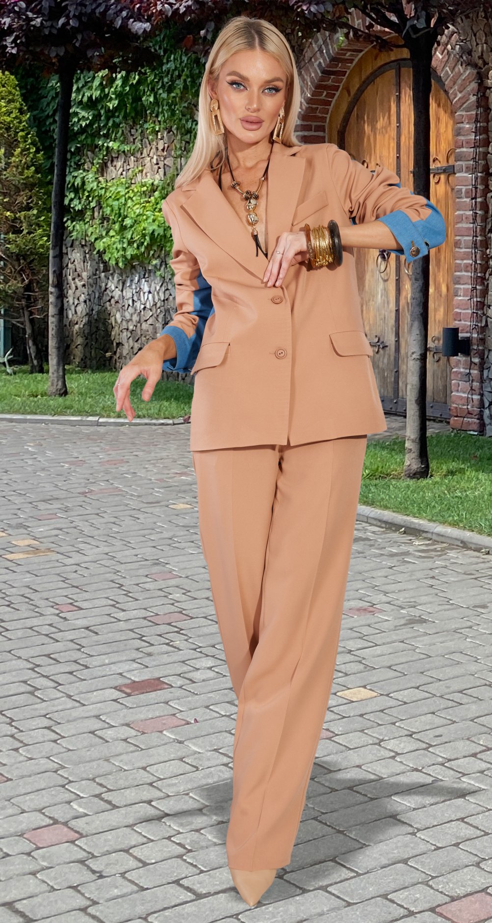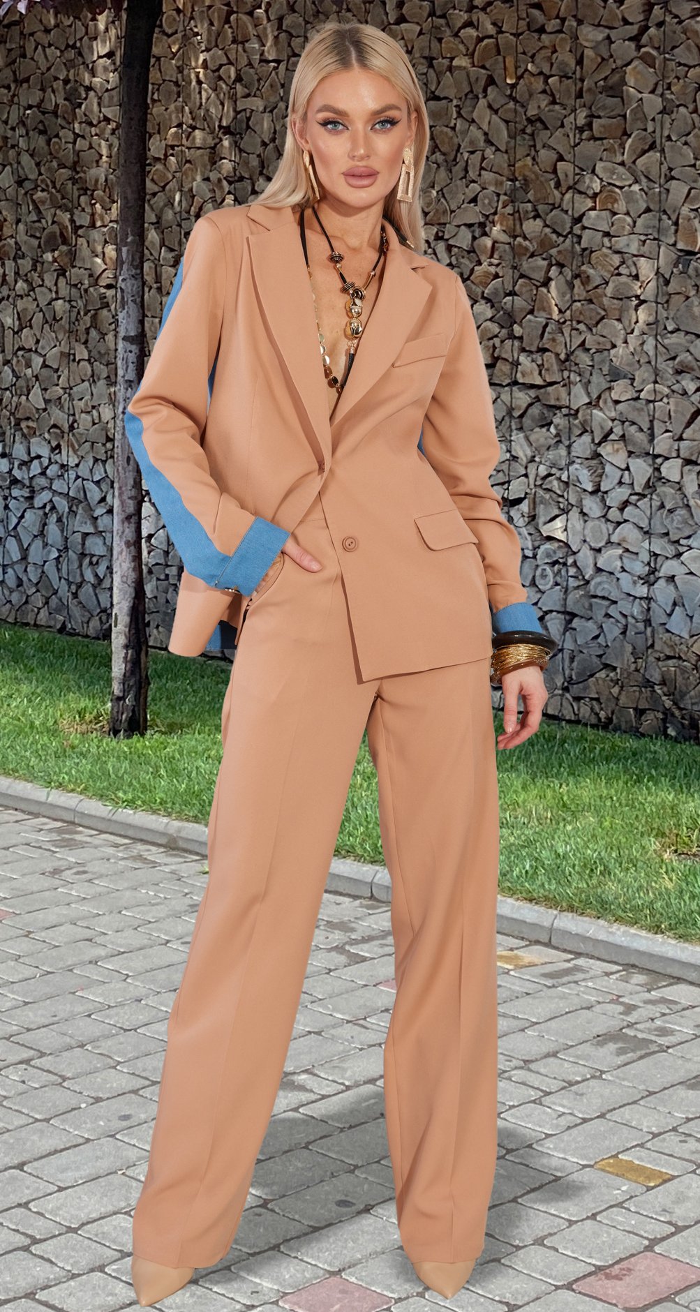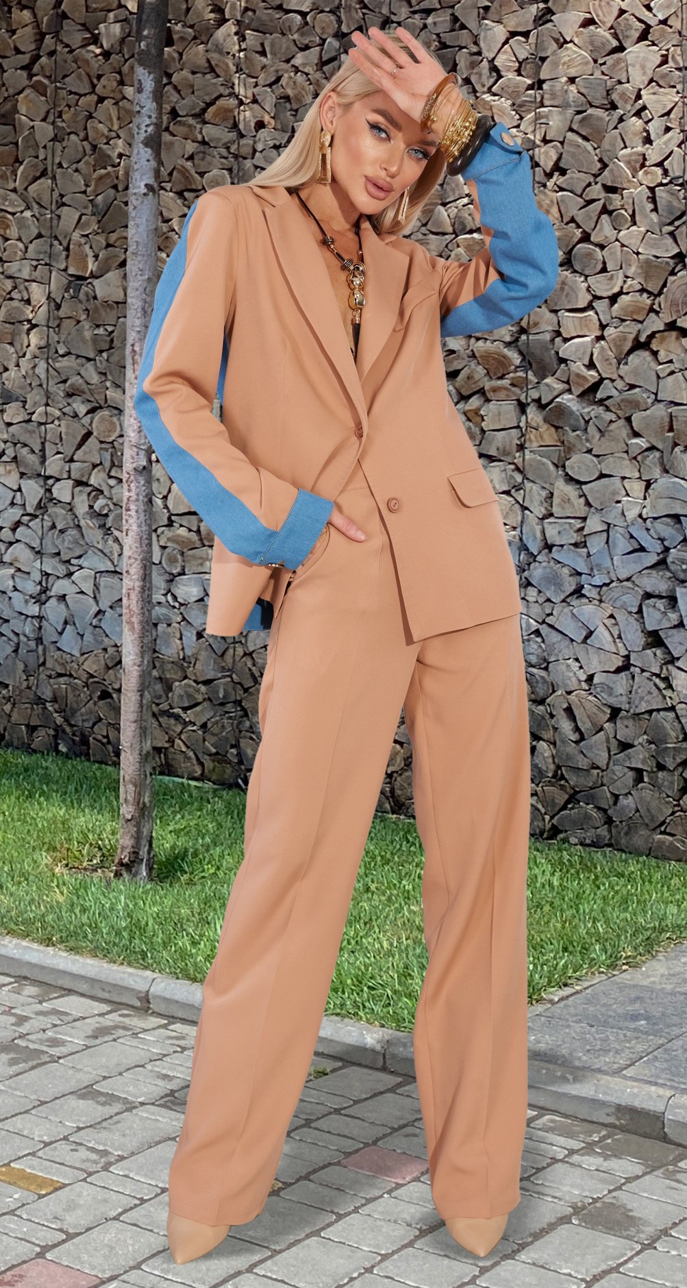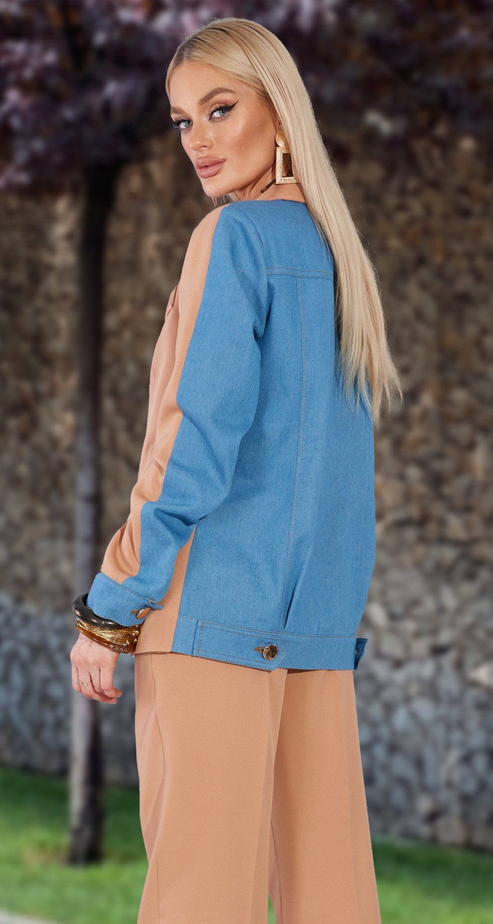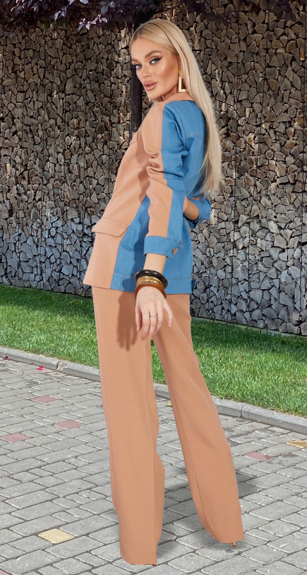 Бежевый цвет это текстиль, немного эластичный , а джинс натуральный , не стрейч.