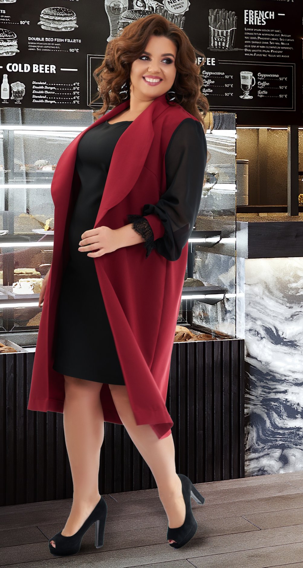 Свободный кардиган с шалевым воротничком и строгое платье-футляр.