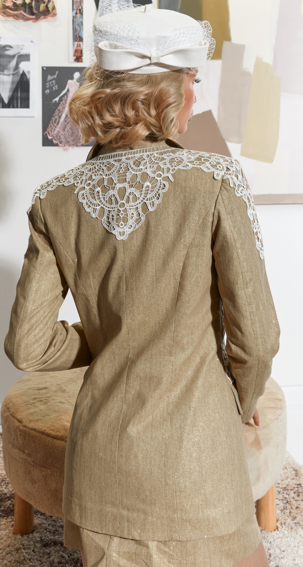 * Изысканное хлопковое кружево: Ручная работа и деликатное хлопковое кружево на лацканах и по бокам придают пиджаку неповторимый шарм и женственность, делая его по-настоящему уникальным.