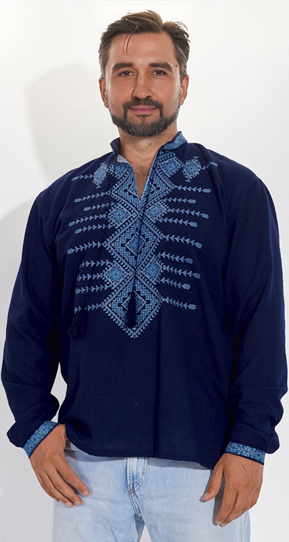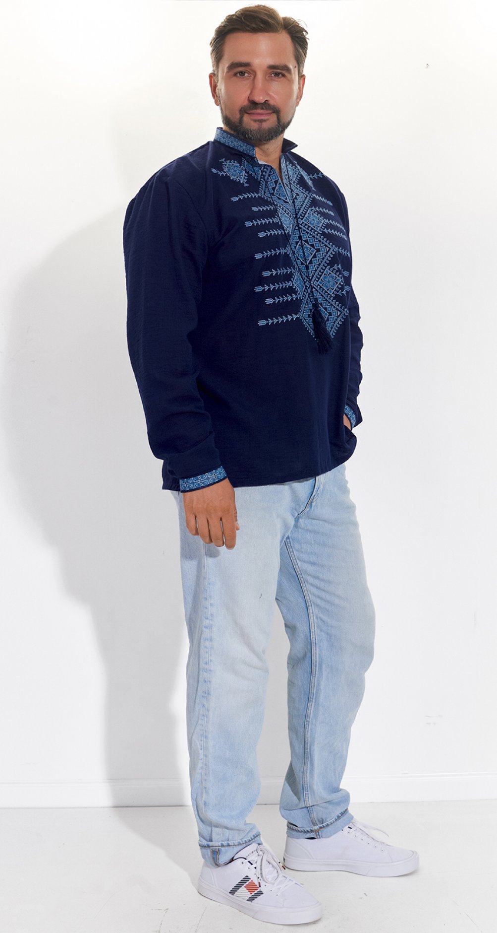* Гармонический узор: Вышивка выполнена в глубоких оттенках синего, что символизирует небо, воду и духовность. Геометрические орнаменты, украшающие воротник, грудь и манжеты, создают элегантный и мужественный образ.