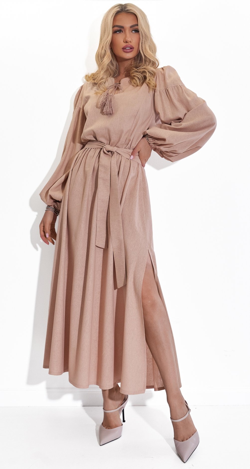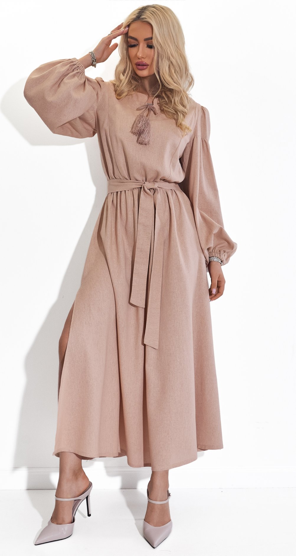 Представляем вашему вниманию идеальное платье для тех, кто ценит стиль, комфорт и натуральные ткани. Это потрясающее льняное платье нежно-бежевого оттенка станет жемчужиной вашего гардероба.