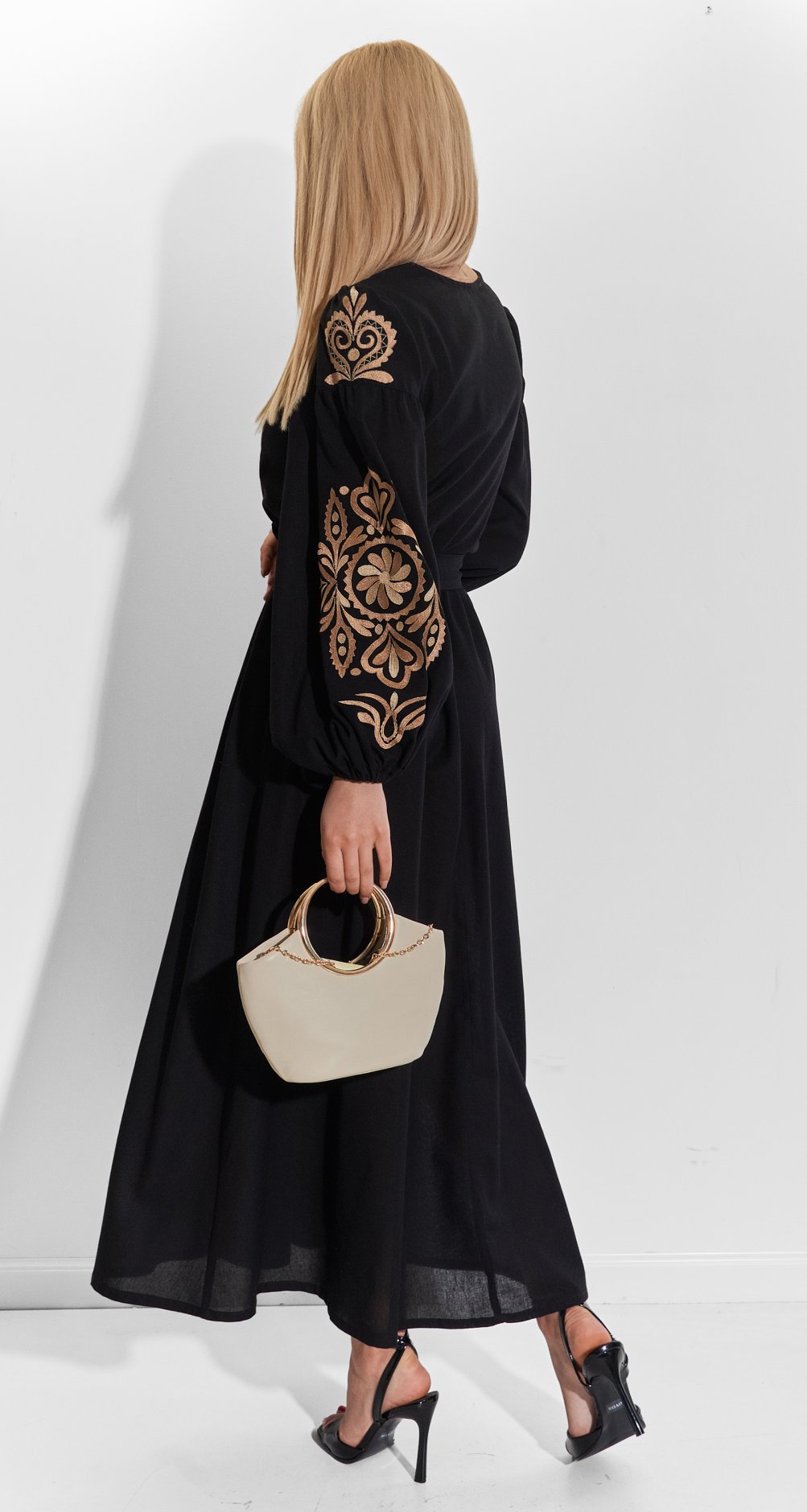 Представляем вам воплощение украинской души – льняное платье миди, украшенное вручную вышитыми мотивами. Натуральный лен обеспечивает комфорт и легкость, а красно-белая цветовая гамма вышивки несет в себе глубокий символизм. Пышные рукава собраны на манжету, а акцент на талии создается с помощью пояса в тон. Это платье станет ярким акцентом вашего гардероба, сочетая в себе культурное наследие и современные тенденции.