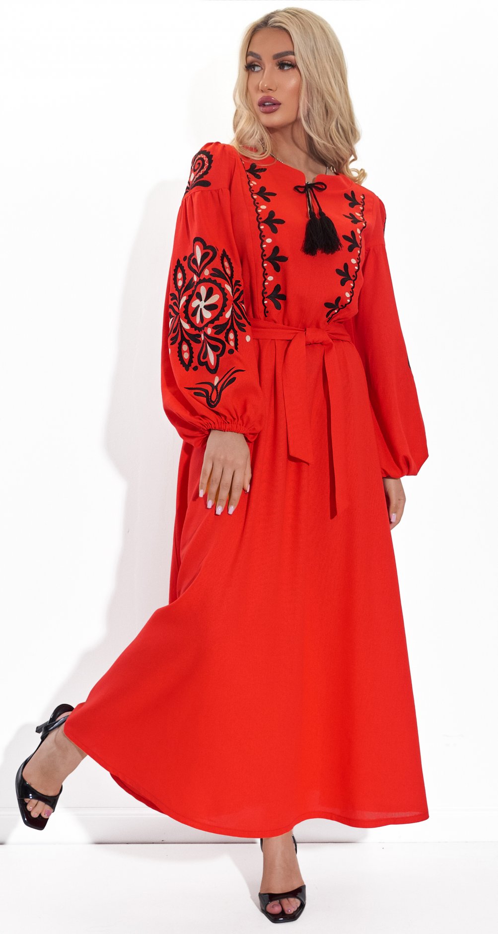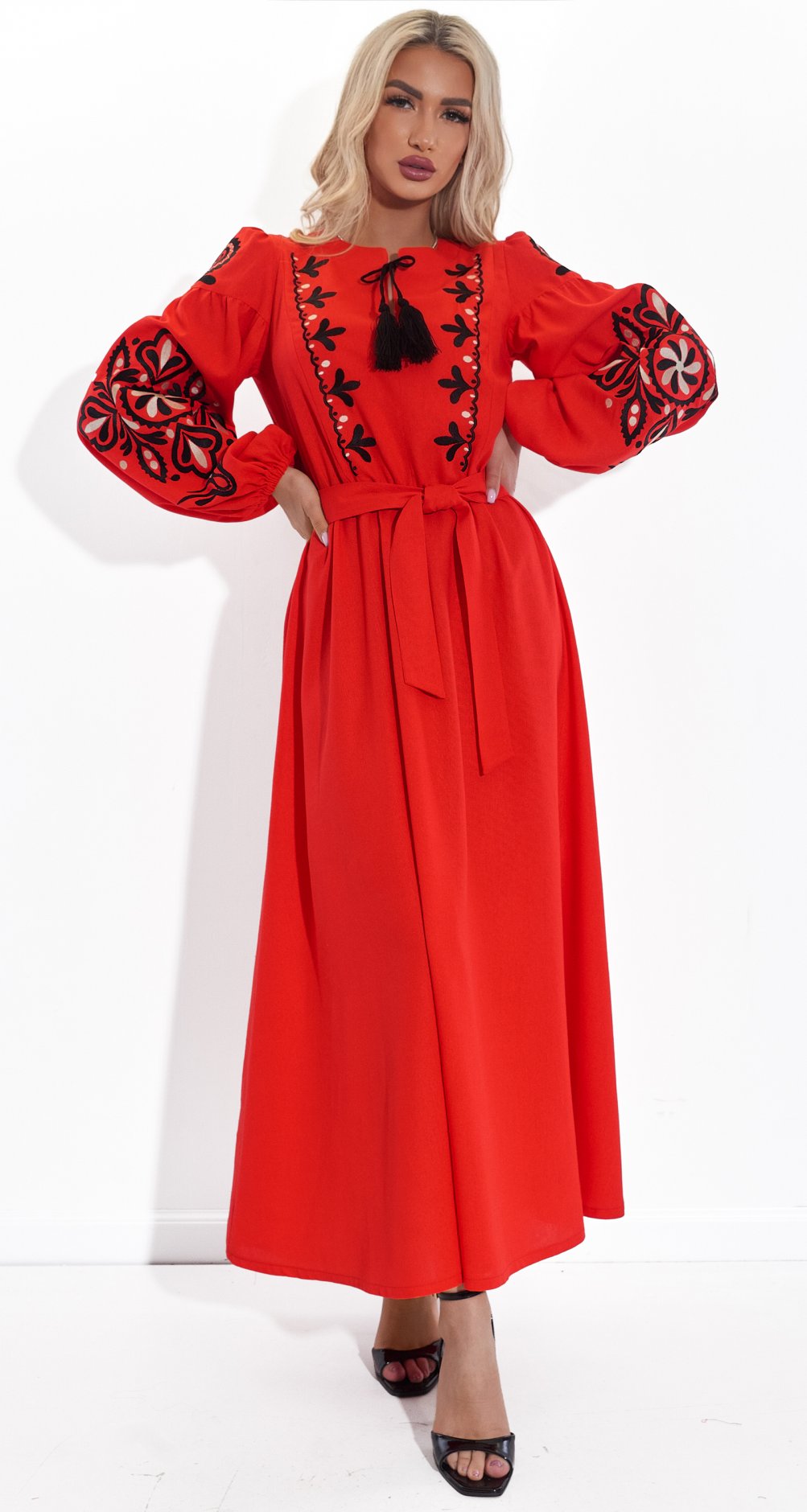 Представляем вам воплощение украинской души – льняное платье миди, украшенное вручную вышитыми мотивами. Натуральный лен обеспечивает комфорт и легкость, а красно-белая цветовая гамма вышивки несет в себе глубокий символизм. Пышные рукава собраны на манжету, а акцент на талии создается с помощью пояса в тон. Это платье станет ярким акцентом вашего гардероба, сочетая в себе культурное наследие и современные тенденции.