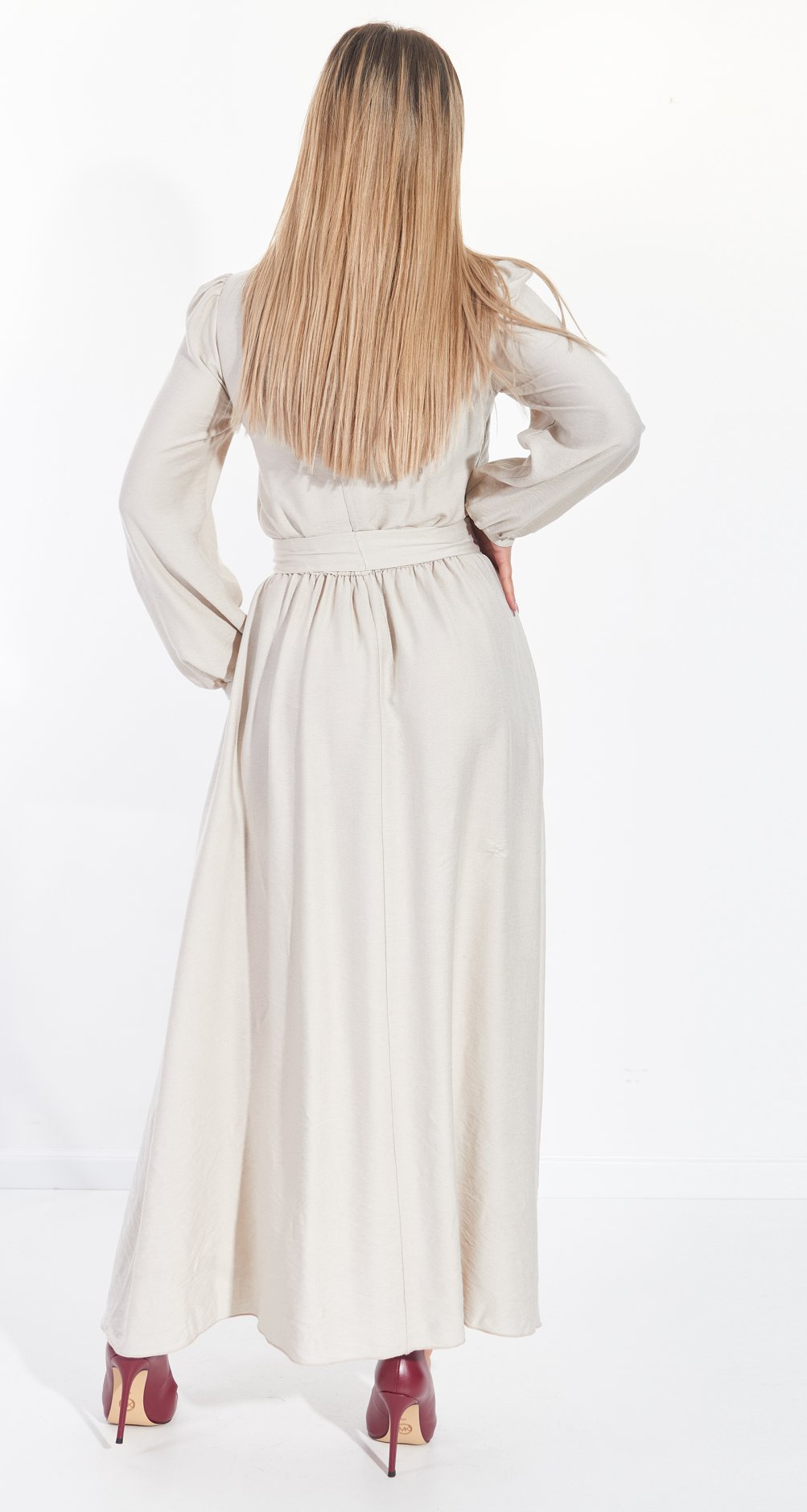 Талия на резинке, и дополнительно можно подчеркнуть поясом из основной ткани! Он поставляется в комплекте!