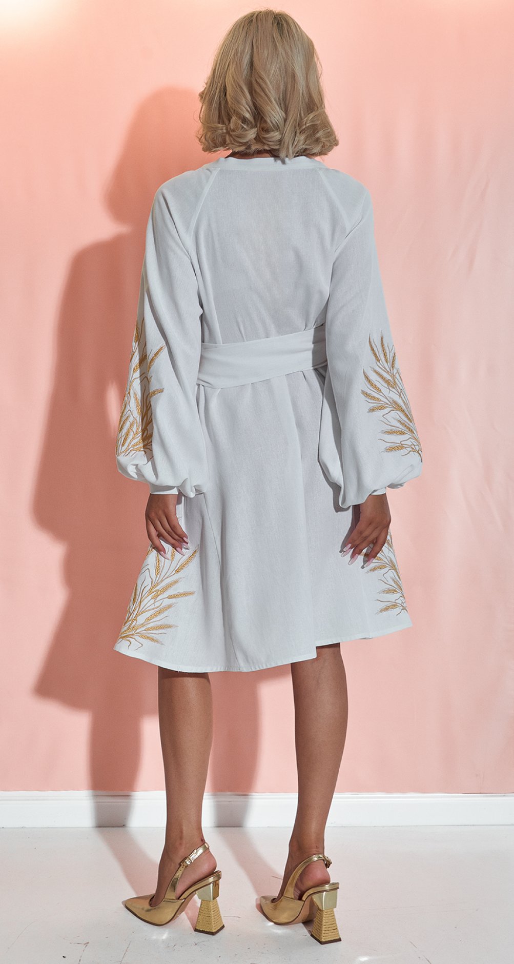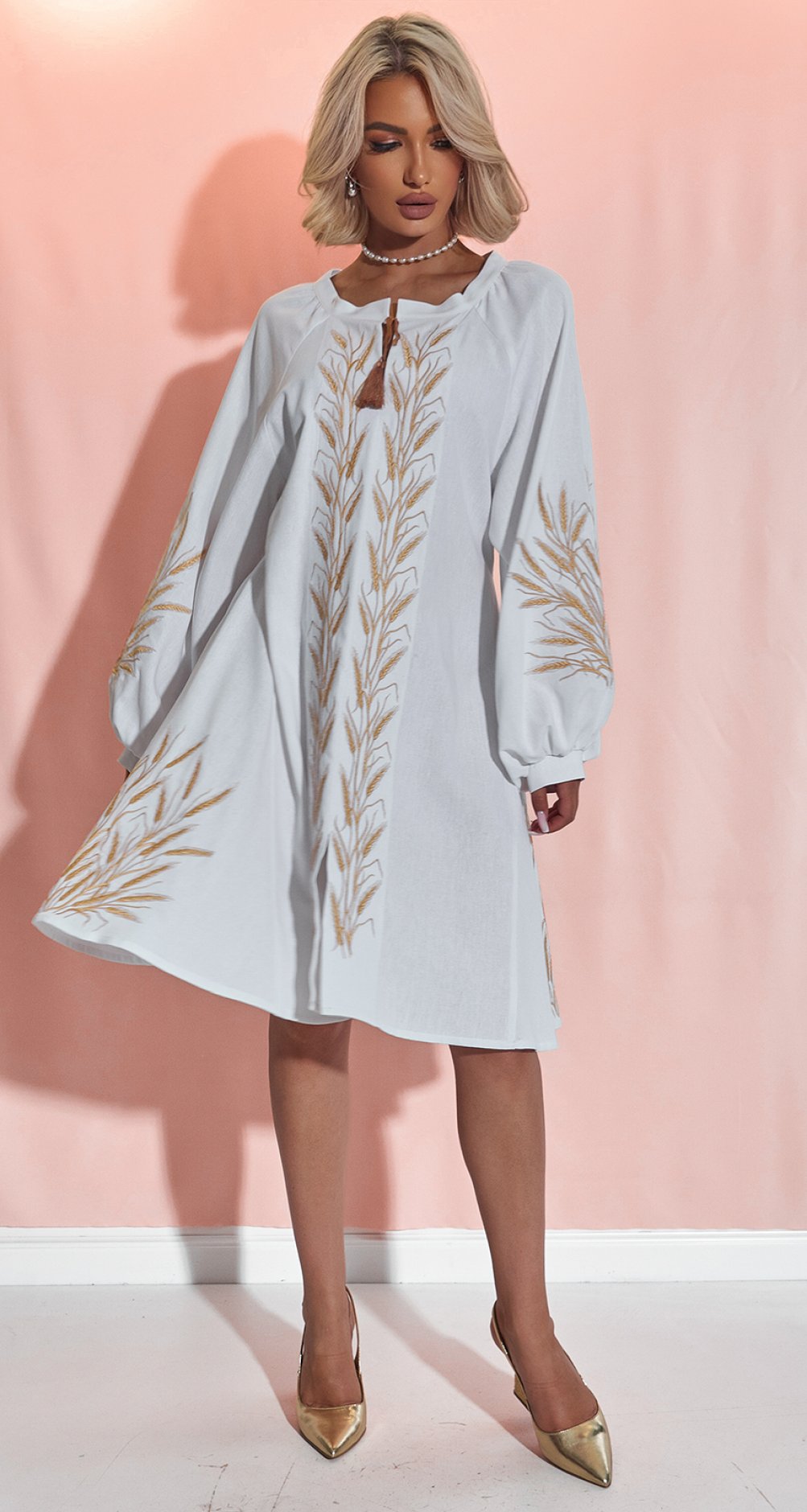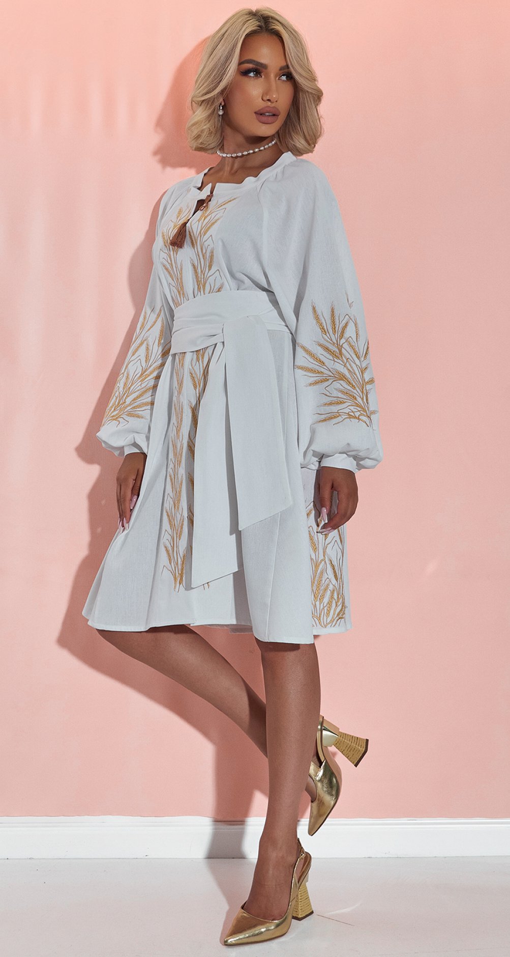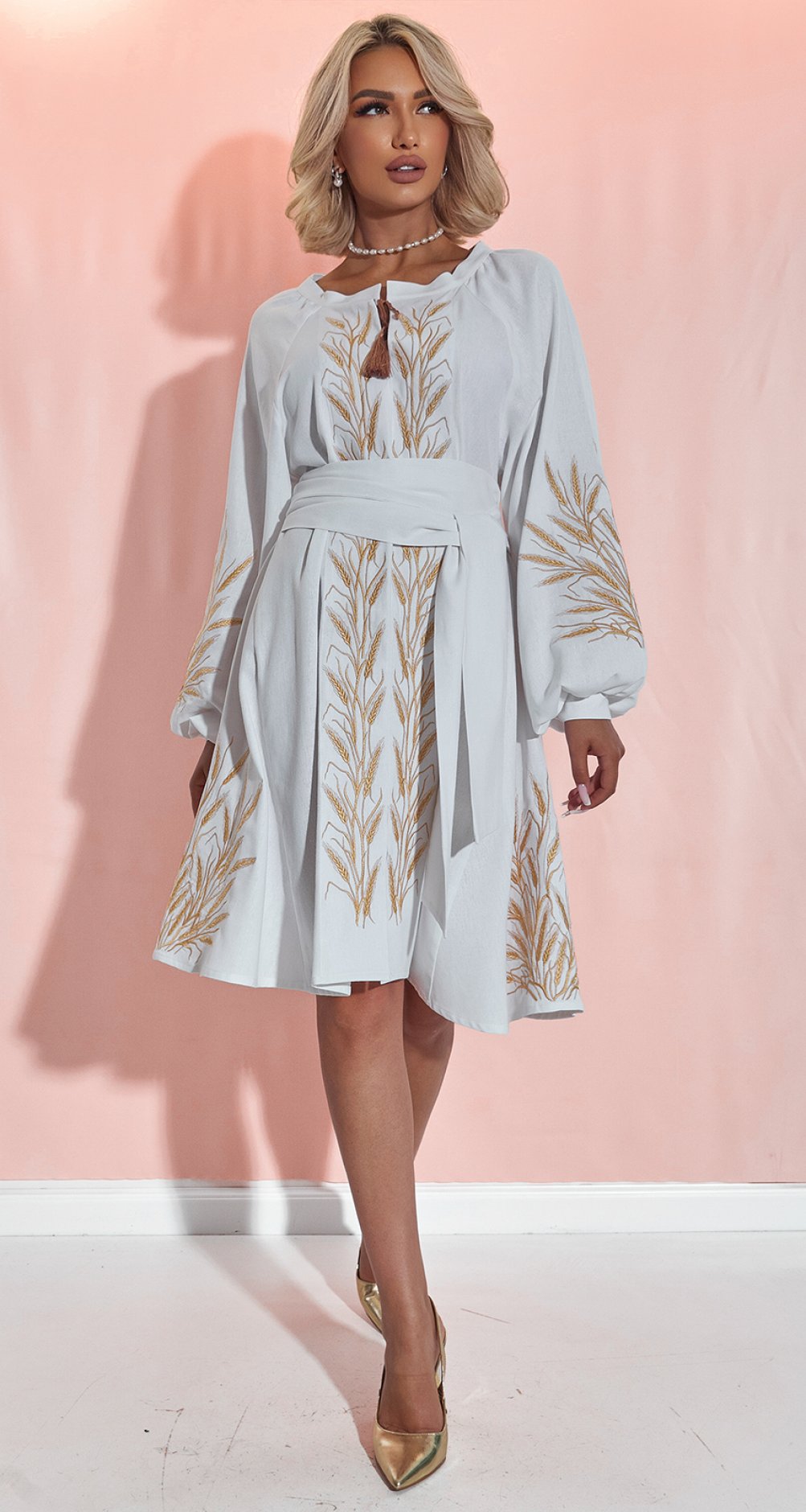 * Изысканная вышивка: Платье украшено золотистой вышивкой в виде колосьев, символизирующей богатство и плодородие. Этот узор делает образ по-настоящему уникальным и запоминающимся.