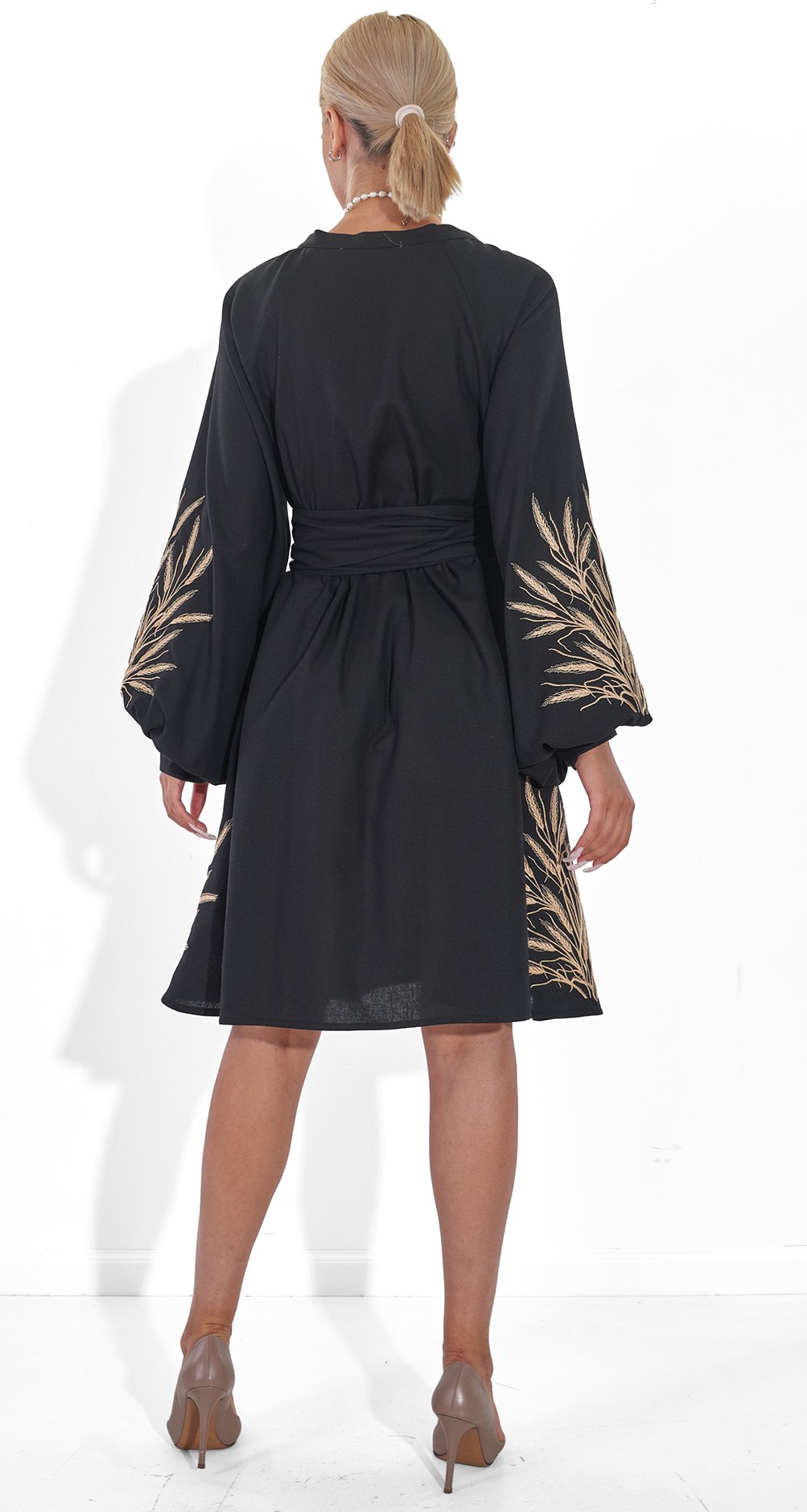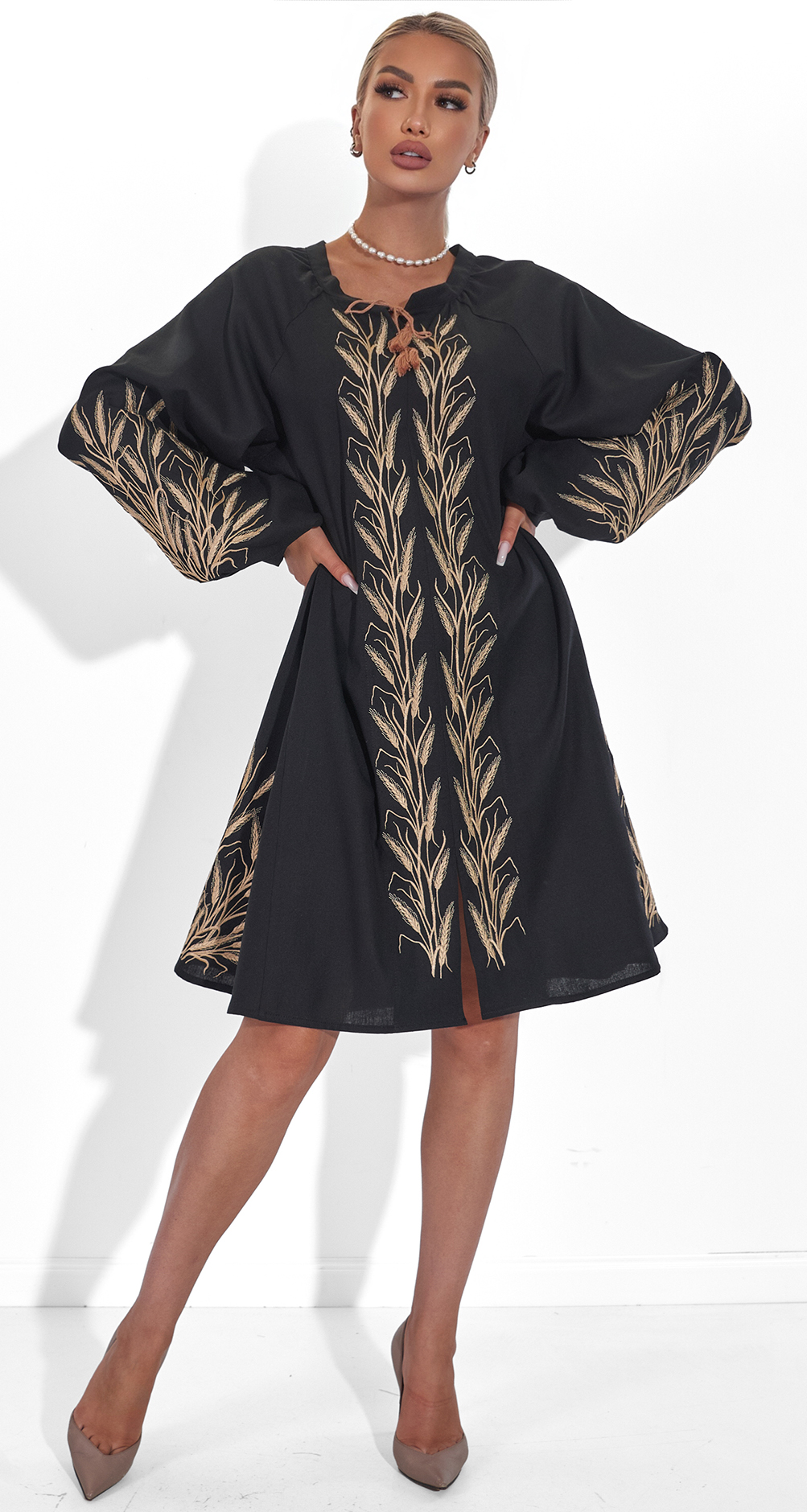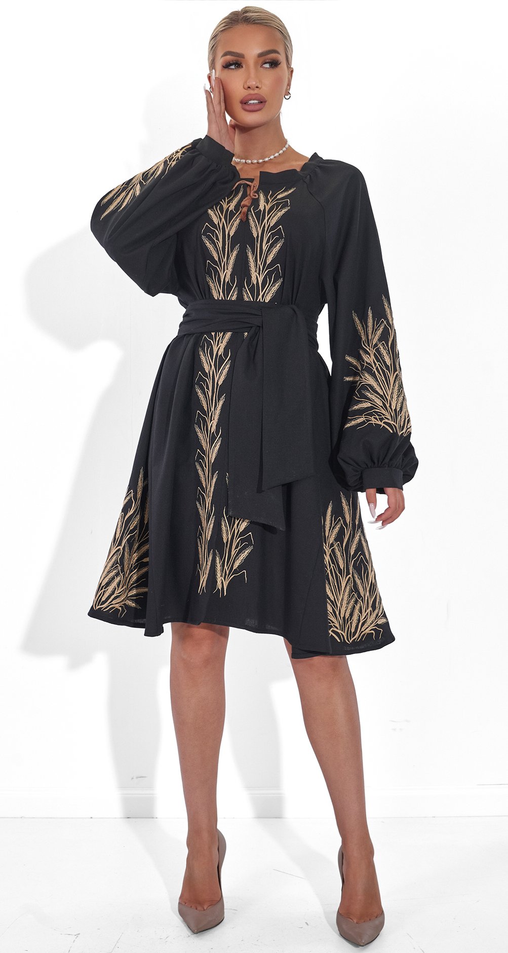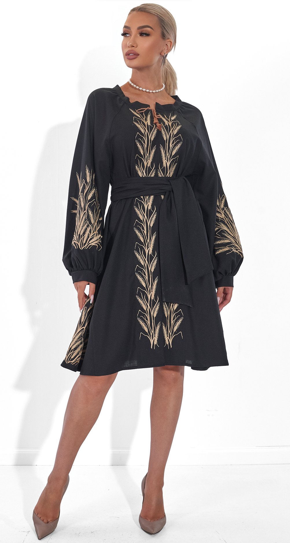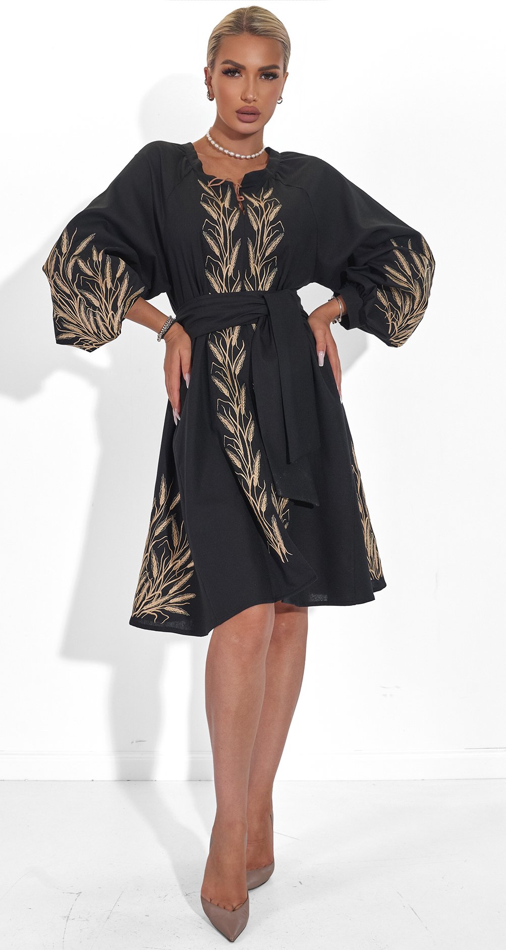 * Изысканная вышивка: Платье украшено золотистой вышивкой в виде колосьев, символизирующей богатство и плодородие. Этот узор делает образ по-настоящему уникальным и запоминающимся.