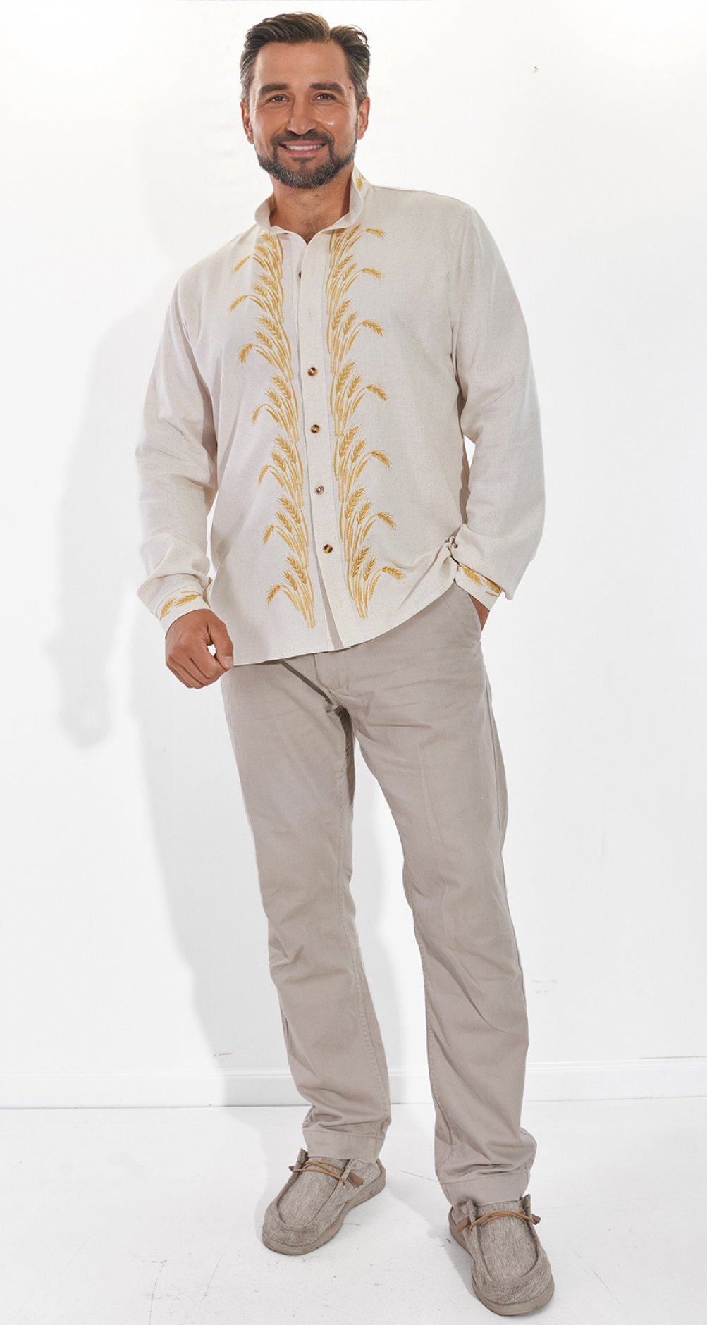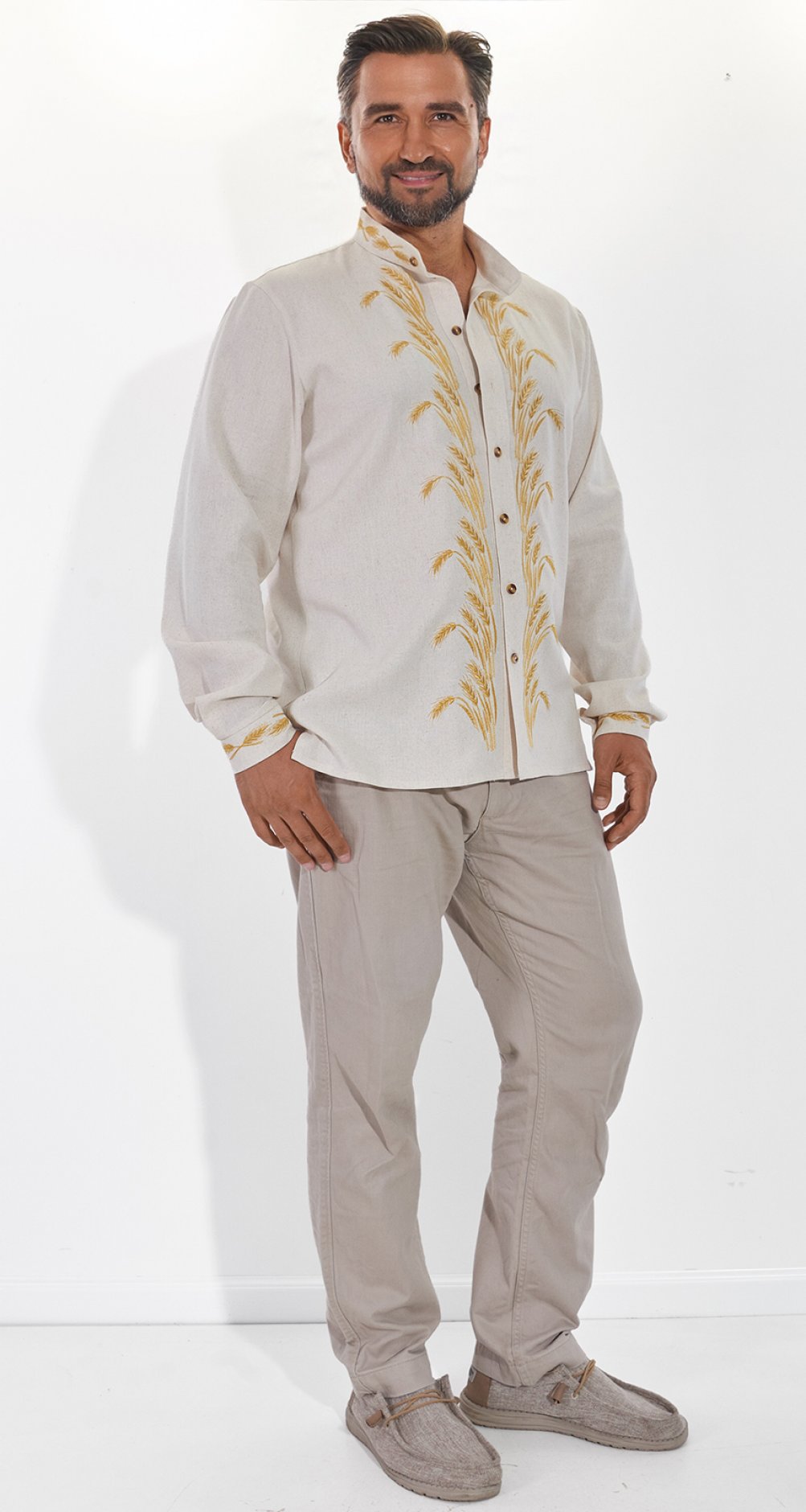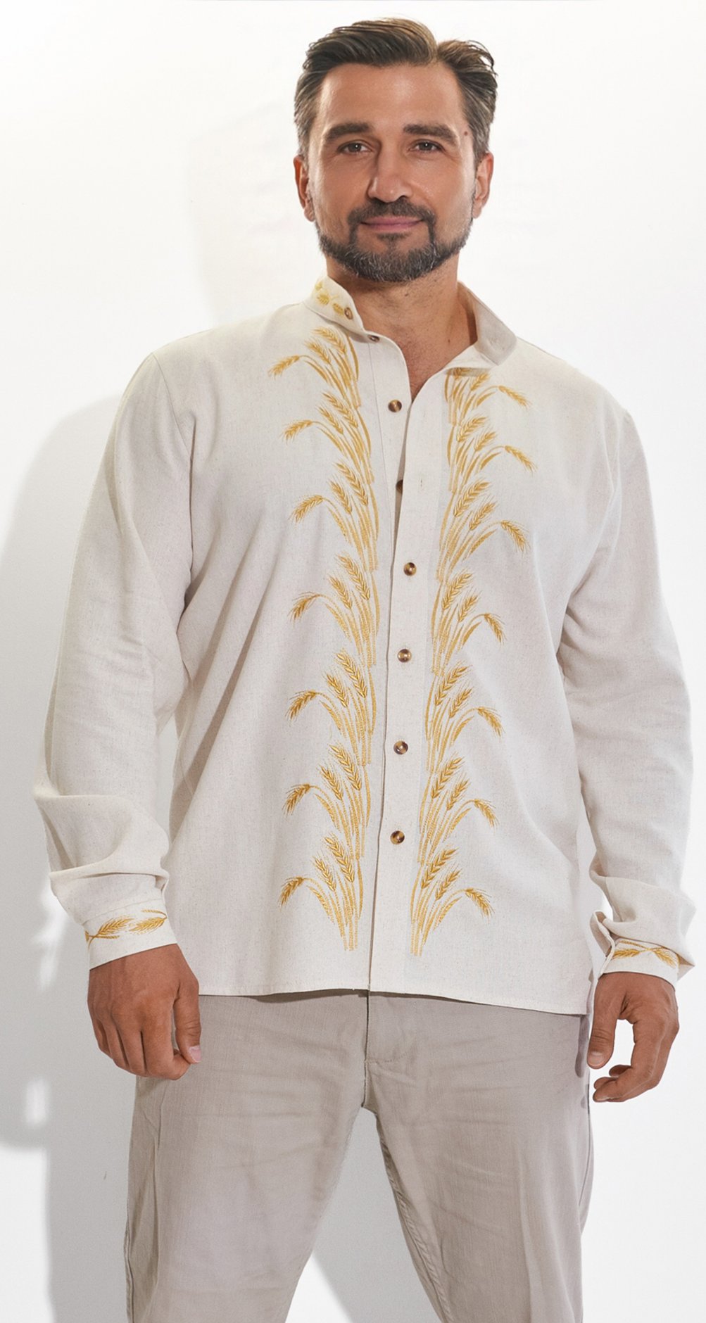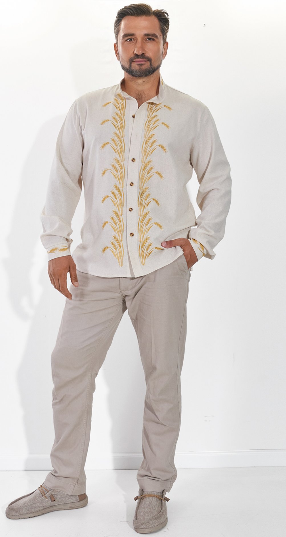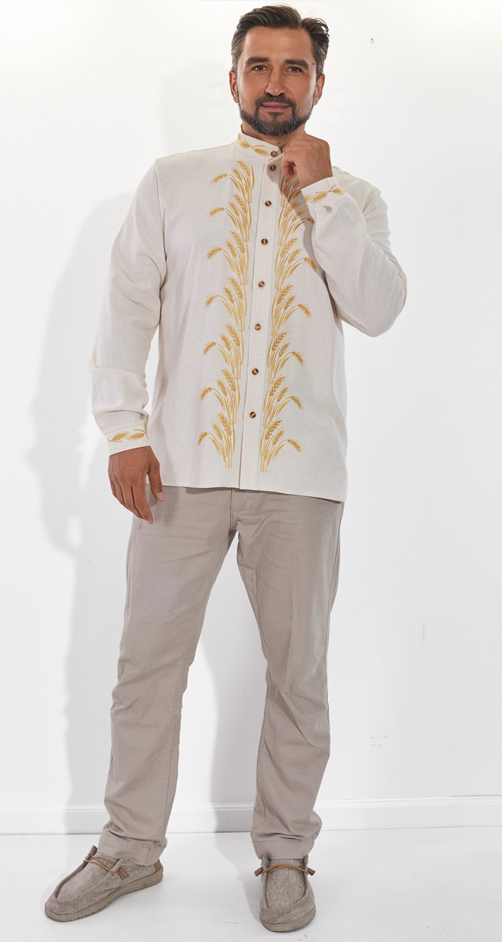 Эта эксклюзивная мужская вышиванка выполнена из натурального льна, который обеспечивает комфорт и легкость даже в самые жаркие дни. В центре внимания – роскошный узор из колосьев пшеницы, вышитый золотистой нитью. Этот орнамент, символизирующий плодородие, богатство и жизненную силу, делает "Мирослава" не просто одеждой, а настоящим оберегом.