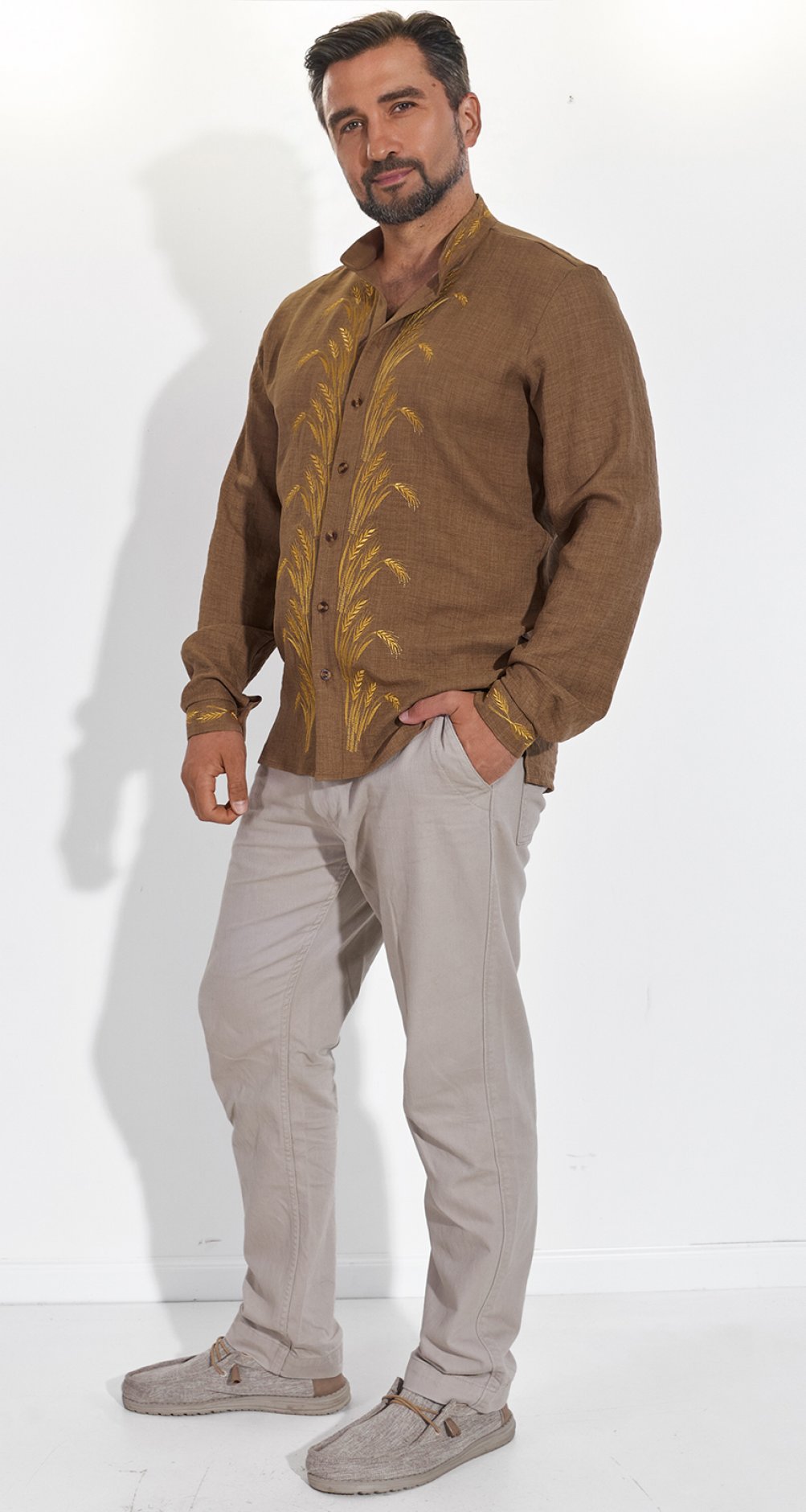 Эта эксклюзивная мужская вышиванка выполнена из натурального льна, который обеспечивает комфорт и легкость даже в самые жаркие дни. В центре внимания – роскошный узор из колосьев пшеницы, вышитый золотистой нитью. Этот орнамент, символизирующий плодородие, богатство и жизненную силу, делает "Мирослава" не просто одеждой, а настоящим оберегом.