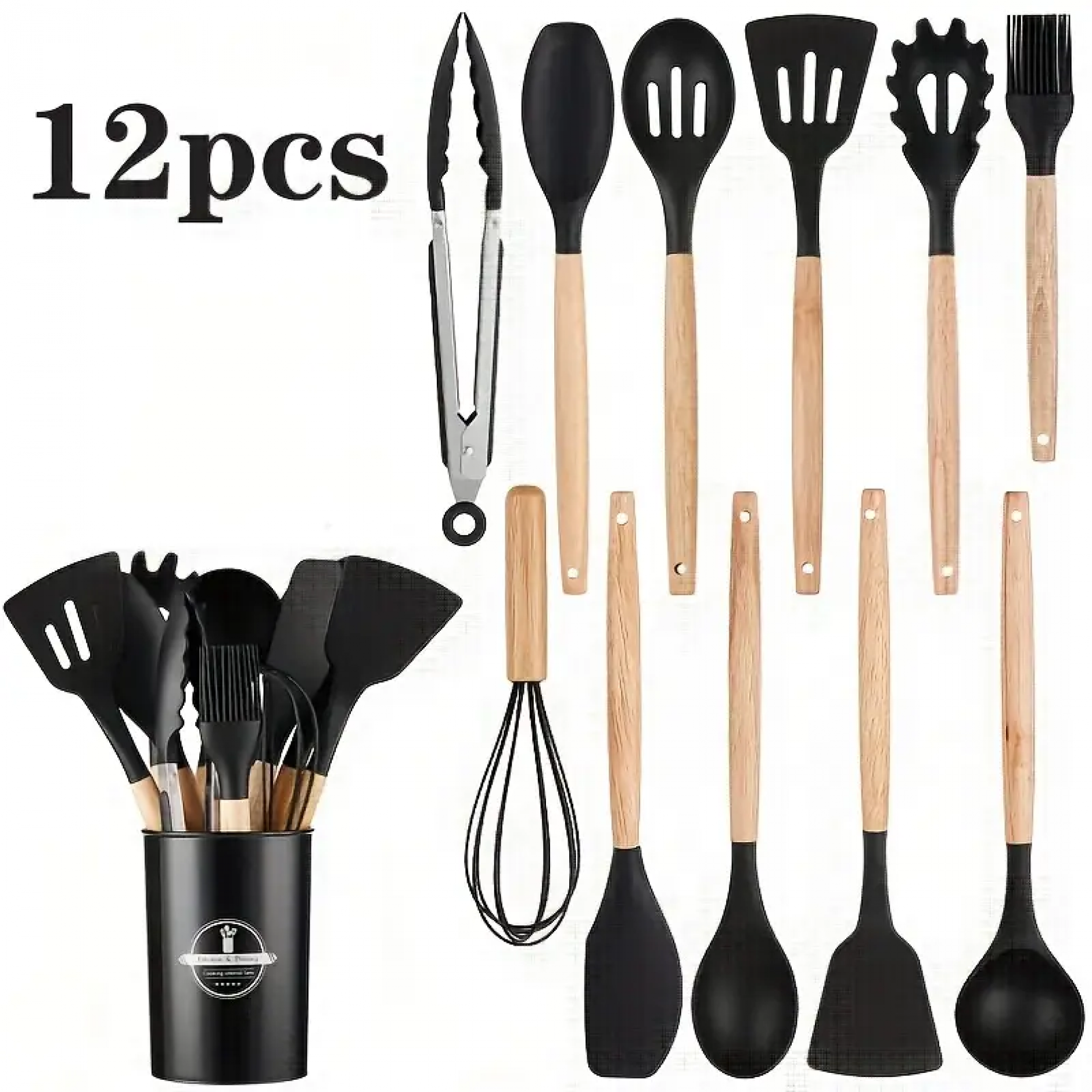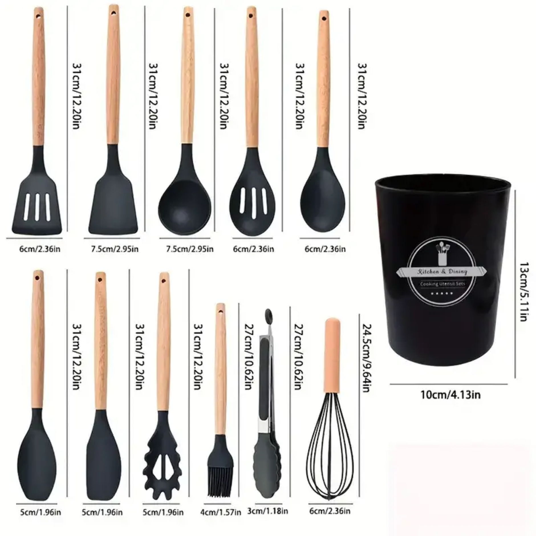 Каждый аксессуар сделан из крепкого и гладкого висококачественного дуба с антибактериальными свойствами, пользоваться которыми безопасно та комфортно. Также используется сверхтермоустойчивый нетоксичный силикону, который защищает Вашу посуду от царапин. На дне ведерка для аксессуаров есть отверствие, которое обеспечиваеет сухость всех предметов, а также ппредотвращает образование слизи и плесени.