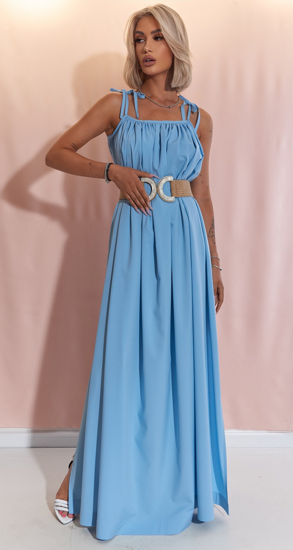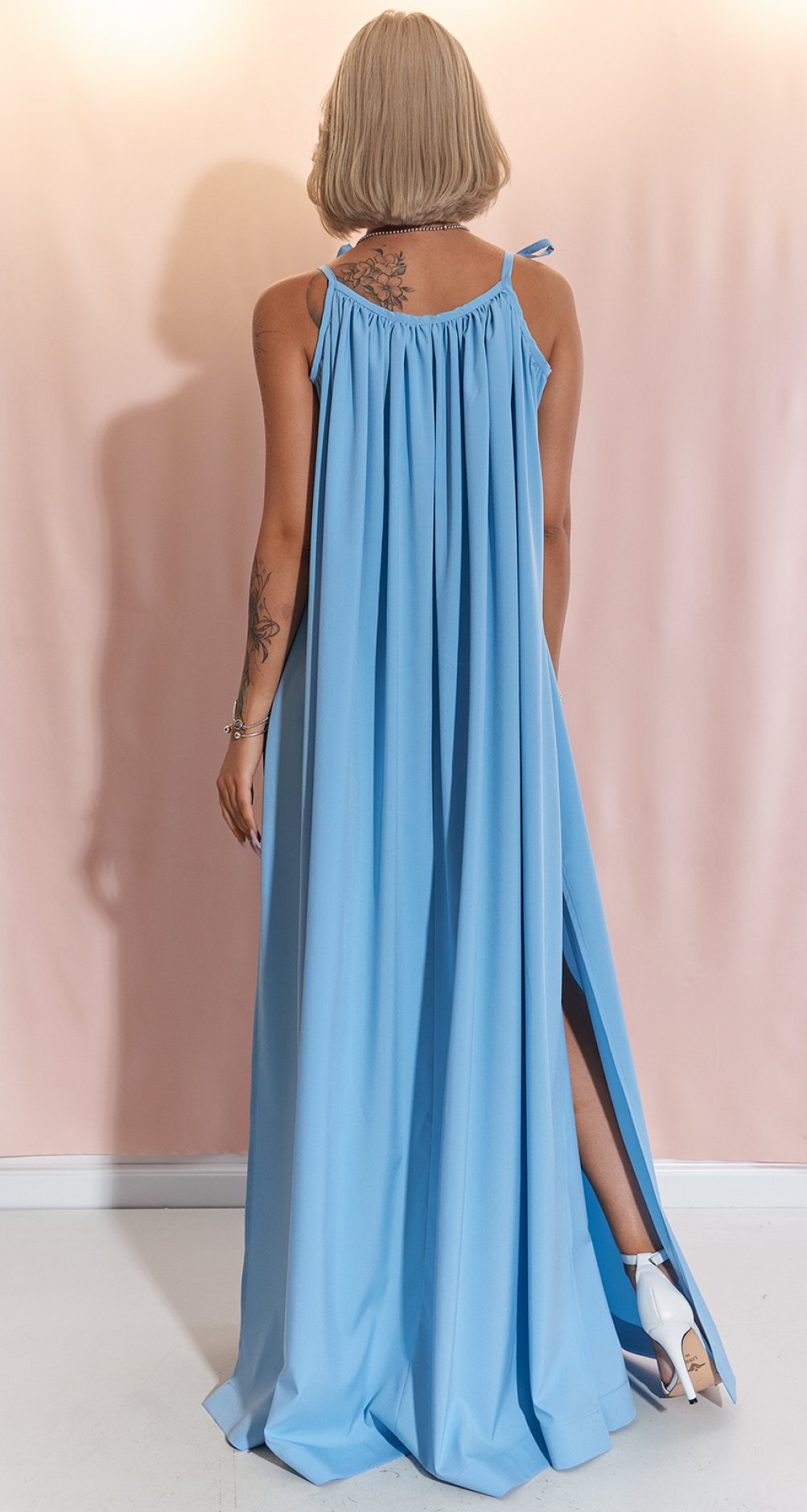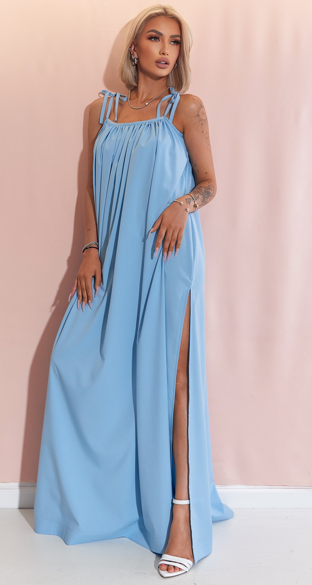 Встречайте идеальное платье для жаркого сезона! Это стильное макси-платье цвета неба станет незаменимым элементом вашего гардероба. Элегантные высокие разрезы по бокам придают динамичности и позволяют продемонстрировать красоту ног, не теряя при этом женственности. Свободный крой и легкая ткань обеспечивают максимальный комфорт в любую погоду. Носите его с сандалиями для повседневного образа или с туфлями на каблуке для вечернего выхода. Тренд 2025 - расслабленный шик и комфорт!