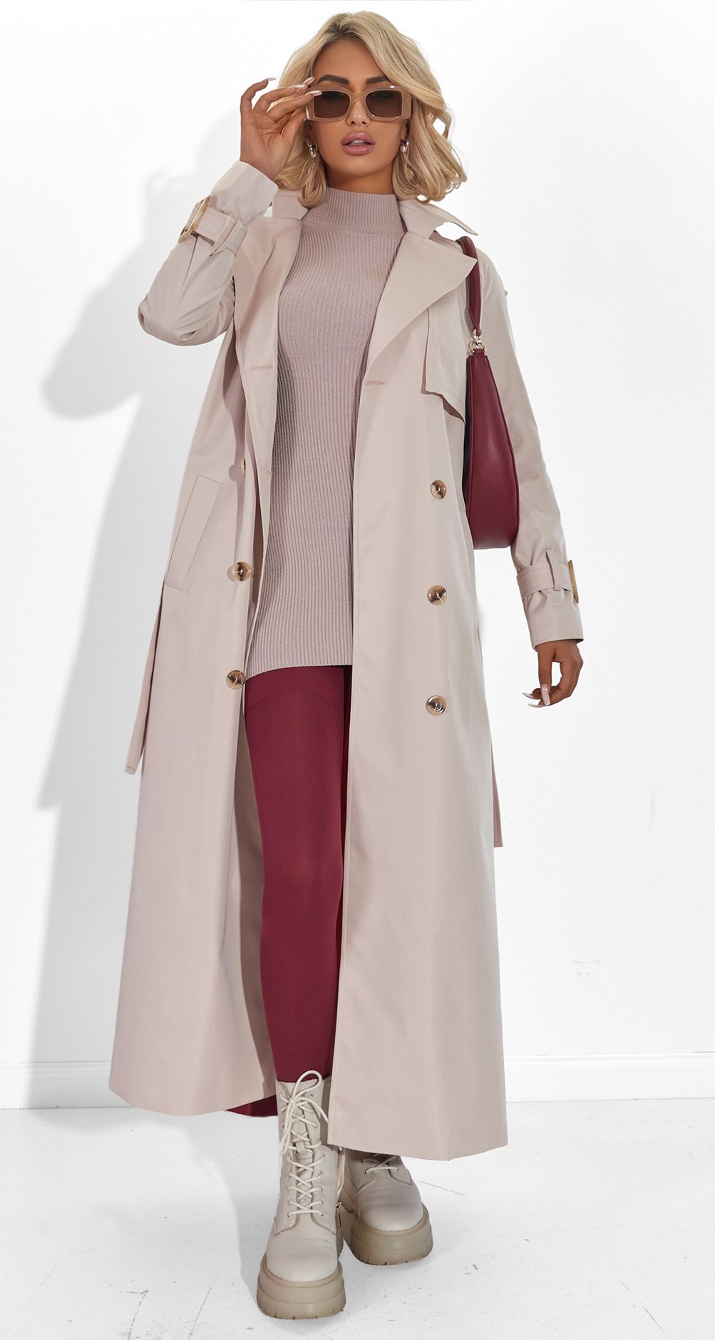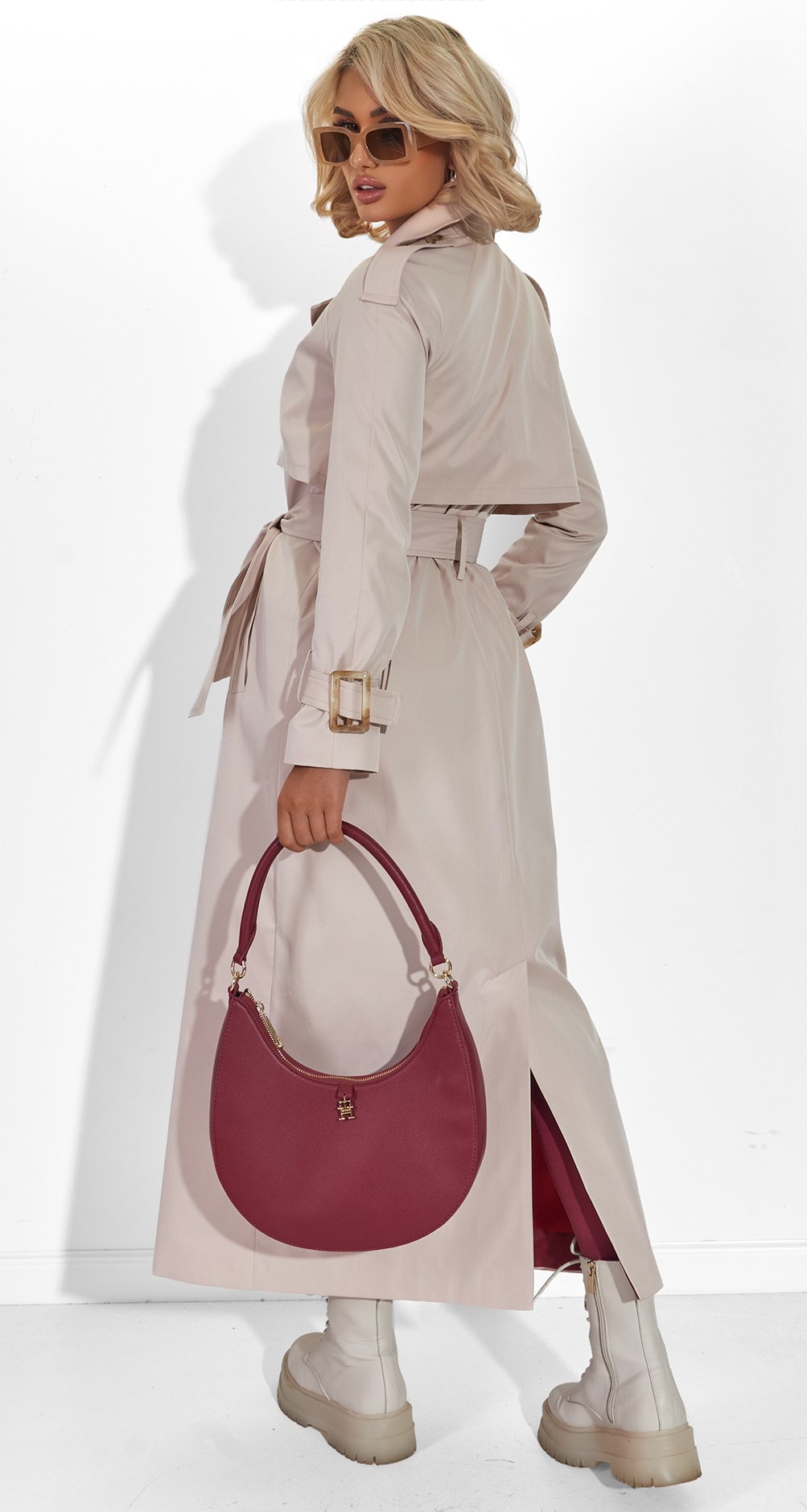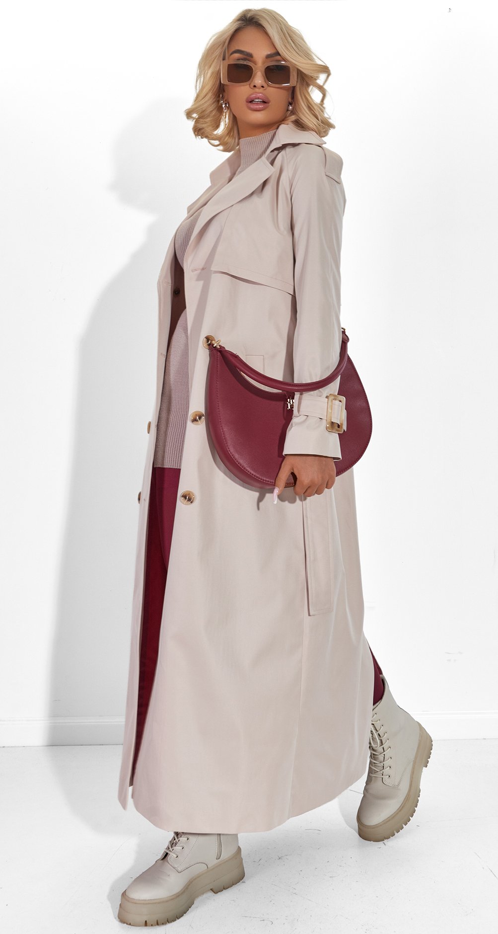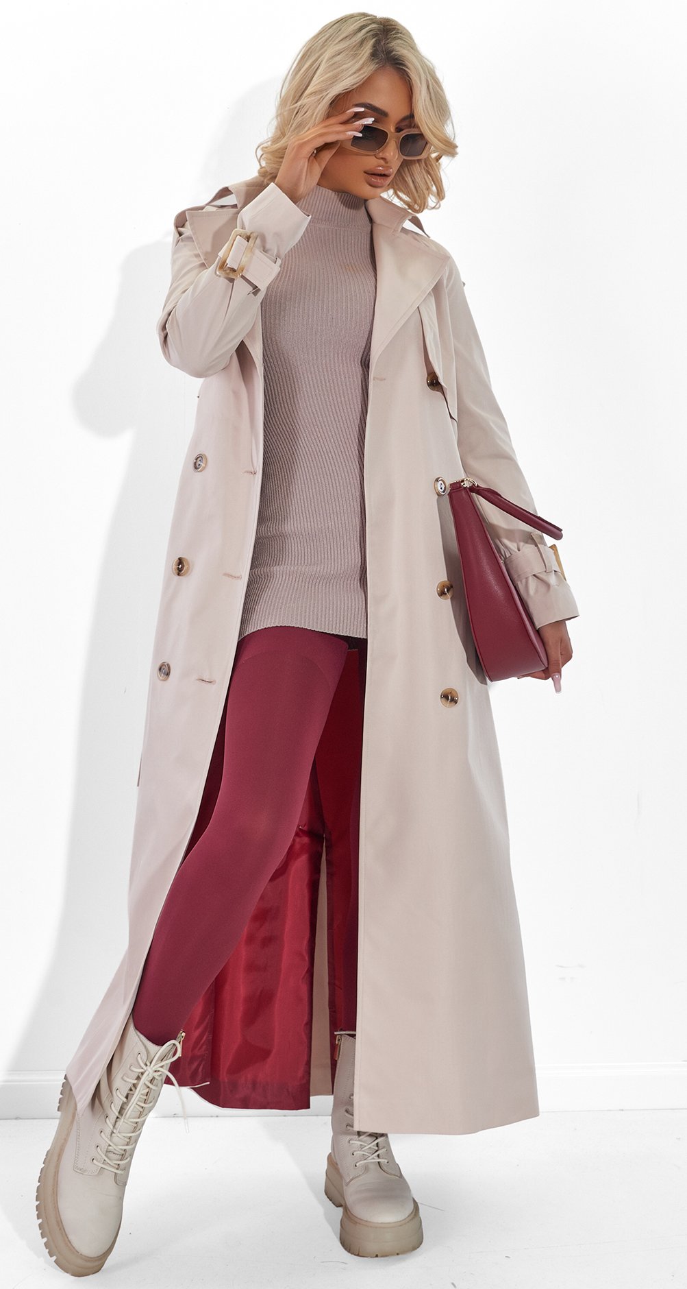 * Универсальность. Плащ легко комбинируется с любой одеждой — от классических брюк и юбок до джинсов и платьев. На фото модель демонстрирует его с трикотажным костюмом винного оттенка и грубыми ботинками, создавая смелый и модный контраст. Также его можно дополнить яркими аксессуарами, например, сумкой в тон.