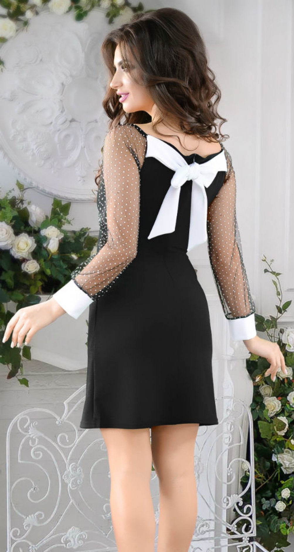 Очаровательное платье по фигуре с открытыми плечиками, рукавами из нарядной сеточки с бархатной точкой, и милыми бантами.