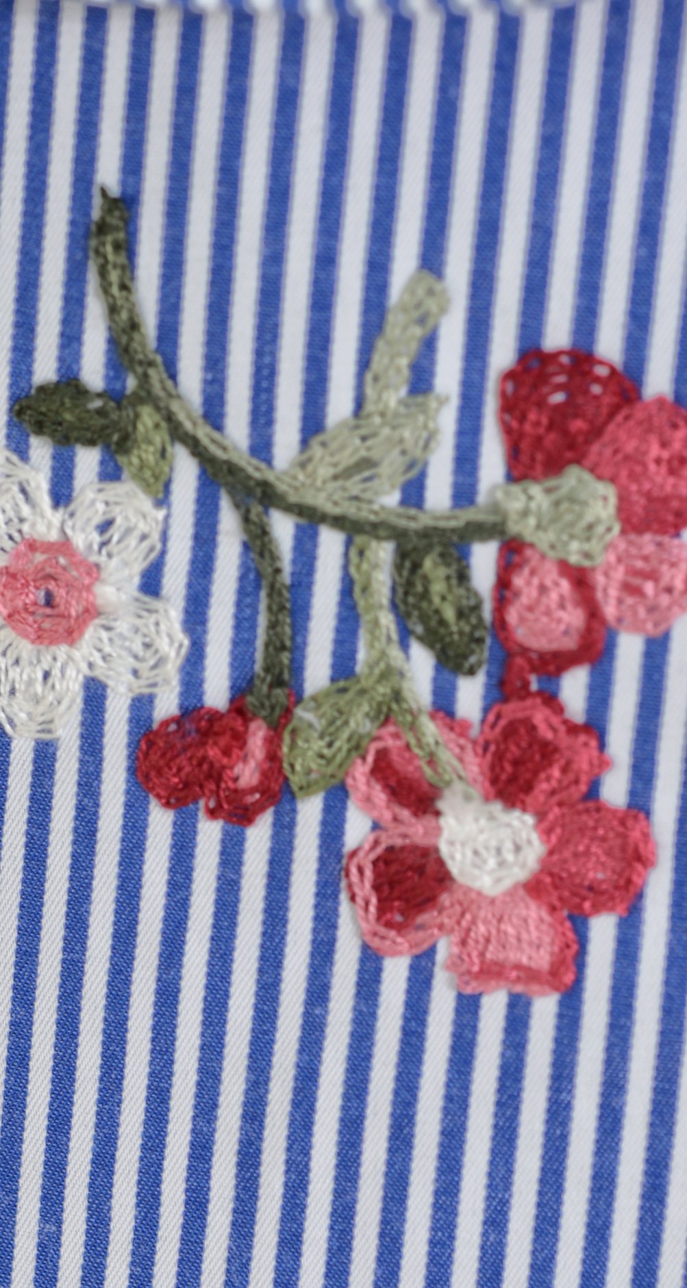 Сшито из катонового полотна,лёгкого и с вышитыми цветочками.