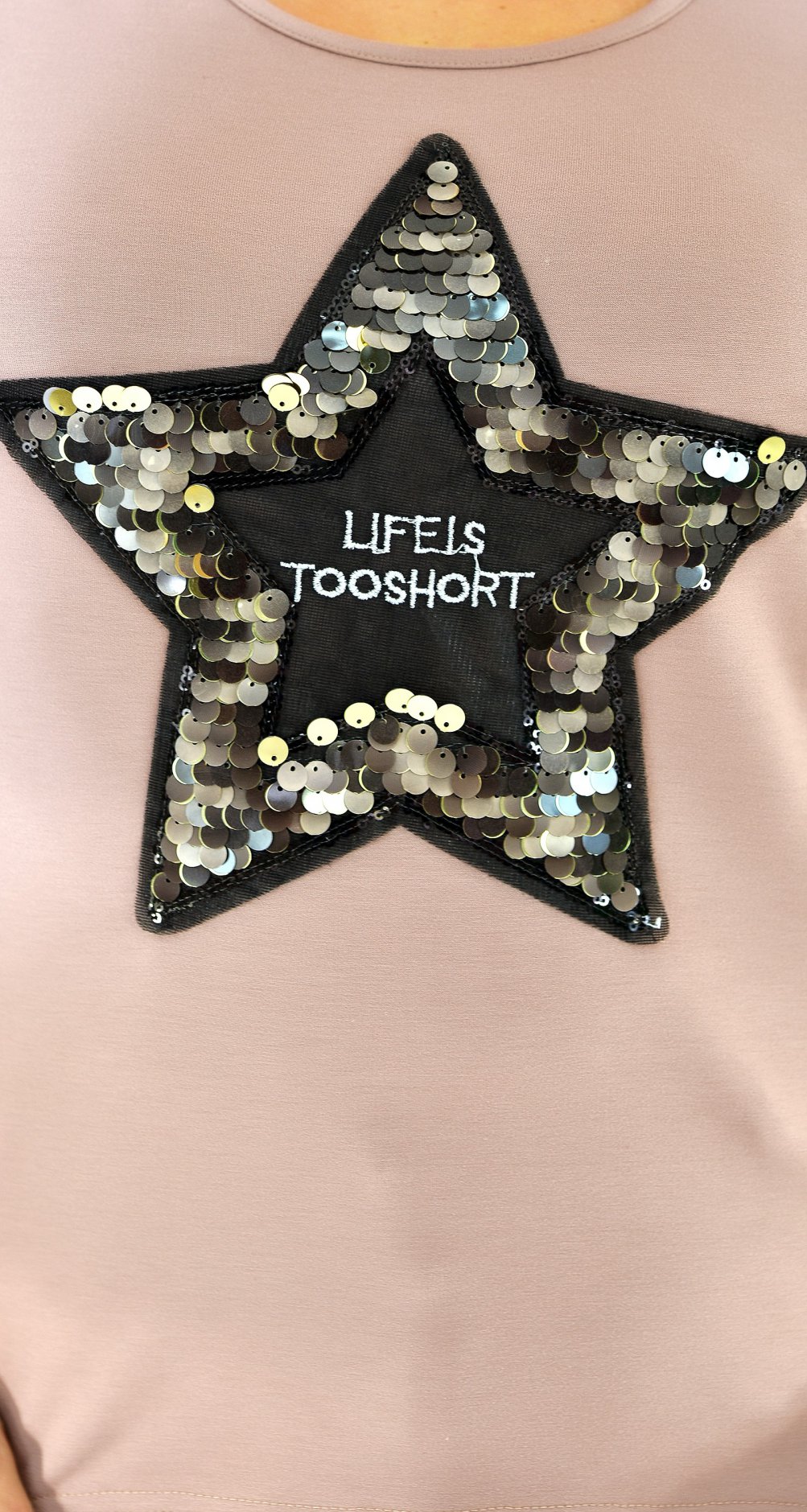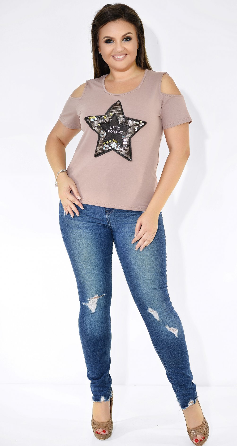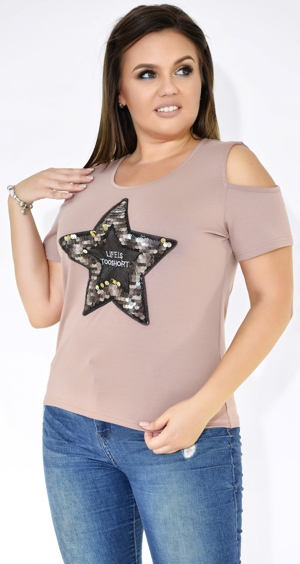 Стильная футболка с отверстиями на плечах и пайетками.