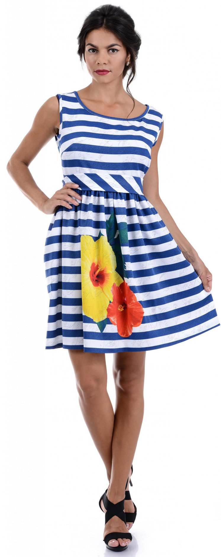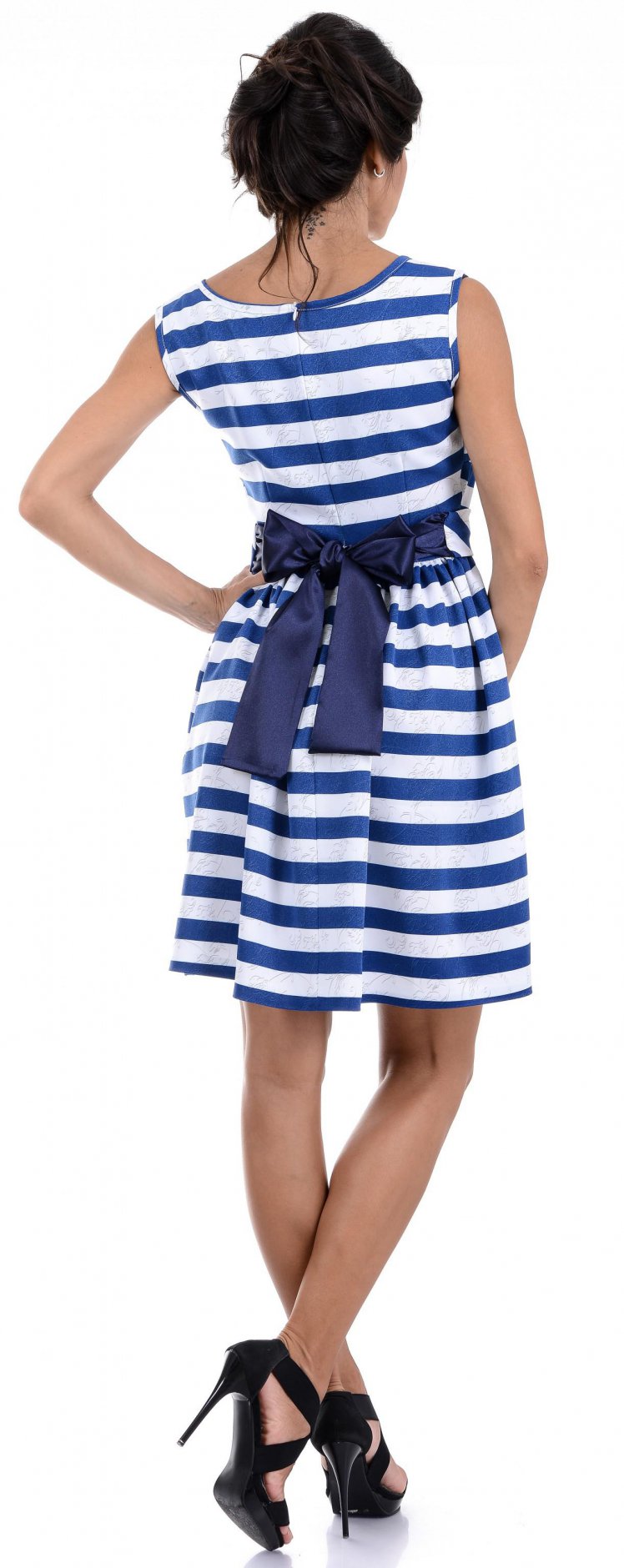 Летнее платье без рукавов в сине-белую полоску с широким поясом.