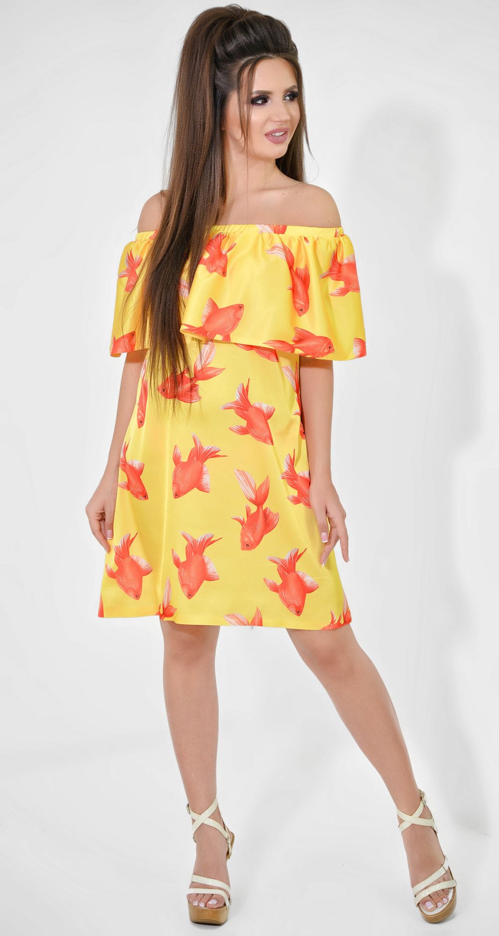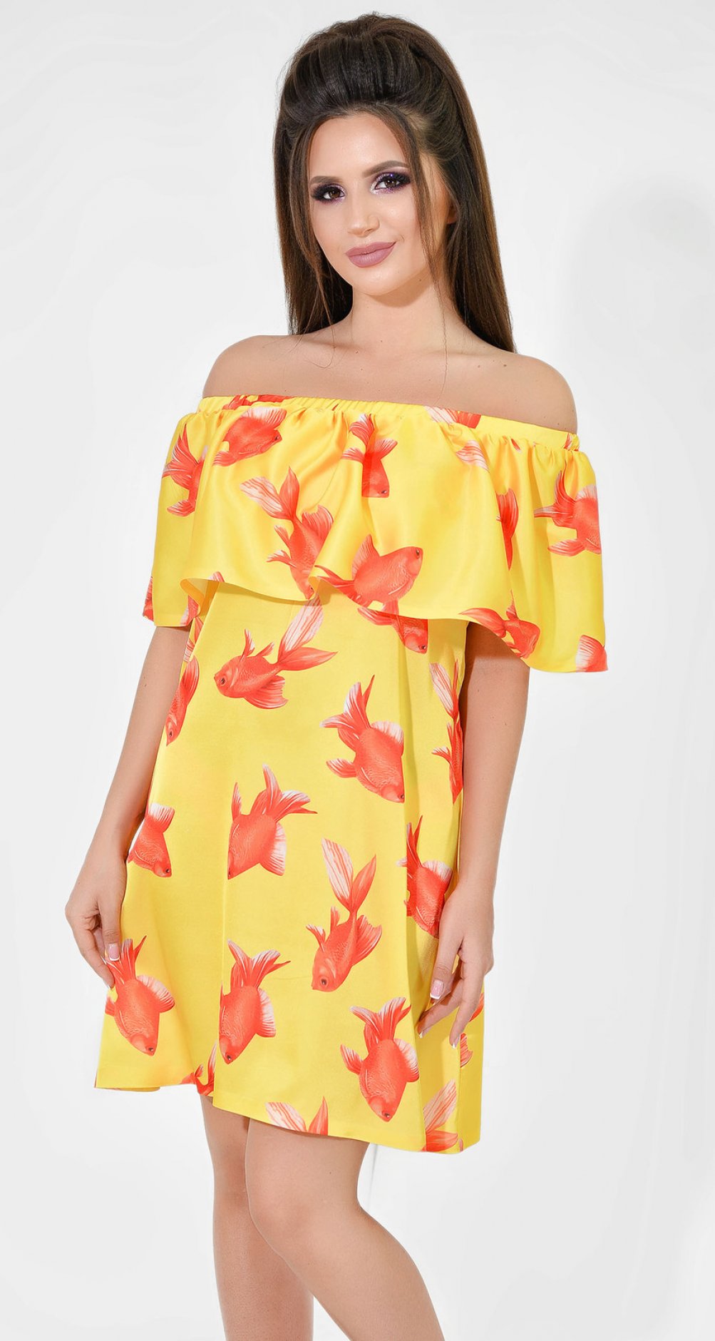 Летнее платье с открытыми плечами и оборкой у ворота.