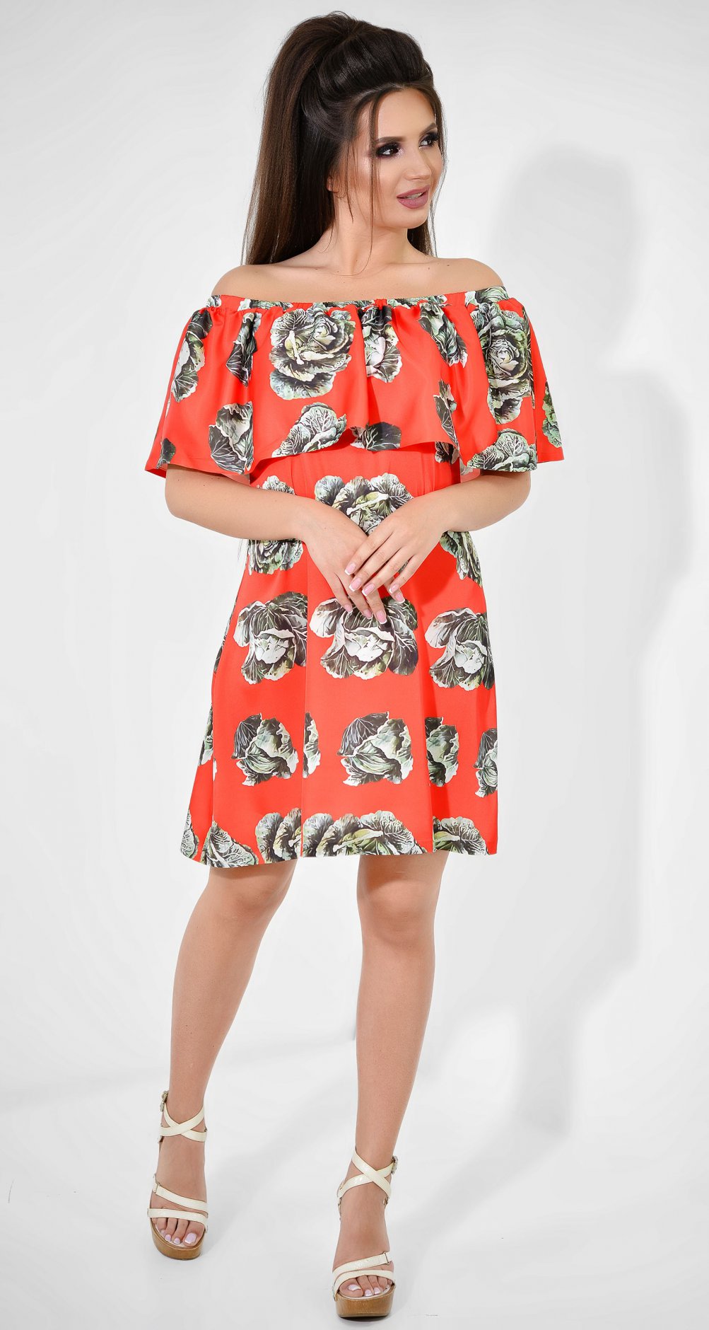 Летнее платье с открытыми плечами и оборкой у ворота.