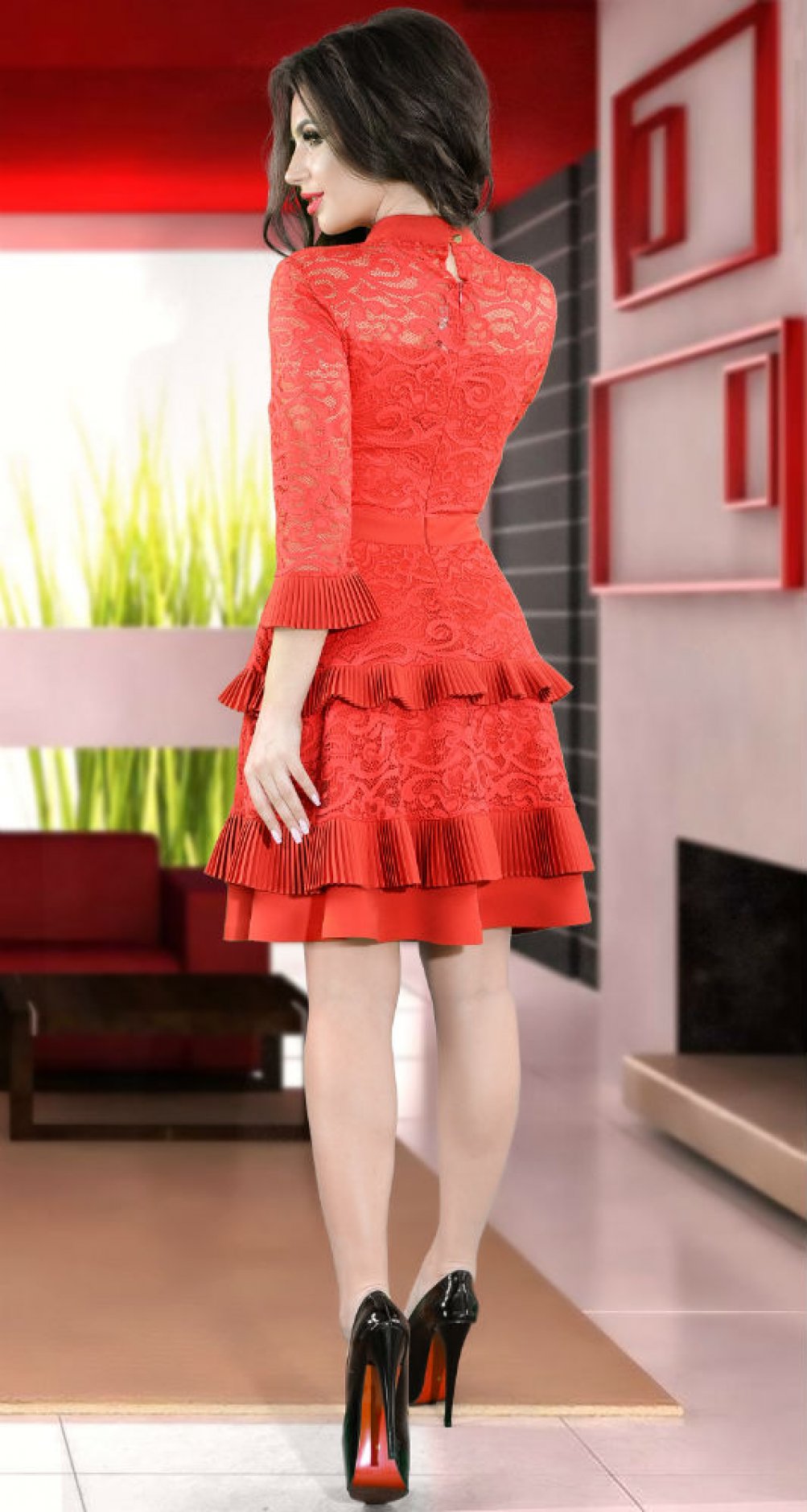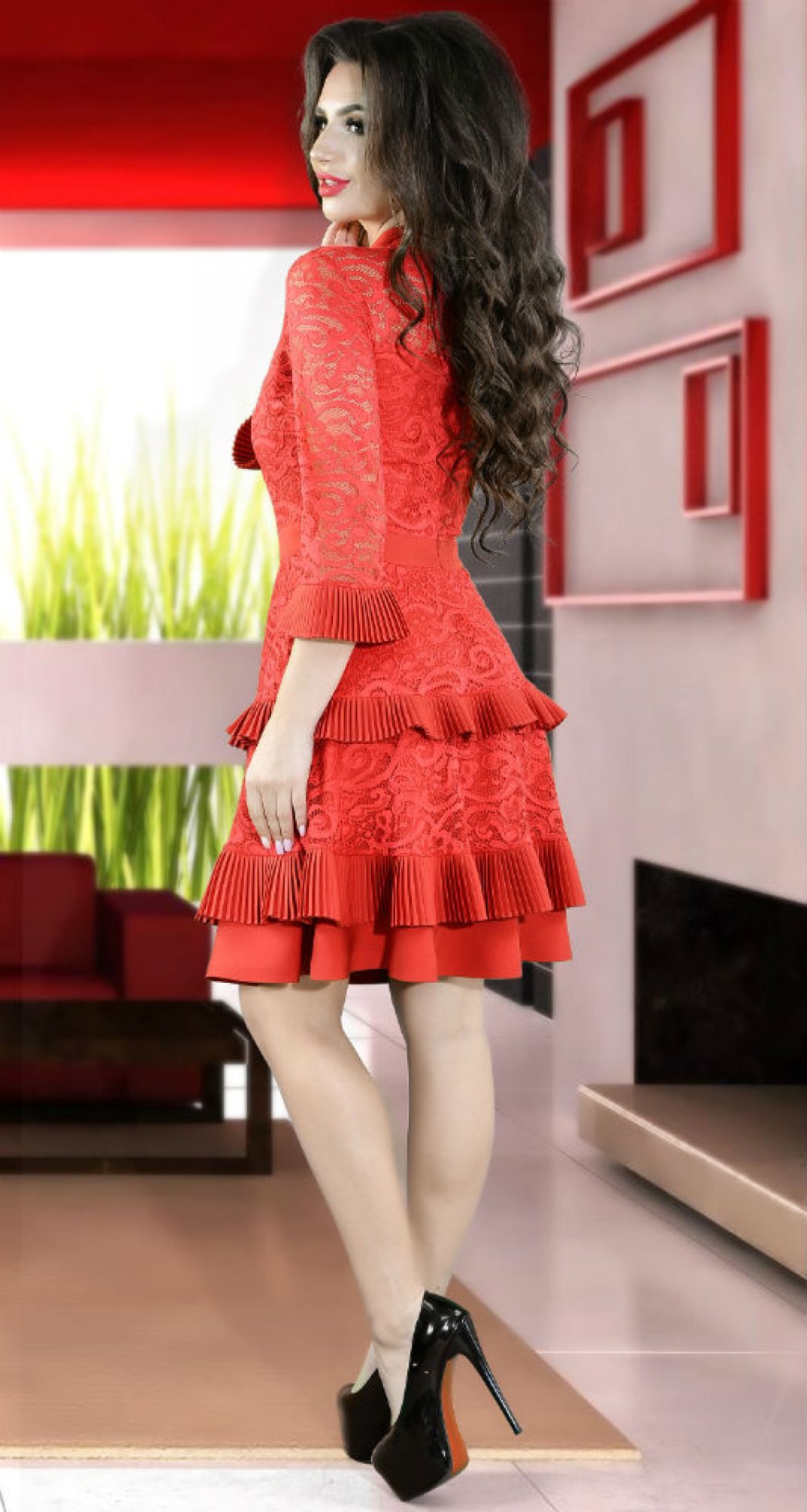 Красивое платье из гипюра с трикотажной подкладкой, дополнено оборками из плиссированной ткани на юбке и рукавах.