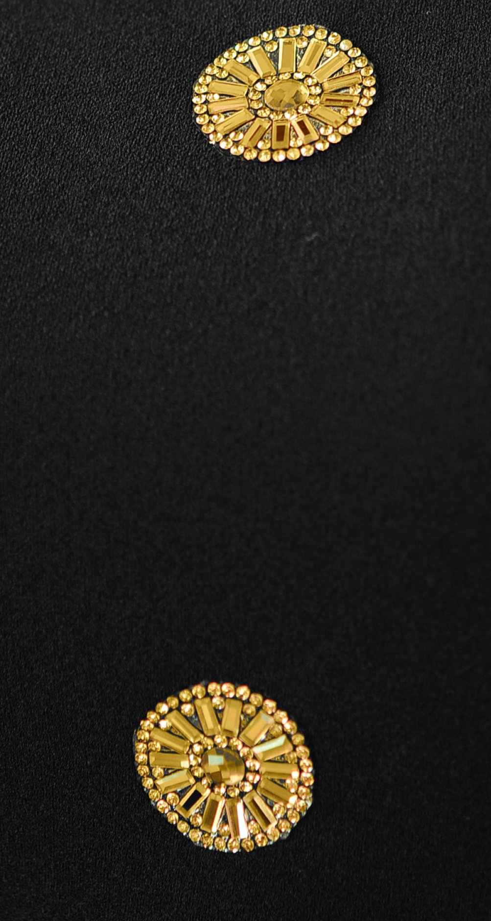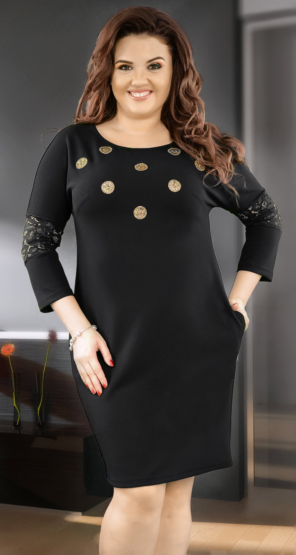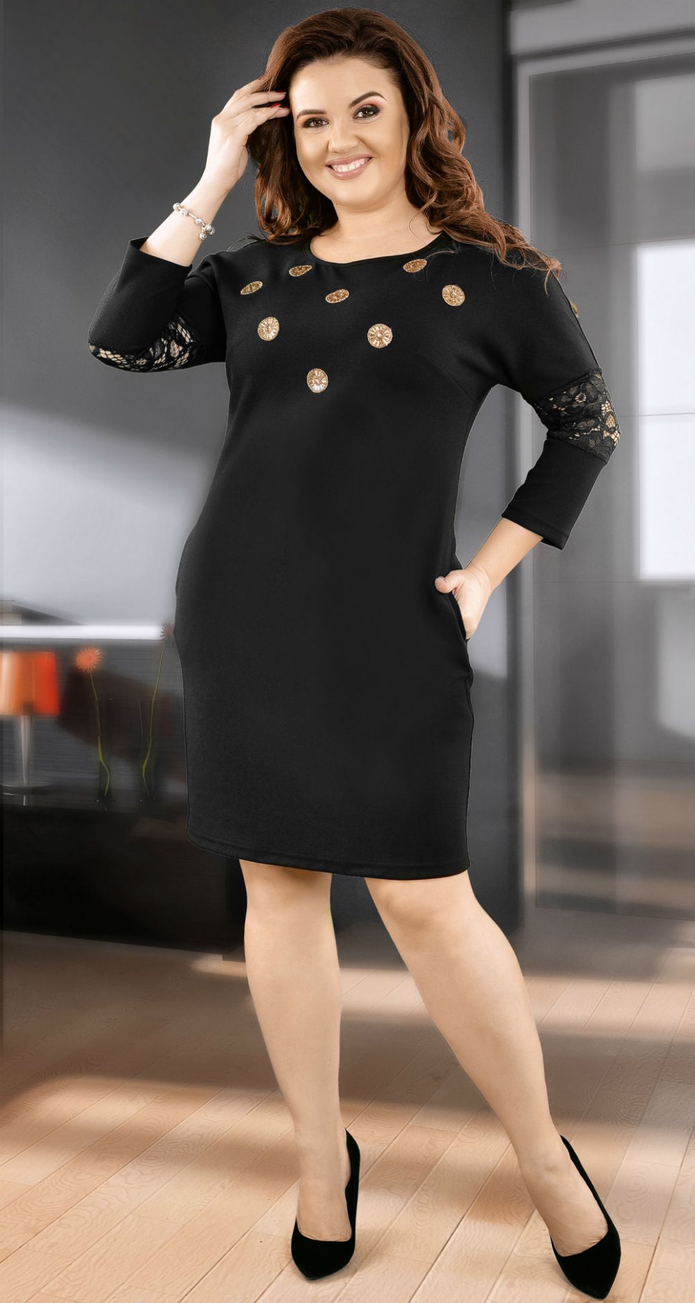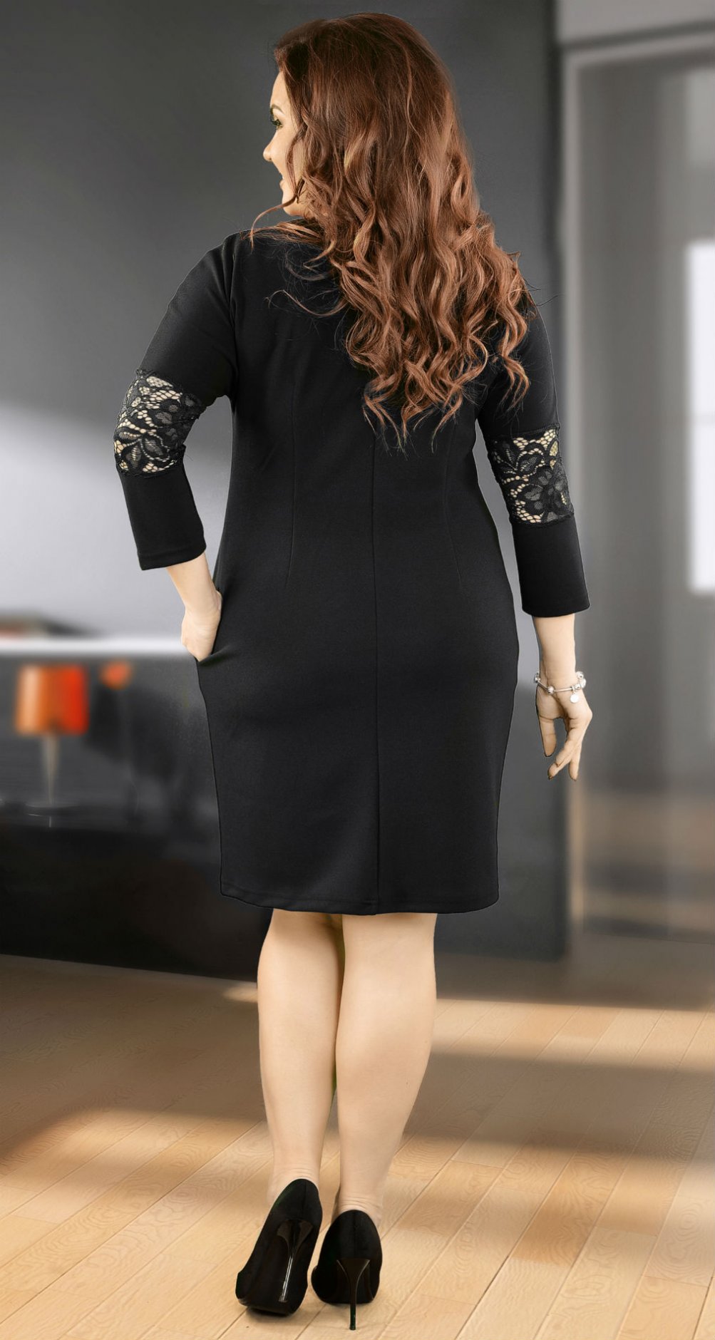 Оформить заказСтильное платье по фигуре выглядит эффектно благодаря декоративным элементам на груди и гипюровым вставкам на рукавах.