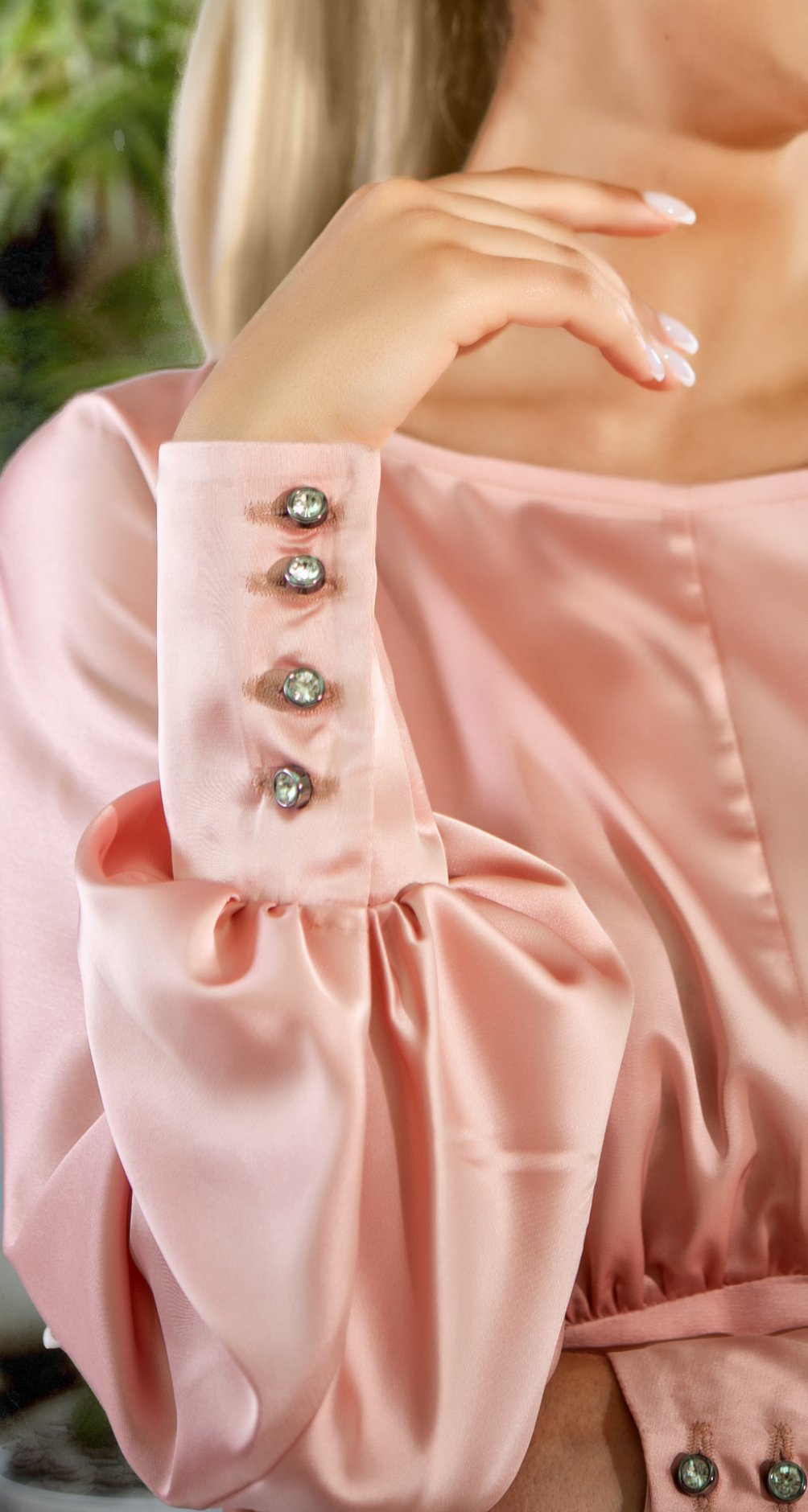 Блузка с лаконичной горловиной и красивыми рукавами! Миниатюрные пуговички с кристаллами украшают манжет.