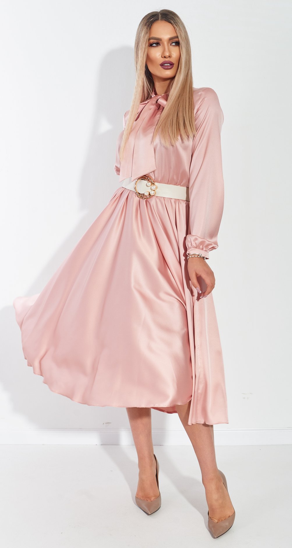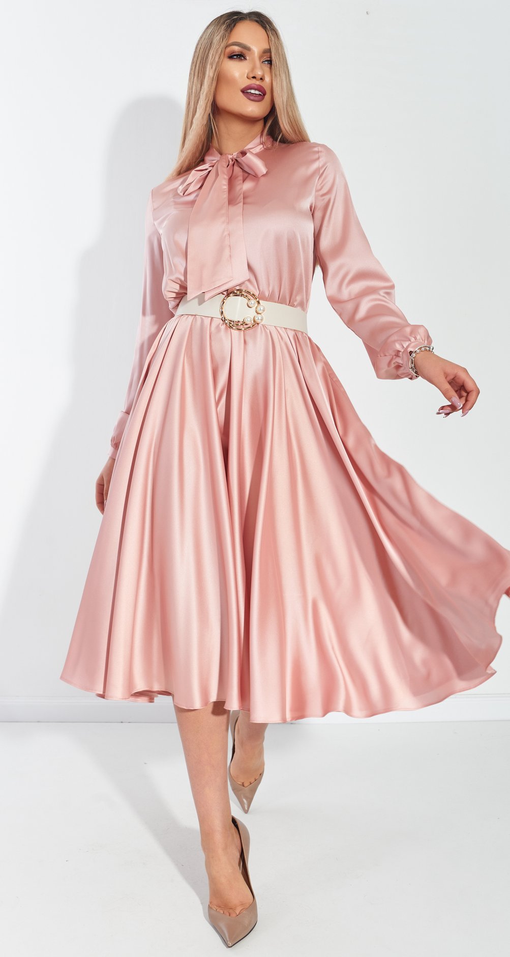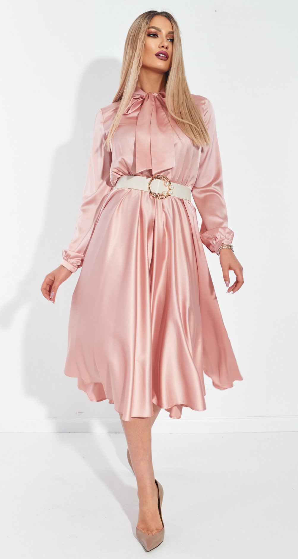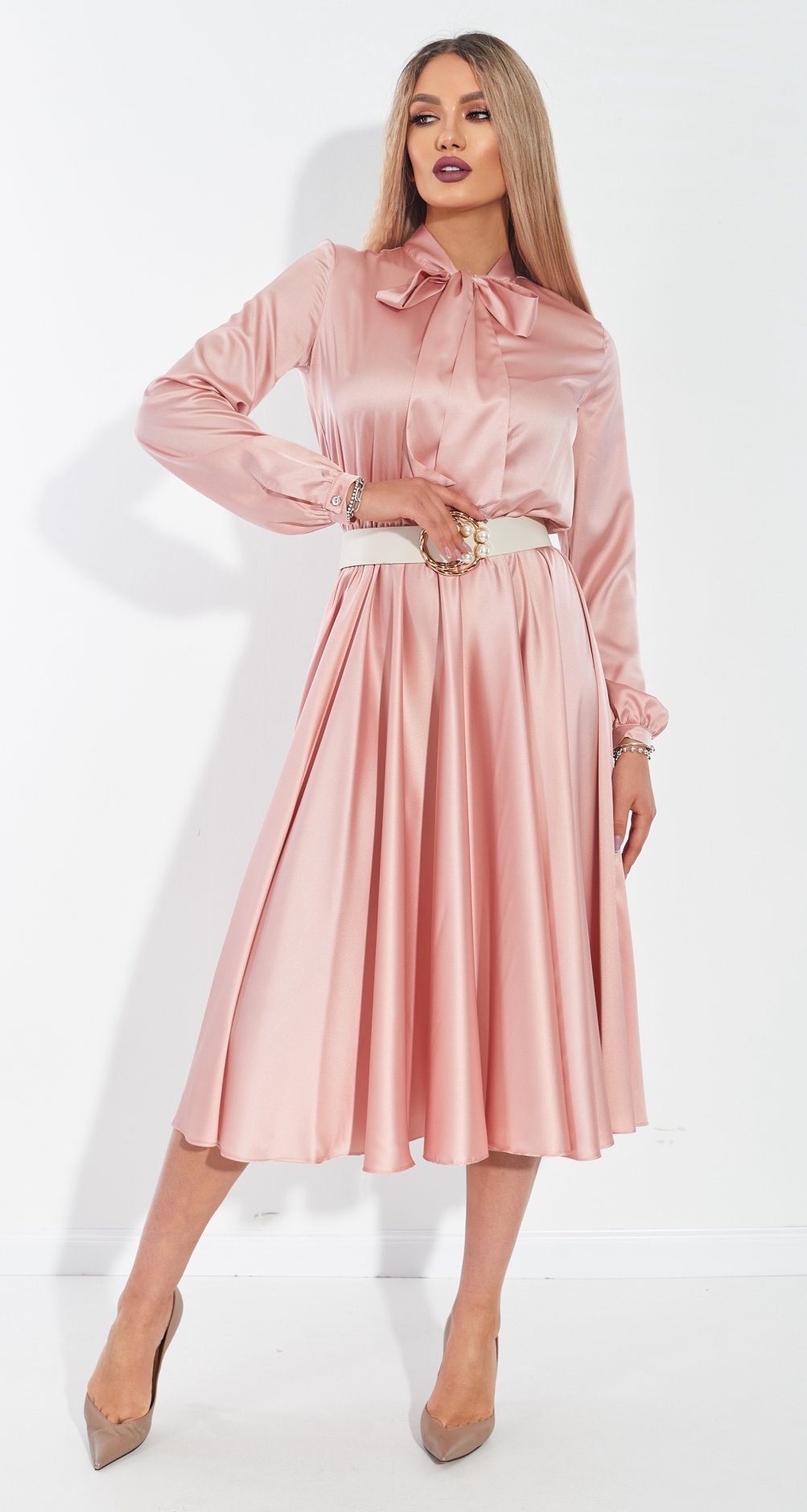 Струящаяся юбка и лаконичный верх с бантом и не большим напуском.