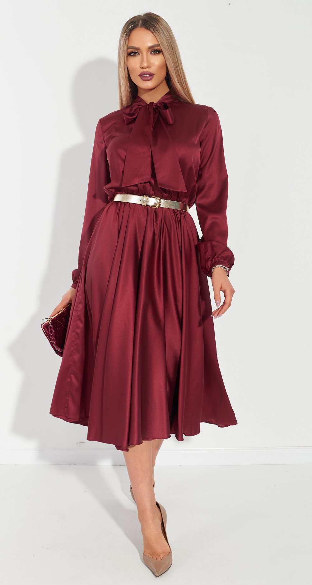 Струящаяся юбка и лаконичный верх с бантом и не большим напуском.