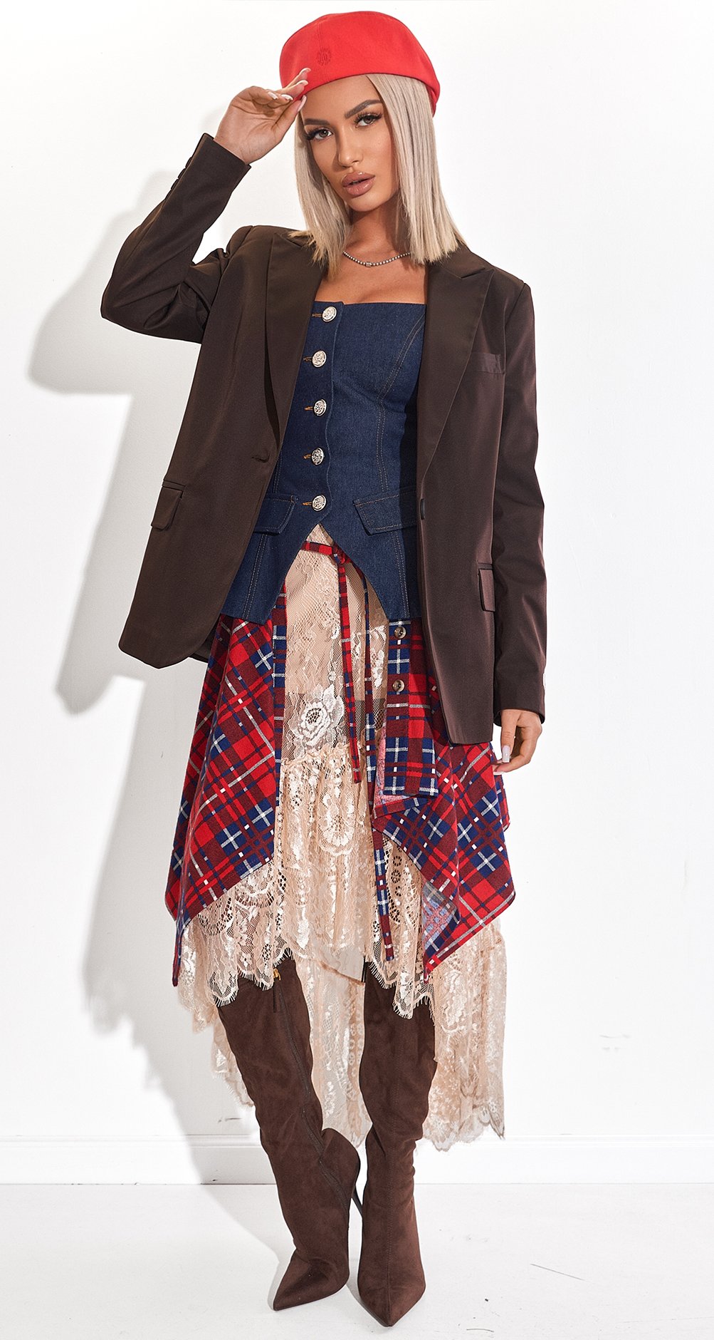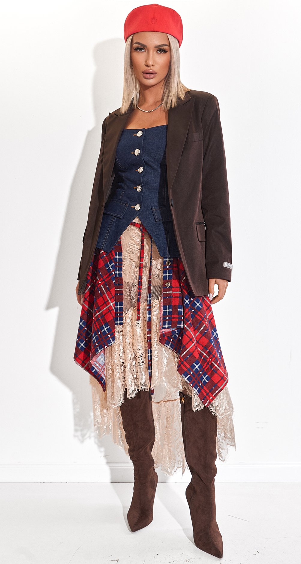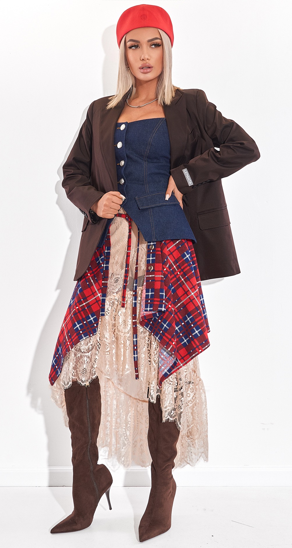 Акцент: Яркая клетка идеально контрастирует с базовыми вещами (джинсовым корсетом и классическим пиджаком), добавляя образ характера и динамики.