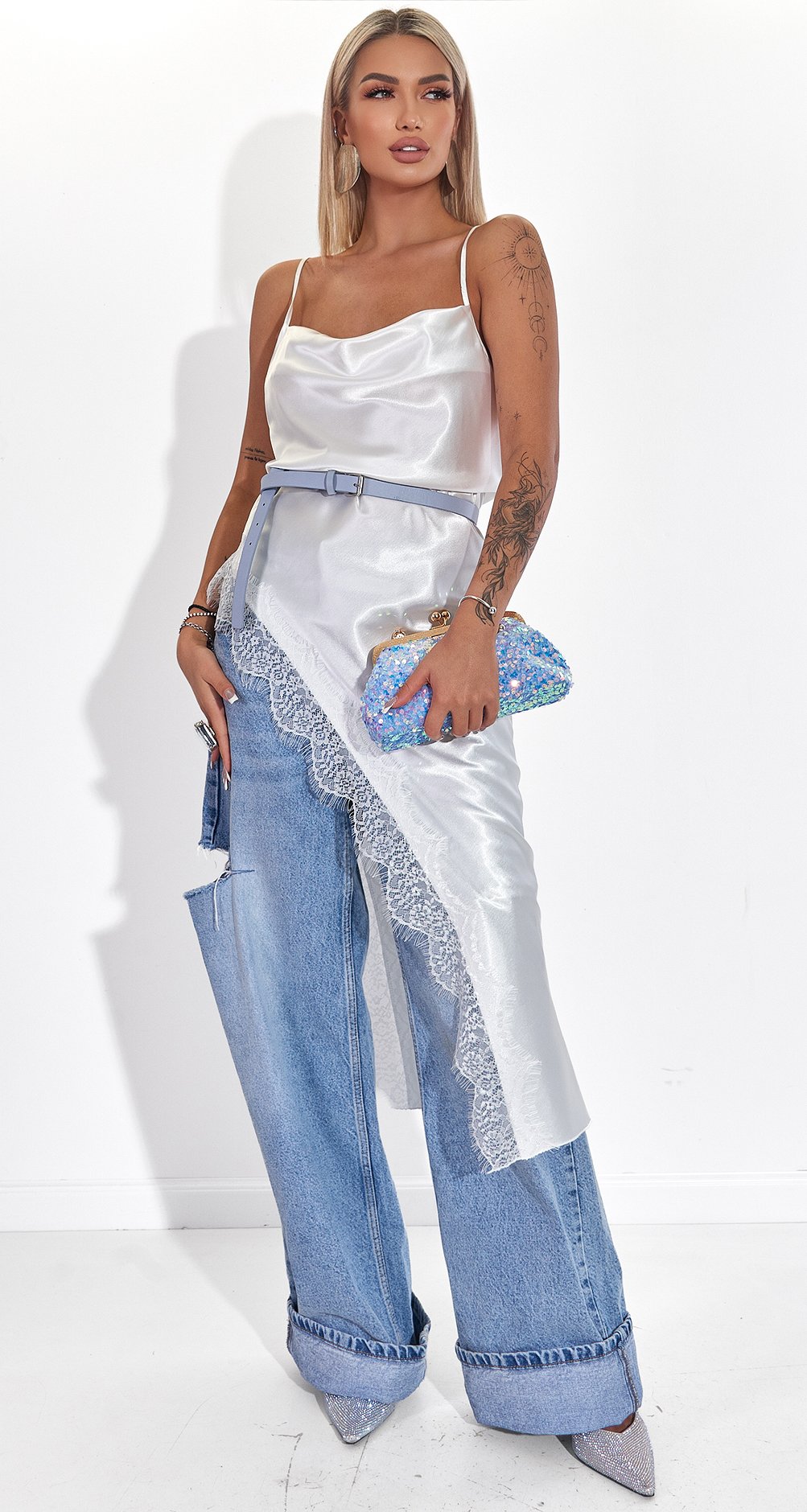 Трендовая Комбинация: Мы взяли роскошь бельевого стиля и перенесли ее на улицу. Носите эту тунику поверх широких джинсов (как на фото), леггинсов или велосипедок – создавайте контрастные и актуальные образы. Под ОВЕР пиджак или свитер.