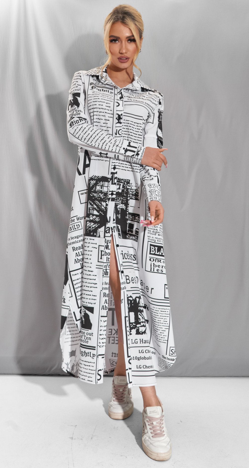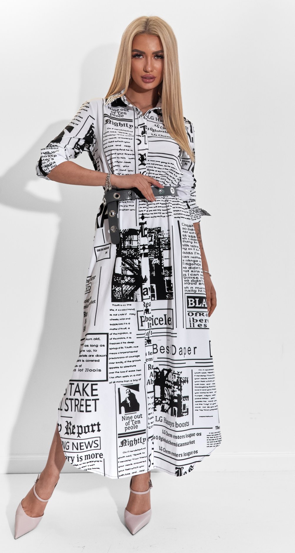 Платье-рубашка с принтом в виде газетного текста — для тех, кто не боится быть в центре внимания. Лёгкая, но непрозрачная ткань, свободный А-силуэт, акцентный воротник и классическая застёжка на пуговицы — идеальный баланс тренда и комфорта. Добавь грубые ботинки или каблуки — и образ готов!