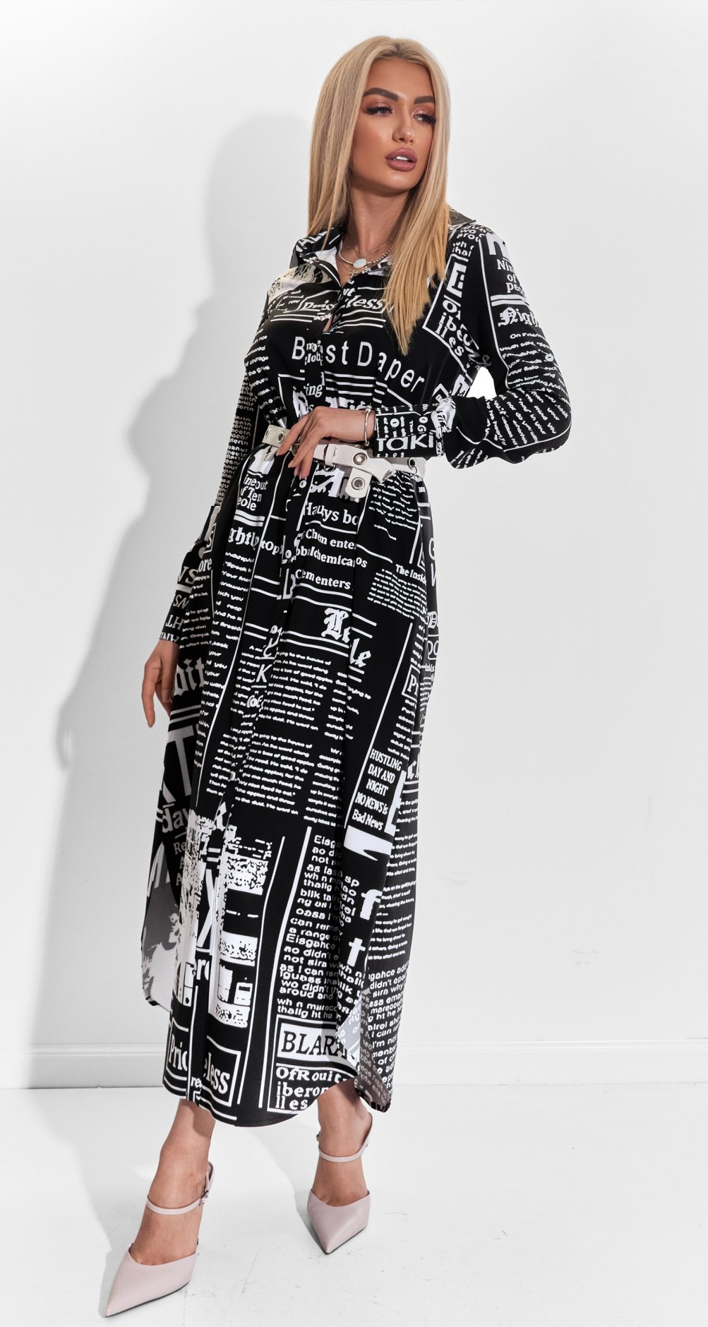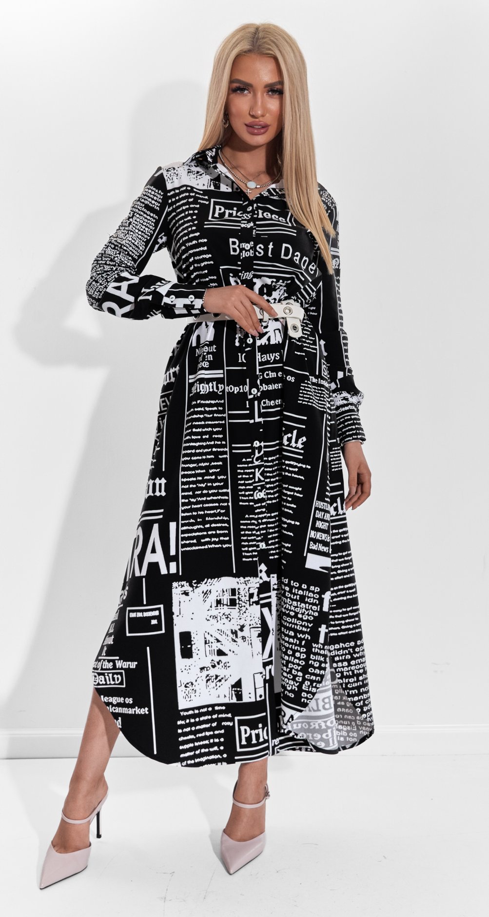 Платье-рубашка с принтом в виде газетного текста — для тех, кто не боится быть в центре внимания. Лёгкая, но непрозрачная ткань, свободный А-силуэт, акцентный воротник и классическая застёжка на пуговицы — идеальный баланс тренда и комфорта. Добавь грубые ботинки или каблуки — и образ готов!