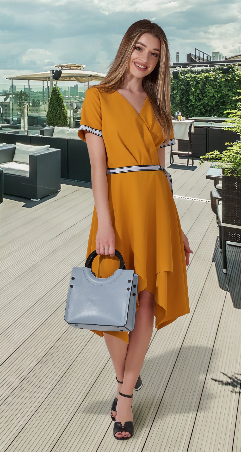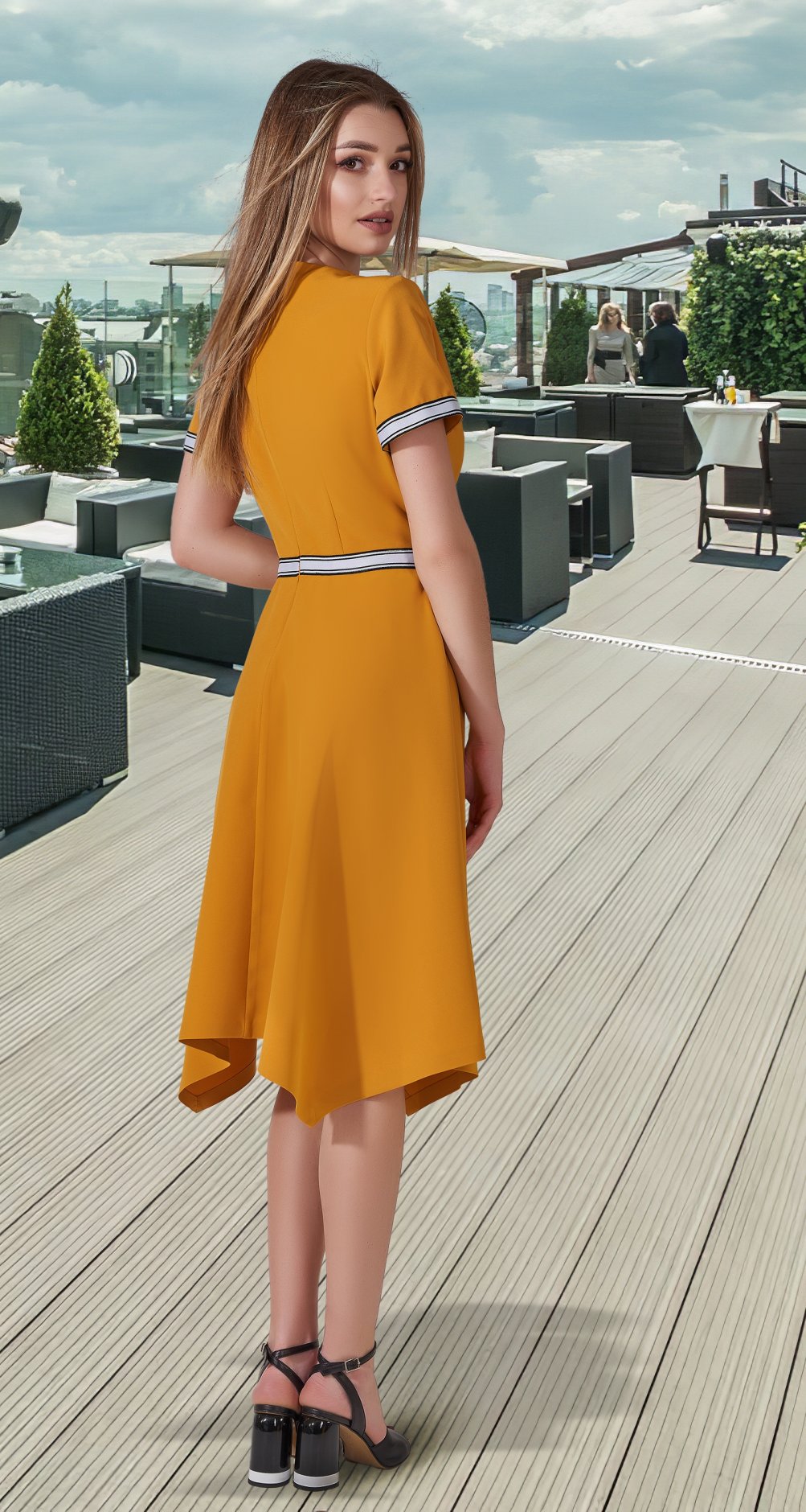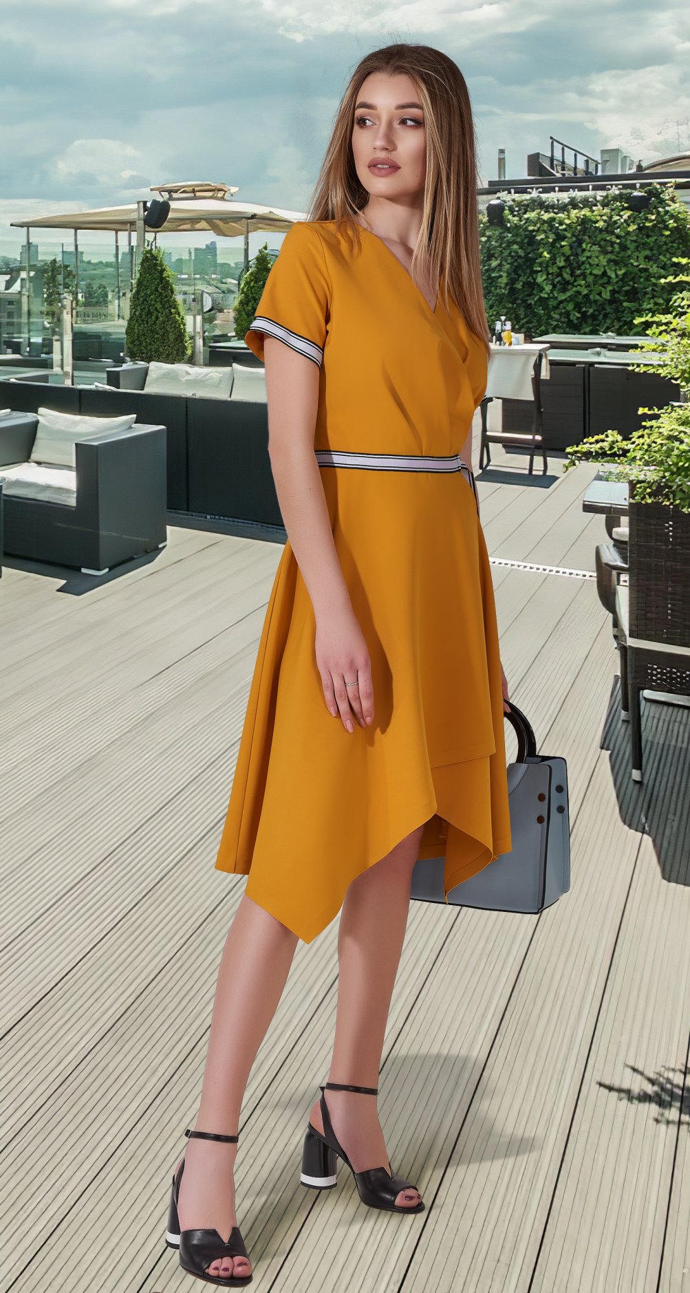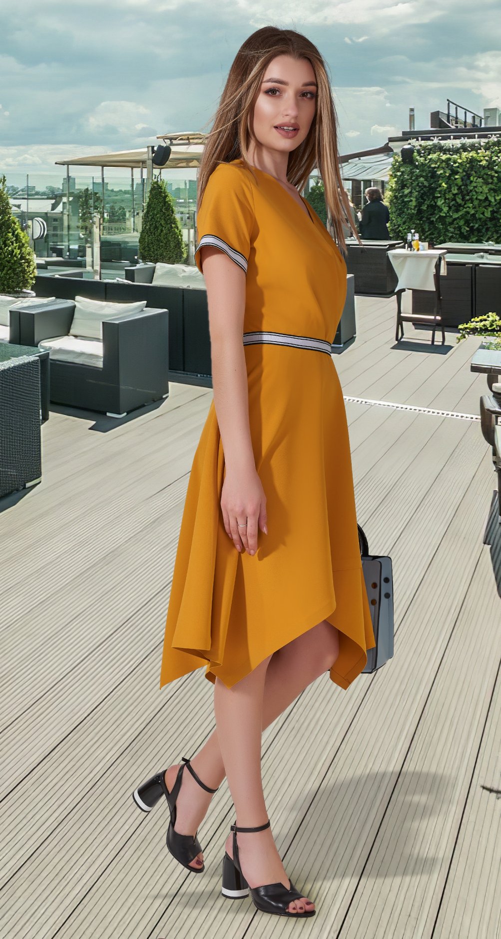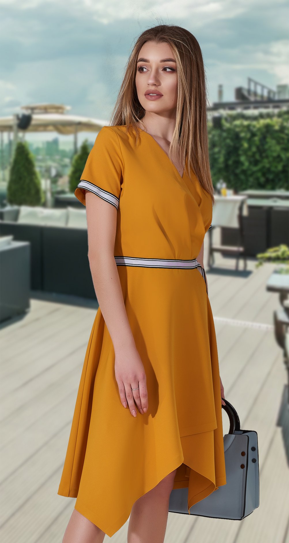 Стильное, модное платье с асимметричным низом юбочки.