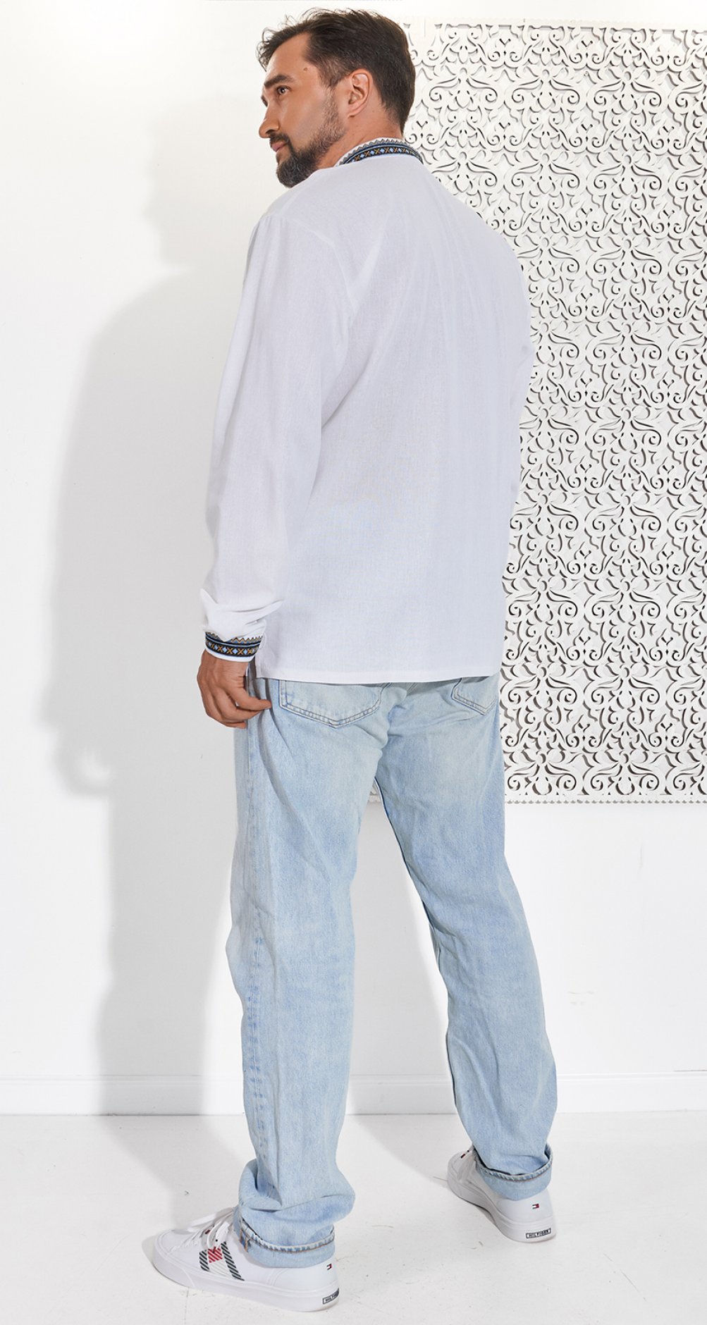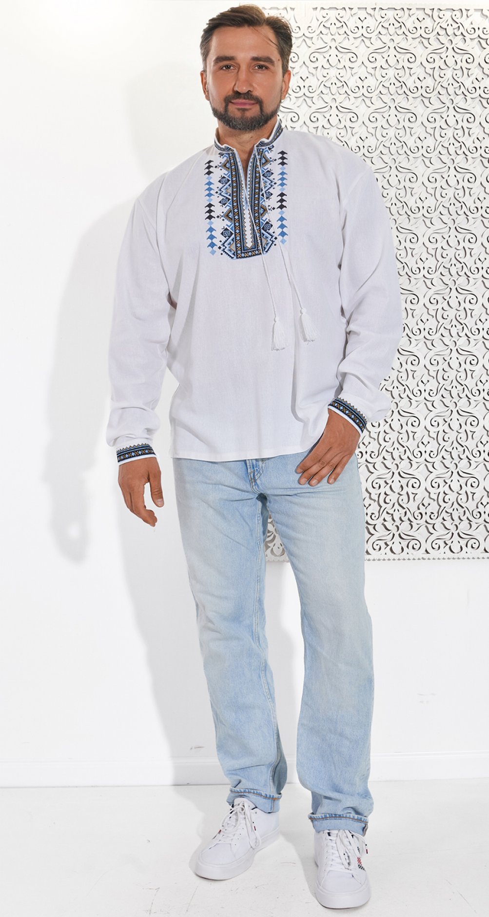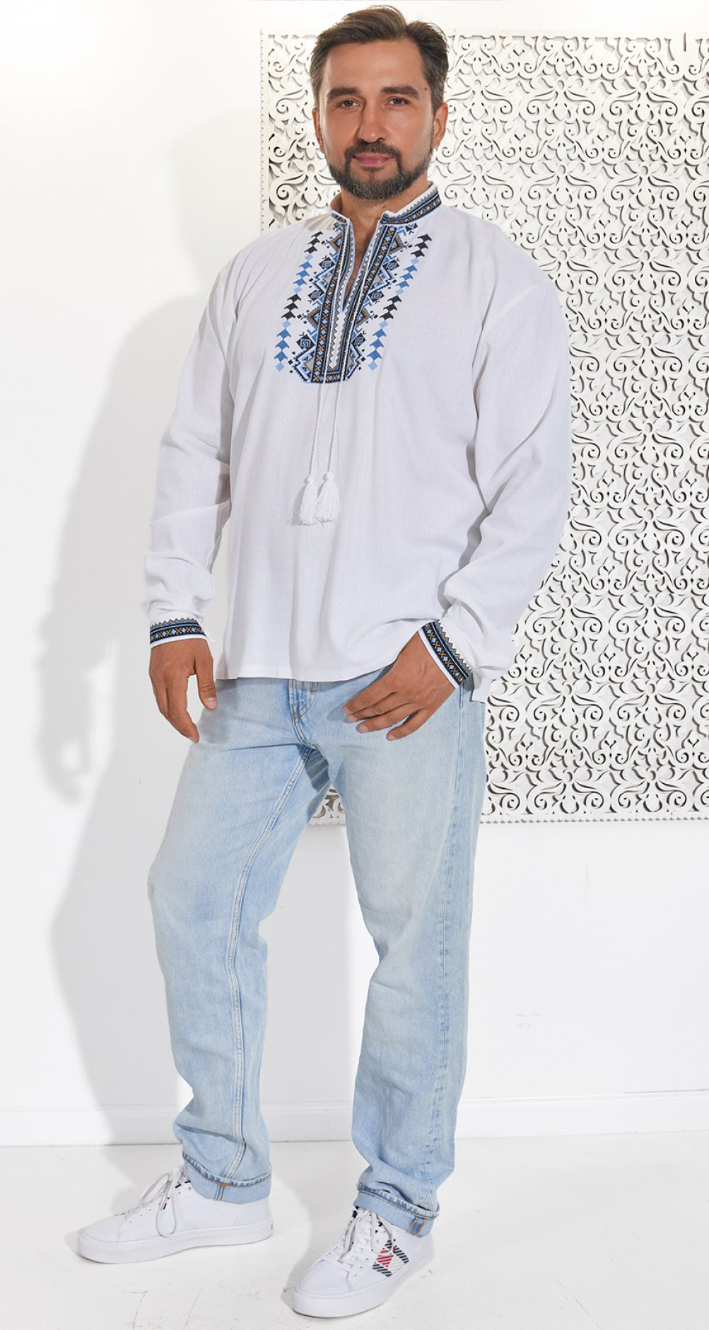 * Изысканная вышивка: Уникальный геометрический узор в синих и черных тонах украшает воротник, манжеты и переднюю часть вышиванки. Он придает ей особый шарм и выделяет из толпы.