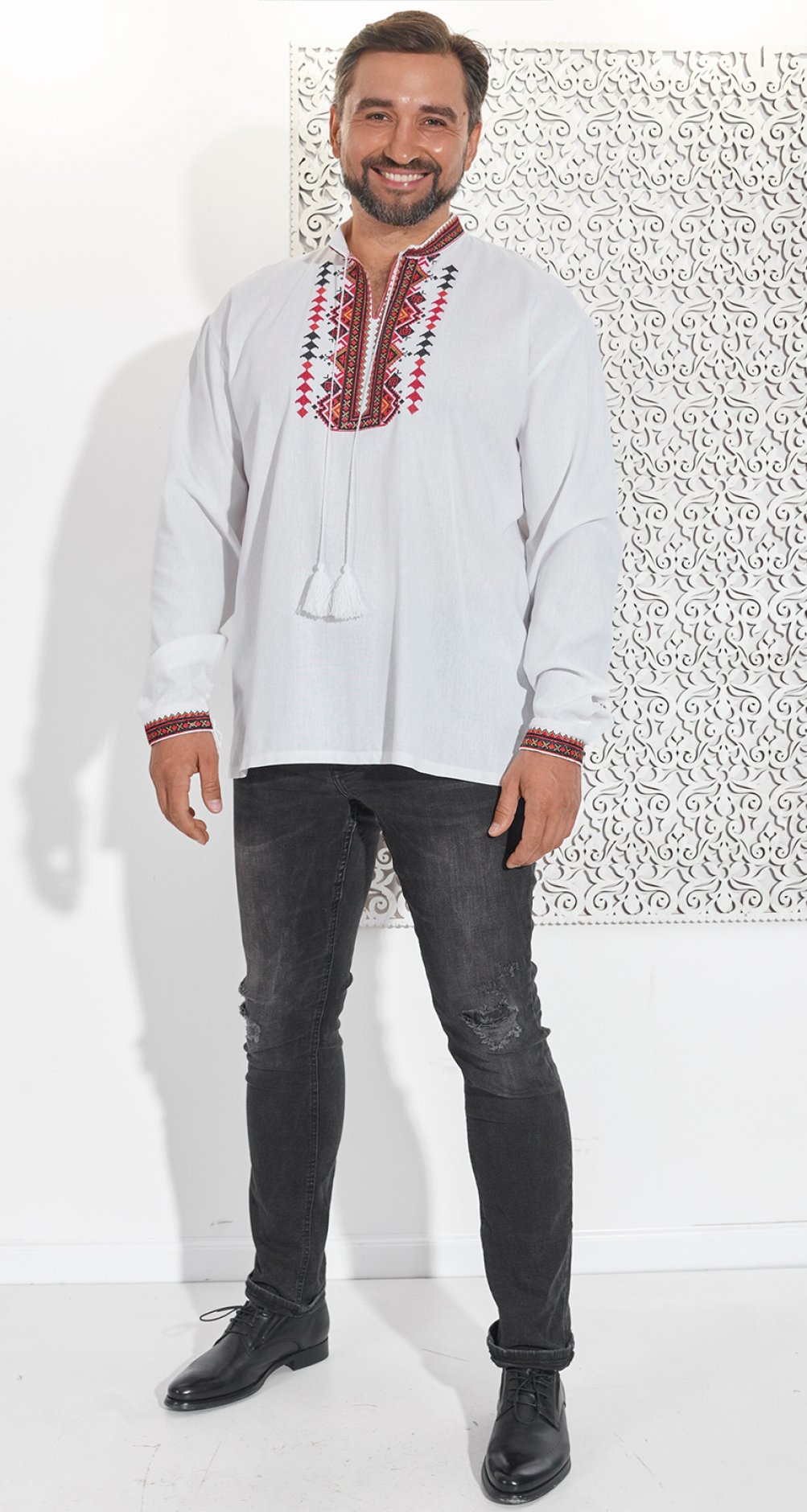 * Изысканная вышивка: Уникальный геометрический узор в красных и черных тонах украшает воротник, манжеты и переднюю часть вышиванки. Он придает ей особый шарм и выделяет из толпы.