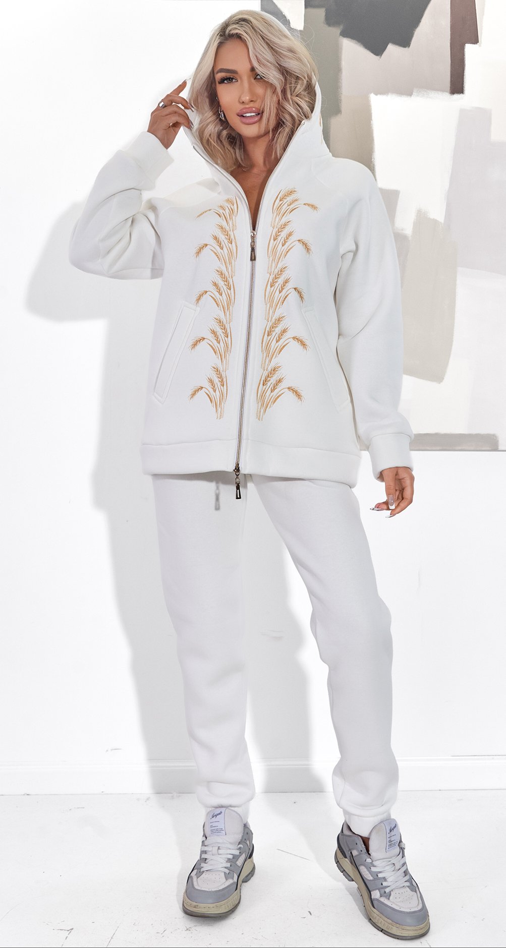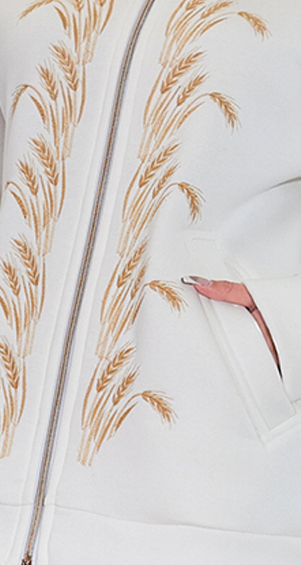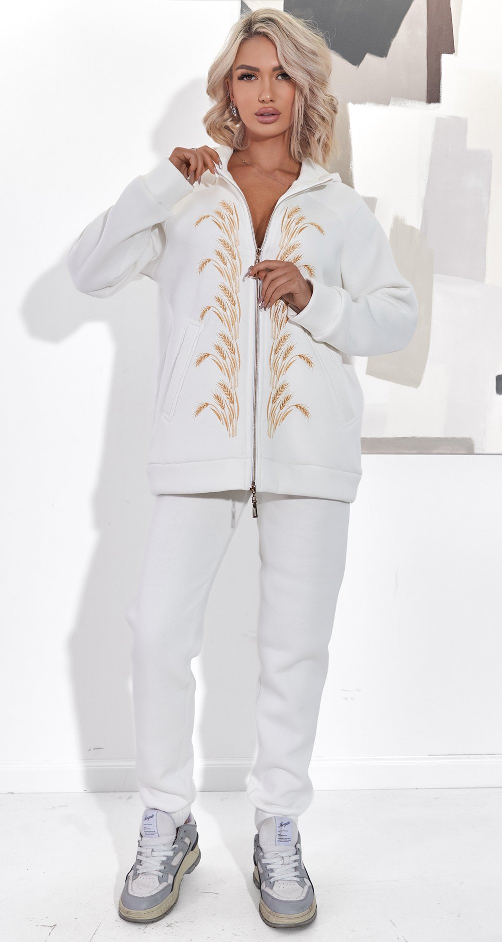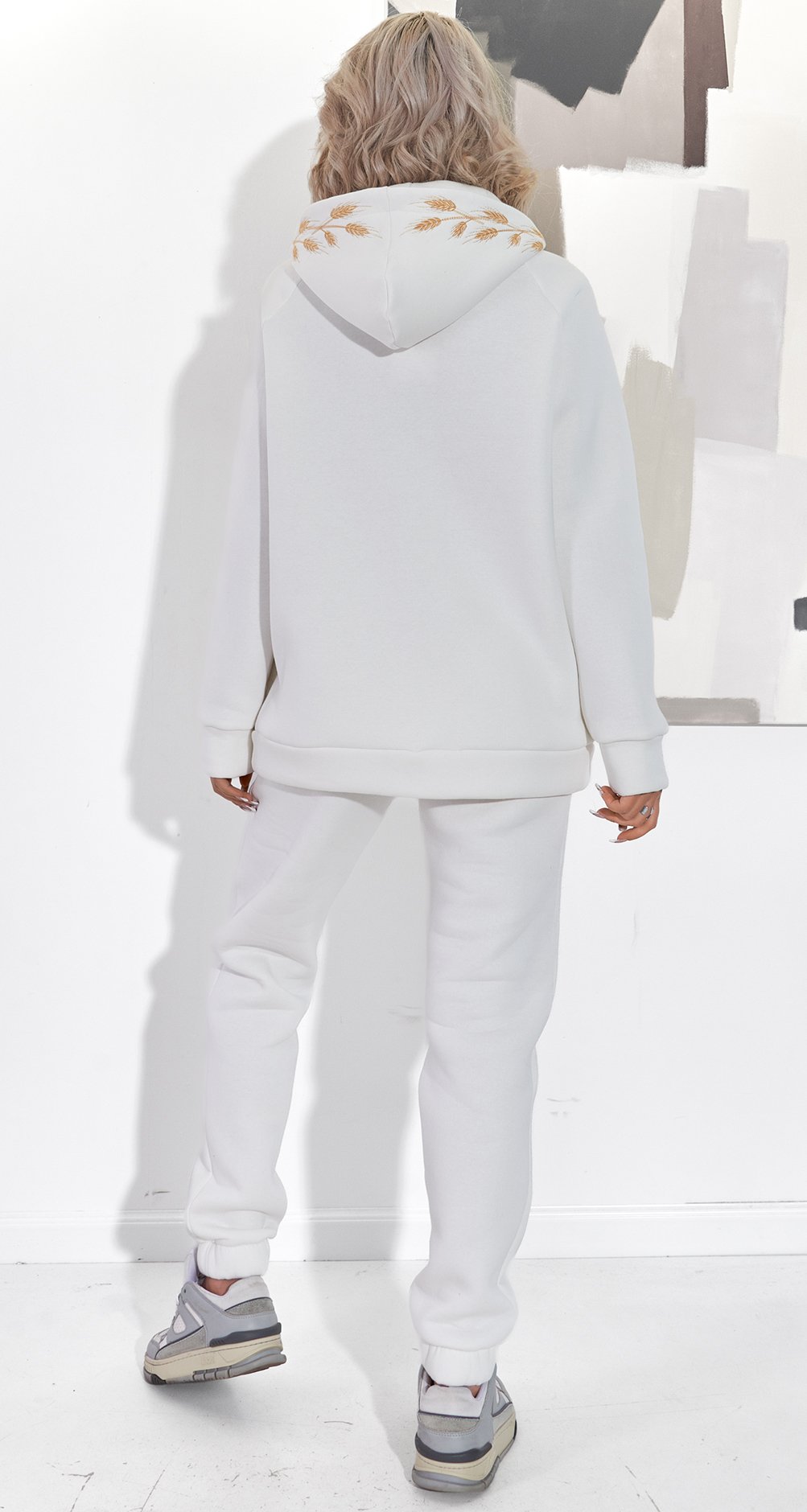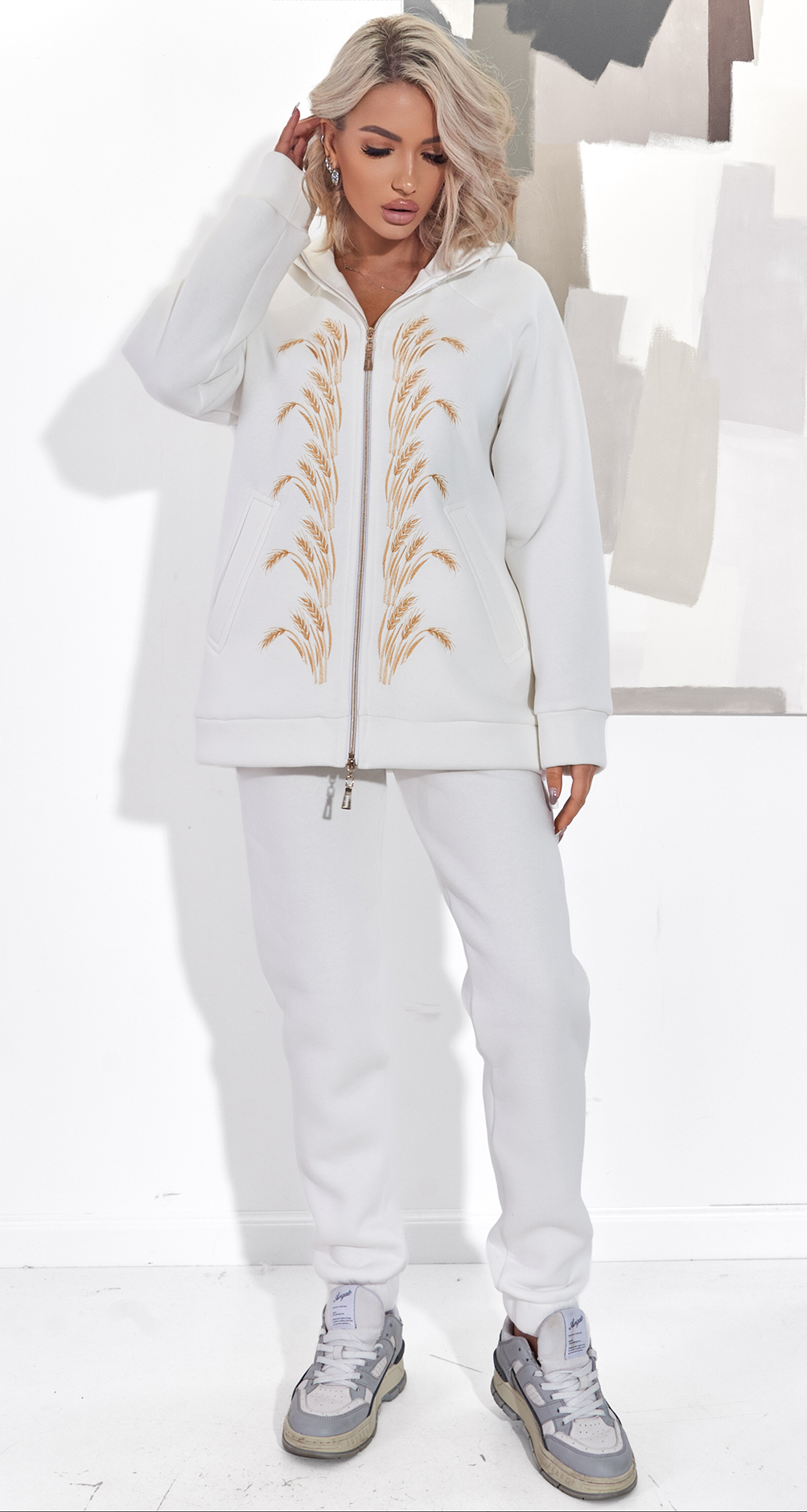 Уникальная Вышивка: Центральный акцент – изящная вышивка в виде золотых колосьев на худи. Этот символичный и стильный элемент придает костюму особую элегантность и национальный шарм.