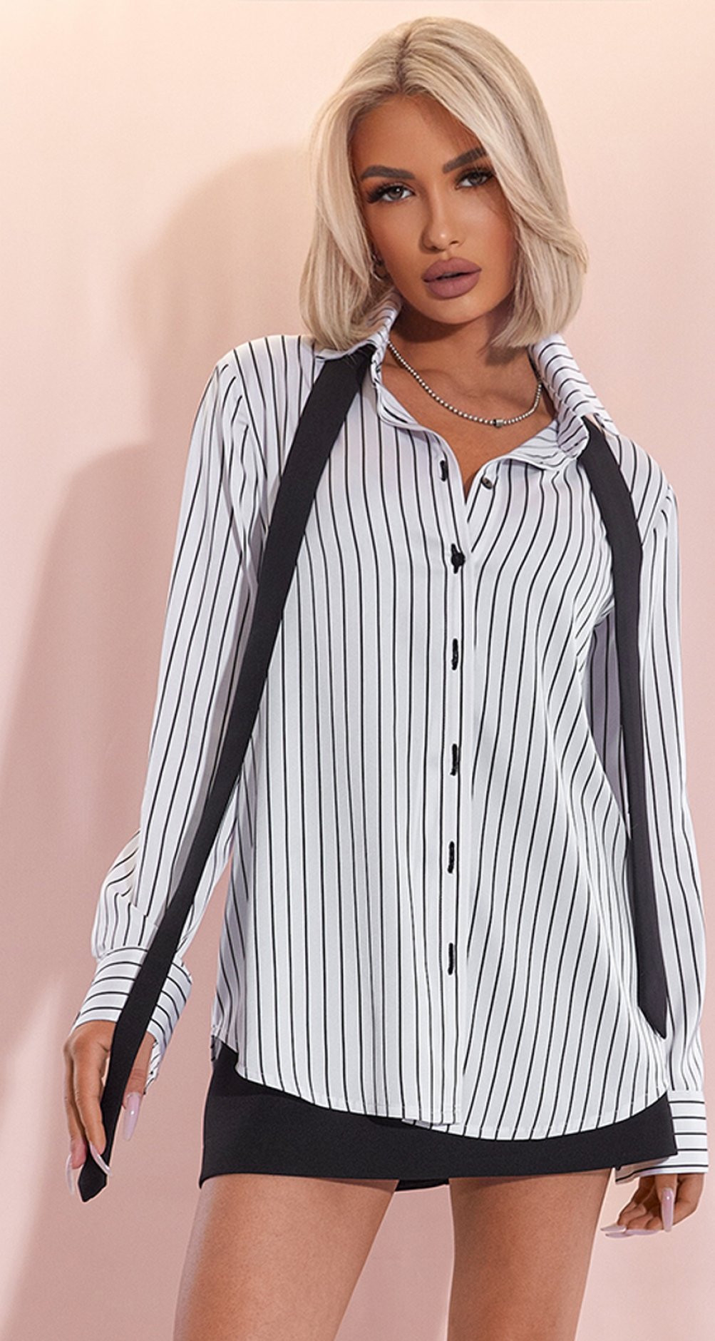 Ищете, что надеть в офис, на деловую встречу или на стильный ужин? Наша женская блузка в полоску – это универсальное решение! Тонкие вертикальные полоски визуально вытягивают силуэт, придавая вам стройность и изящество. Классический крой и элегантный воротник с завязкой-галстуком (или без него – на ваш выбор!) подчеркнут ваш безупречный вкус.