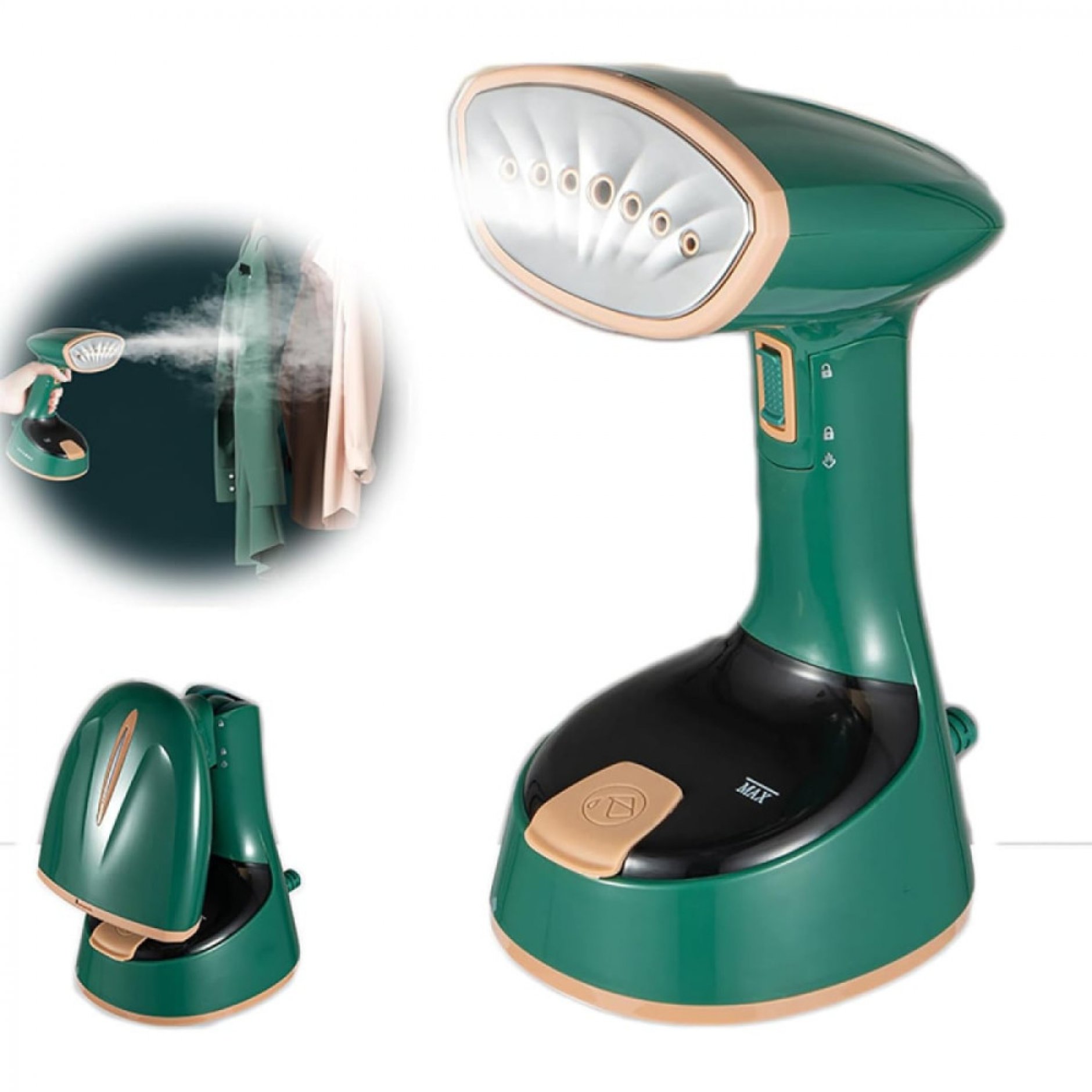 Вертикальные парогенераторы являются сильными конкурентами паровым утюгам, позволяя быстро гладить любые швейные или текстильные изделия. Ручной парогенератор является более функциональным устройством по сравнению с утюгом. Кроме отпаривания и глажки одежды, он позволяет отпаривать шторы, обивку мебели, матрасы и кровати, одновременно уничтожая пылевых клещей и микроорганизмы. Для более эффективной очистки можно установить щетку для удаления ворса.