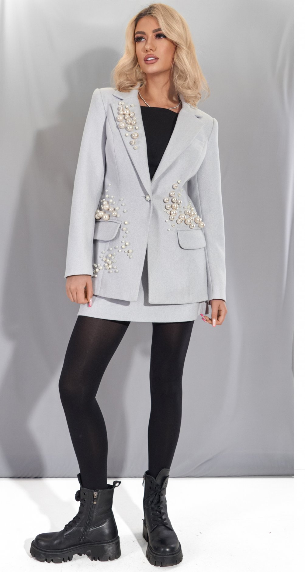 Эффектный костюм из тонкого кашемира — идеальный союз комфорта и элегантности. Жемчужный декор подчёркивает трендовость и добавляет нотку изысканности в каждый образ. Удлинённый жакет и мини-юбка создают стильный силуэт, в котором ты точно не останешься без внимания. Идеально для тех, кто любит сочетать классику с модными акцентами.